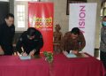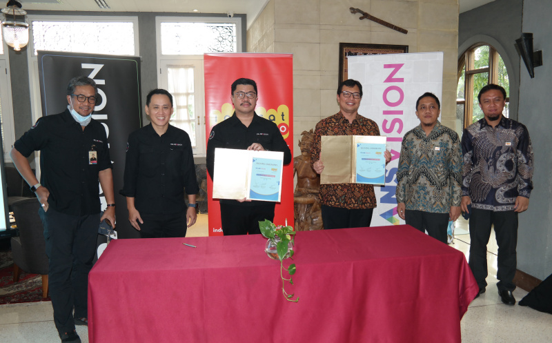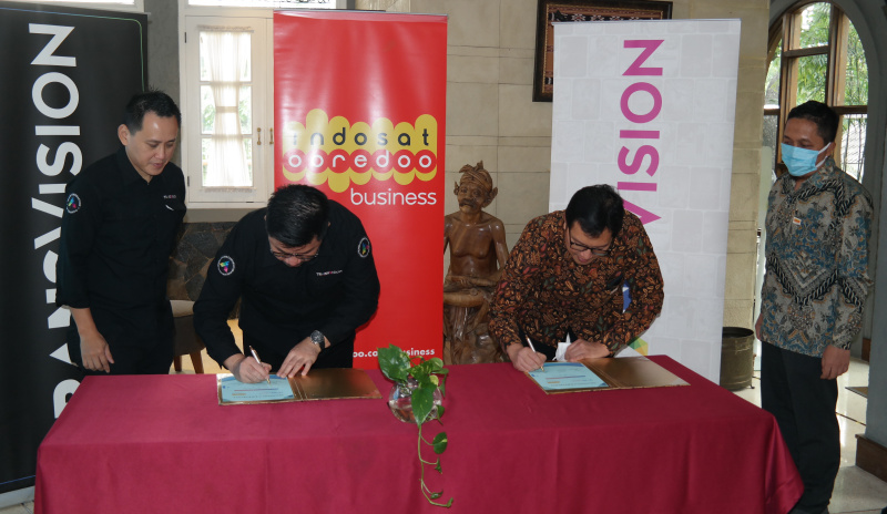 Tampak pada gambar Bayu Hanantasena, Chief Business Officer Indosat Ooredoo (tiga dari kanan) dan Brando Tengdom, Direktur Marketing & Sales Transvision (tiga dari kiri) setelah signing ceeremony di Jakarta (22/7).