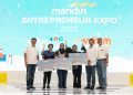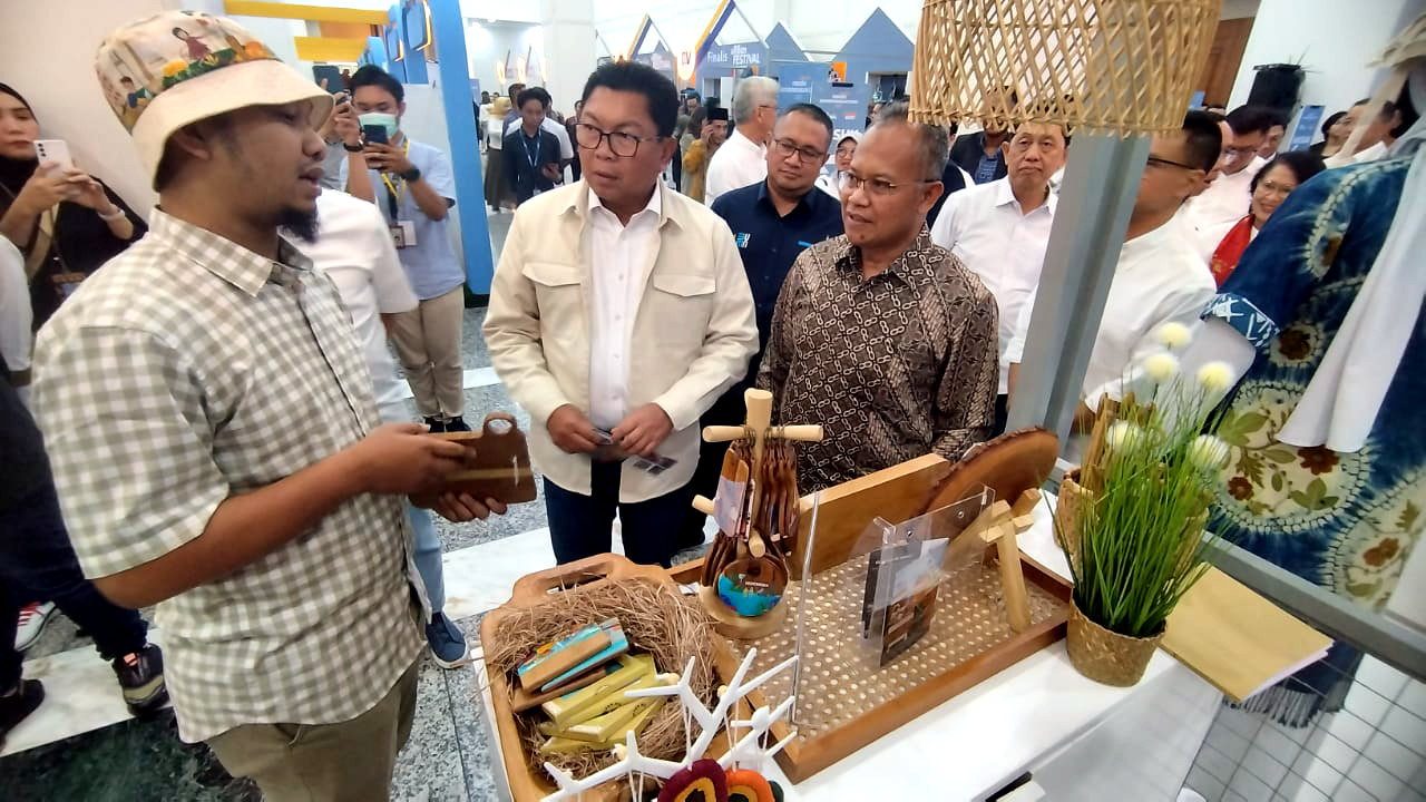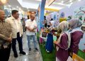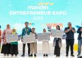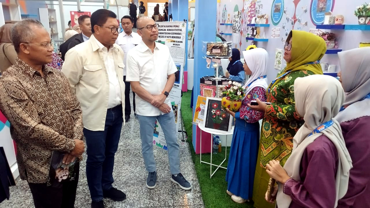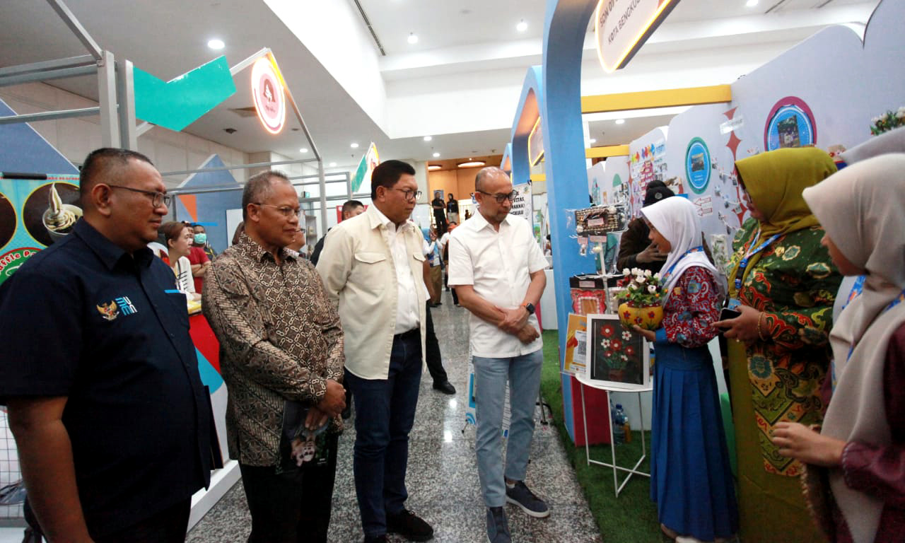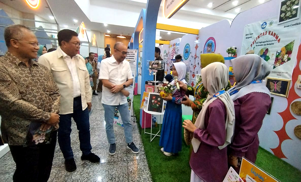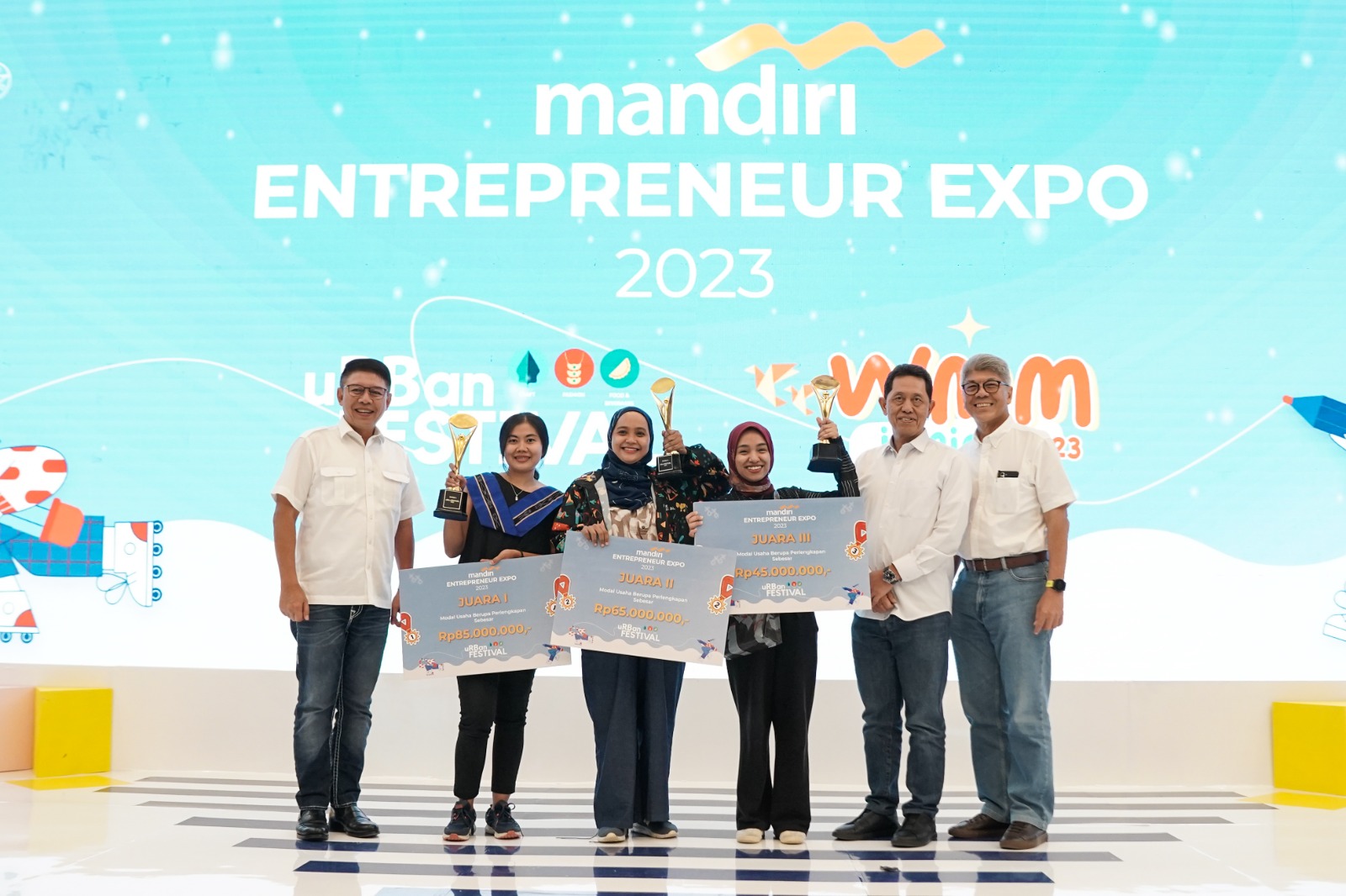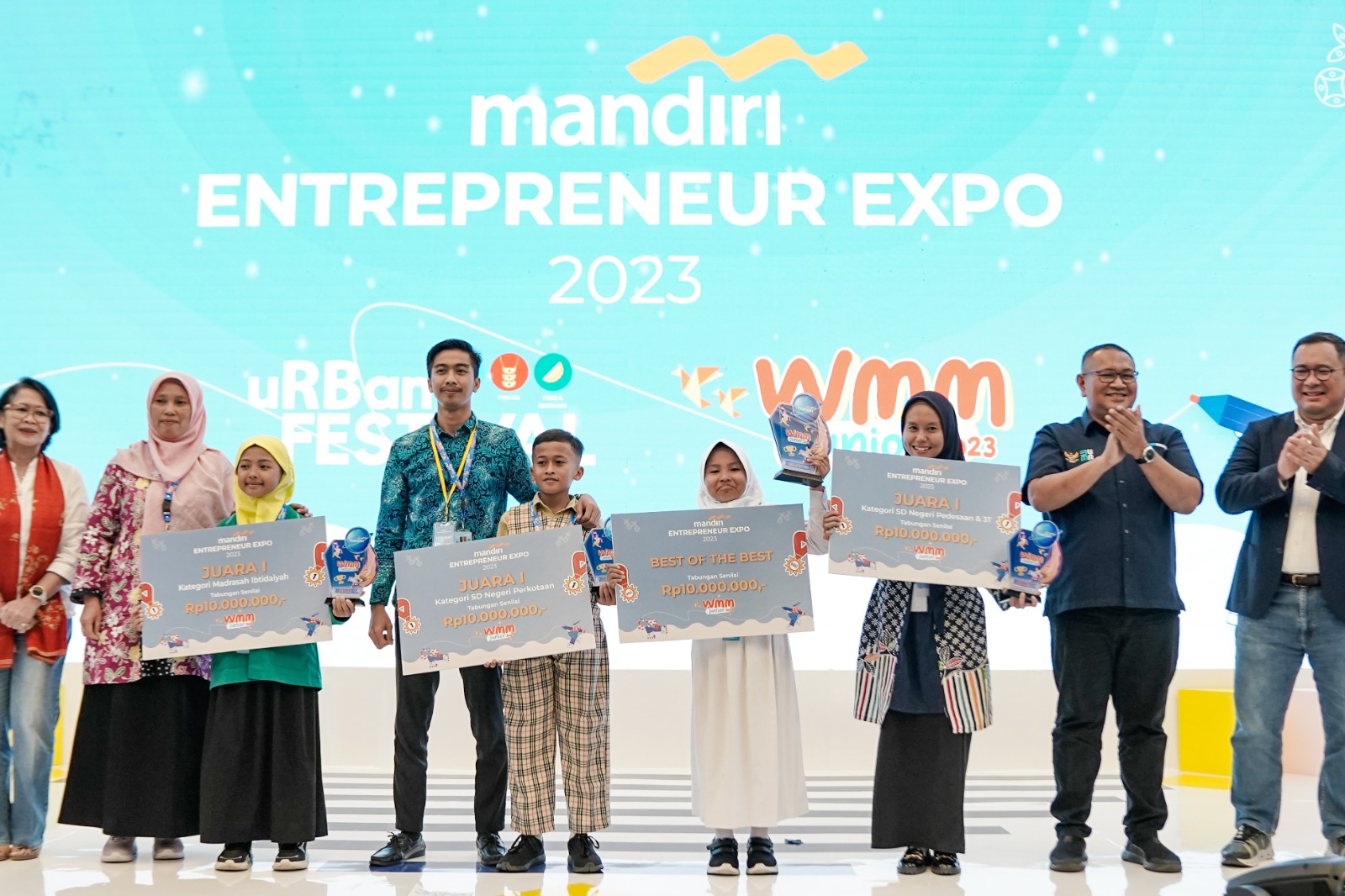 (Kiri – kanan) Asisten Deputi Bidang Tanggung Jawab Sosial dan Lingkungan Kementerian BUMN Edi Eko Cahyono, Plt. Sekretaris Direktorat Jenderal PAUD dan DIKDASMEN Kemendikburistek Praptono, Direktur Utama Bank Mandiri Darmawan Junaidi dan Komisaris Utama Bank Mandiri A. Chatib Basri saat berkunjung ke salah satu booth Finalis Kompetisi Wirausaha Muda Mandiri (WMM) Junior pada gelaran Mandiri Entrepreneur Expo 2023 di Menara Mandiri, Jakarta, Selasa (29/8). Di samping Kompetisi WMM Junior tingkat SD, expo ini juga mengadu ide kreatif dan dampak yang dihasilkan UMKM binaan Rumah BUMN (RB) Bank Mandiri untuk mendapatkan hadiah dana pembinaan. Event yang menjadi bagian peringatan HUT-25 Bank Mandiri merupakan strategi dalam menaikkelaskan pelaku UMKM dan menciptakan minat usaha kreatif sejak dini.
