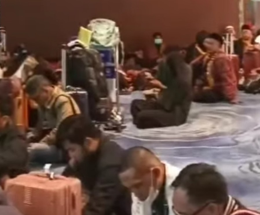 Dalam rekaman tersebut terlihat puluhan calon penumpang duduk di lantai area tunggu, sementara layar informasi penerbangan menampilkan status “cancelled” untuk rute menuju Jeddah.