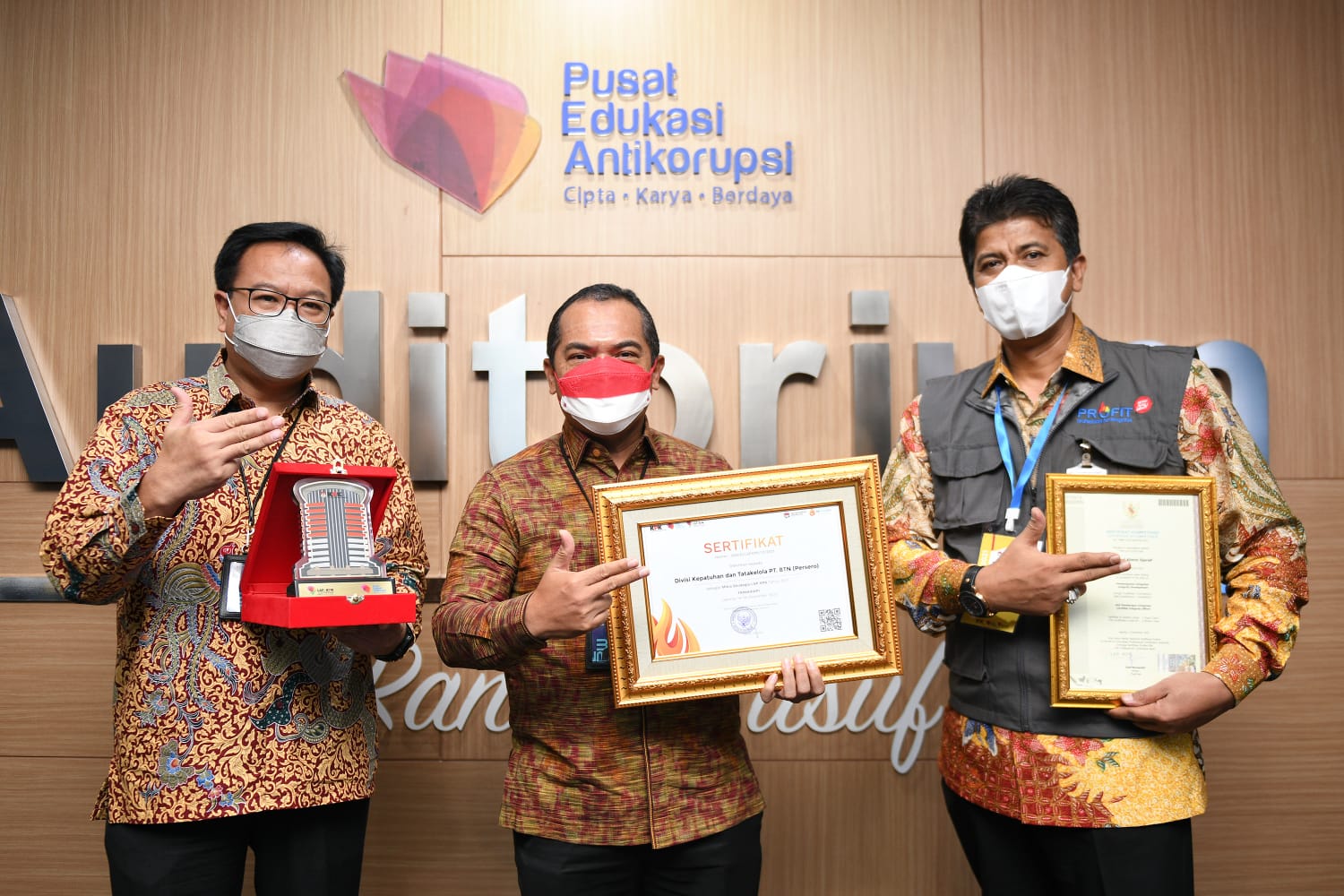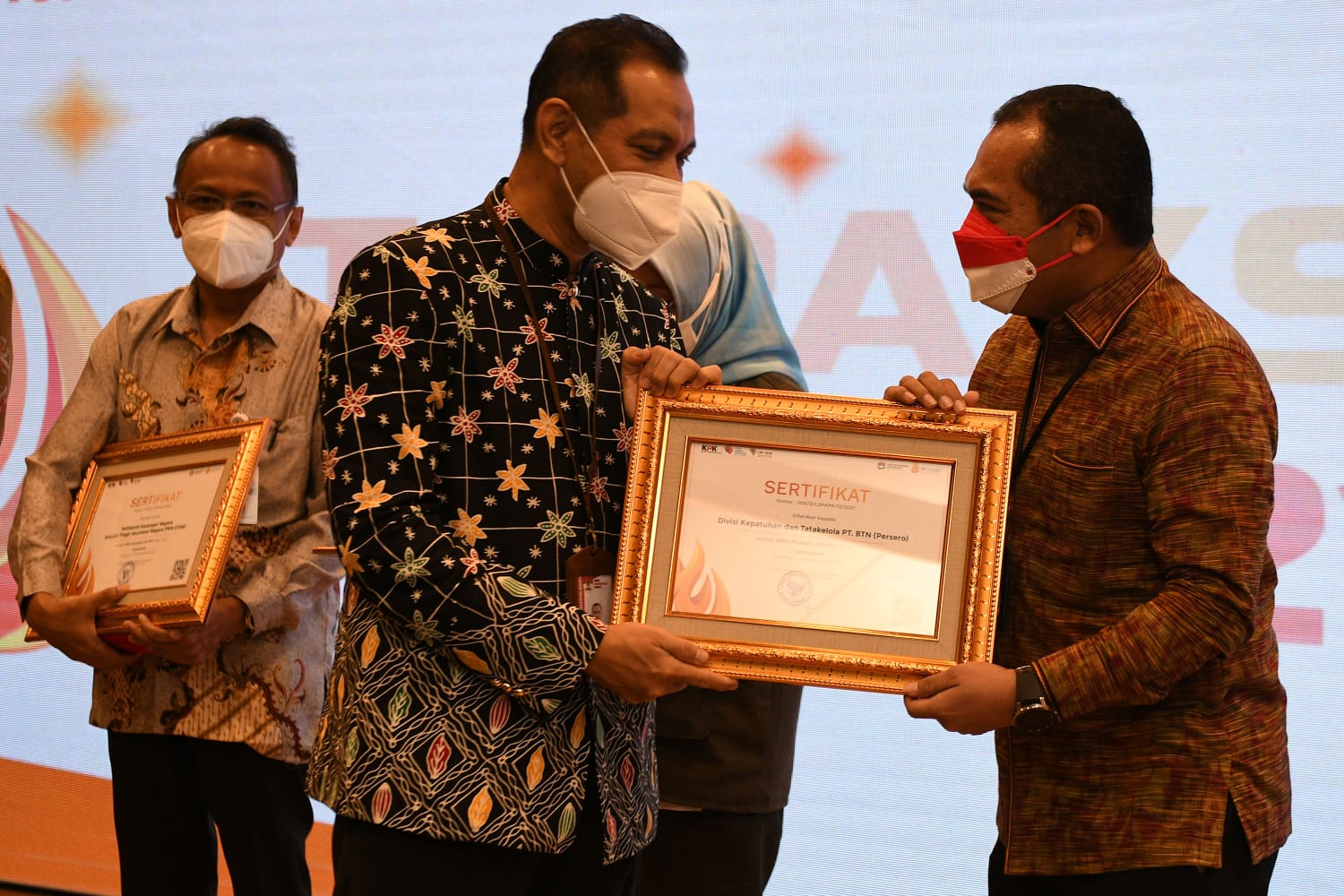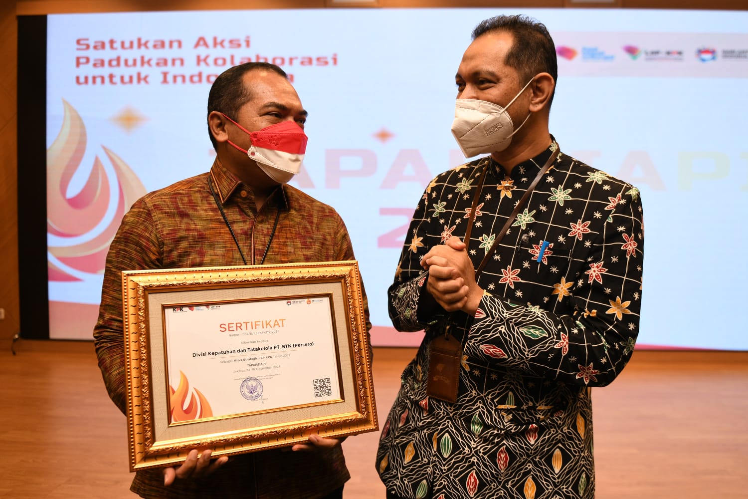 Direktur Compliance and Legal Bank BTN Eko Waluyo menerima penghargaan dari Wakil Ketua Komisi Pemberantasan Korupsi (KPK) Nurul Gufron dalam acara Hari Anti Korupsi Se-Dunia (HAKORDIA) 2021 di Gedung Pendidikan Anti Korupsi KPK Jakarta, Selasa (14/12/2021). Bank BTN mendapatkan penghargaan dari Lembaga Sertifikasi Profesi (LSP) KPK karena peran aktif perseroan dalam melakukan pencegahan korupsi di lingkungan perusahaan. Penghargaan ini akan menambah semangat Bank BTN dalam menjunjung tinggi sekaligus menjalankan prinsip good corporate governance (GCG) dalam proses bisnis bisnisnya.