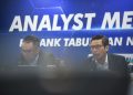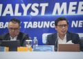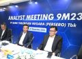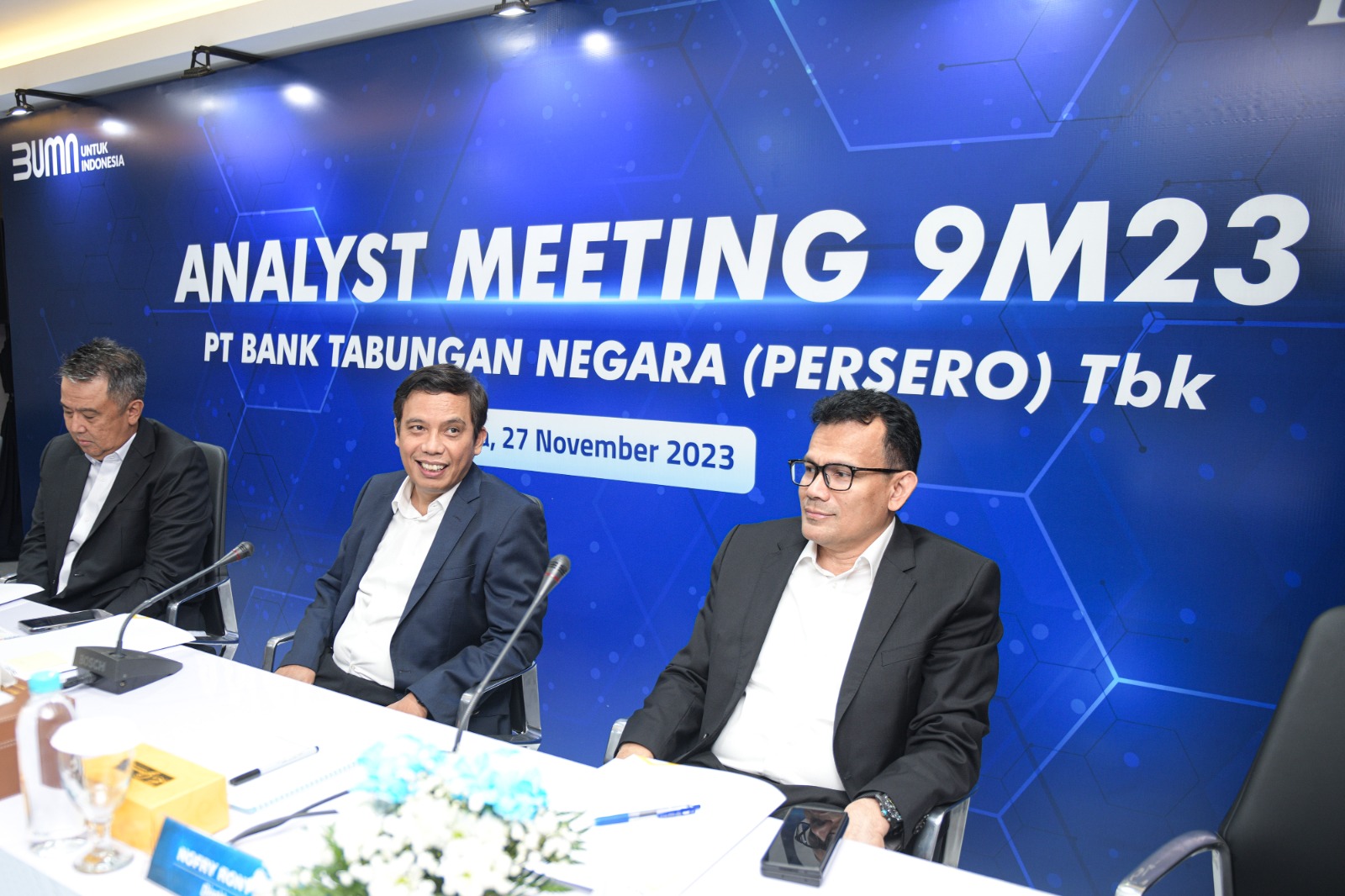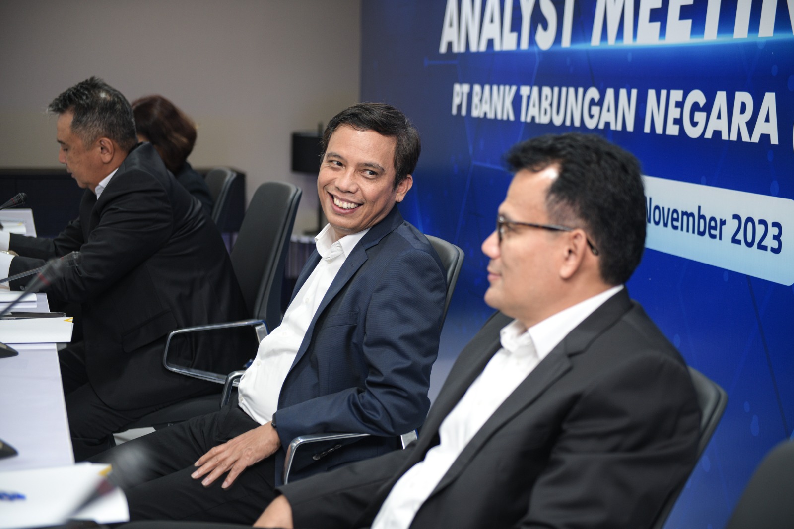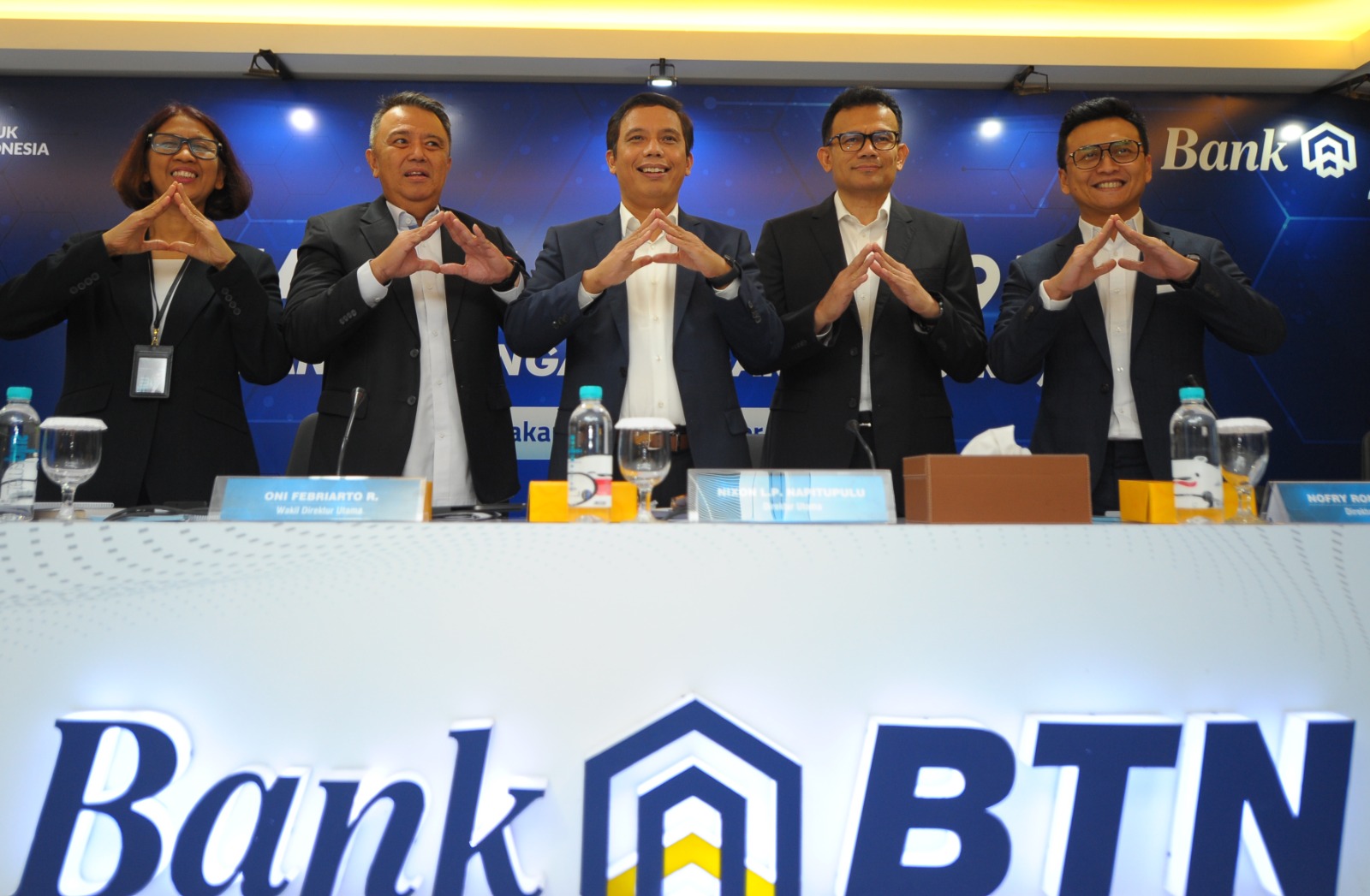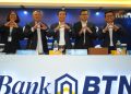 Direktur Utama PT Bank Tabungan Negara (Persero) Tbk. Nixon LP Napitupulu (ketiga kiri) didampingi Jajaran Direksi Bank BTN Elisabeth Novie Riswanti (kiri), Oni Febriarto R. (kedua kiri), Nofry Rony Poetra (kedua kanan), dan Setiyo Wibowo (kanan) tersenyum melihat laporan keuangan Bank BTN per kuartal III/2023. Laba Unit Usaha Syariah Bank BTN mencatatkan lonjakan positif sebesar 70,40% yoy menjadi senilai Rp400,89 miliar per kuartal III/2023. Kinerja BTN Syariah tersebut ikut mendongkrak perolehan laba bersih Bank BTN menjadi senilai Rp2,31 triliun atau sesuai target perseroan. Selain disumbang bisnis syariah, perolehan laba bersih Bank BTN juga ditopang penyaluran kredit dan pembiayaan senilai Rp318,30 triliun per kuartal III/2023 atau naik 9,87% yoy. Peningkatan tersebut didorong pertumbuhan Kredit Pemilikan Rumah (KPR) Subsidi yang naik 11,87% yoy dari Rp140,97 triliun menjadi Rp157,71 triliun pada kuartal III/2023.