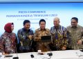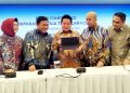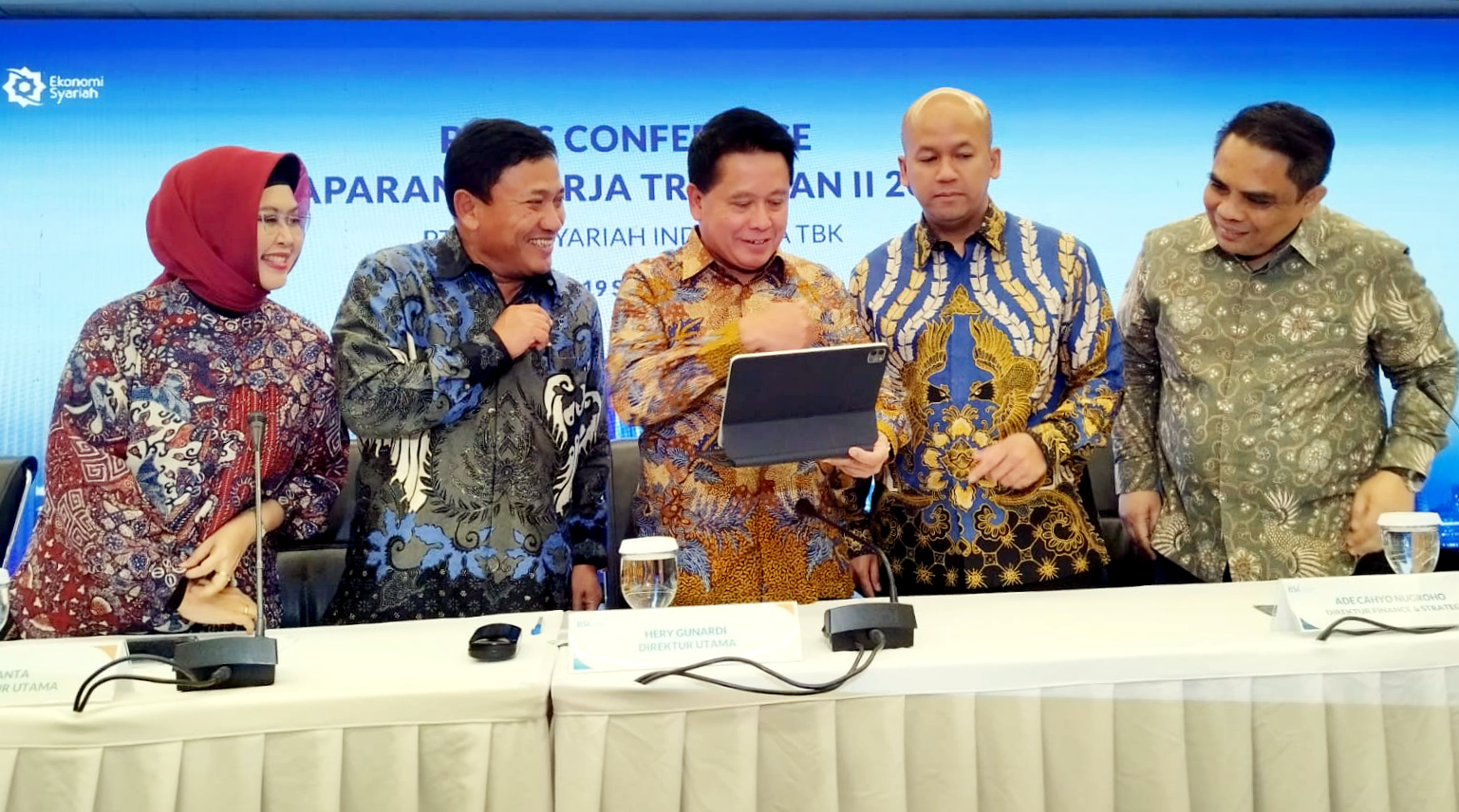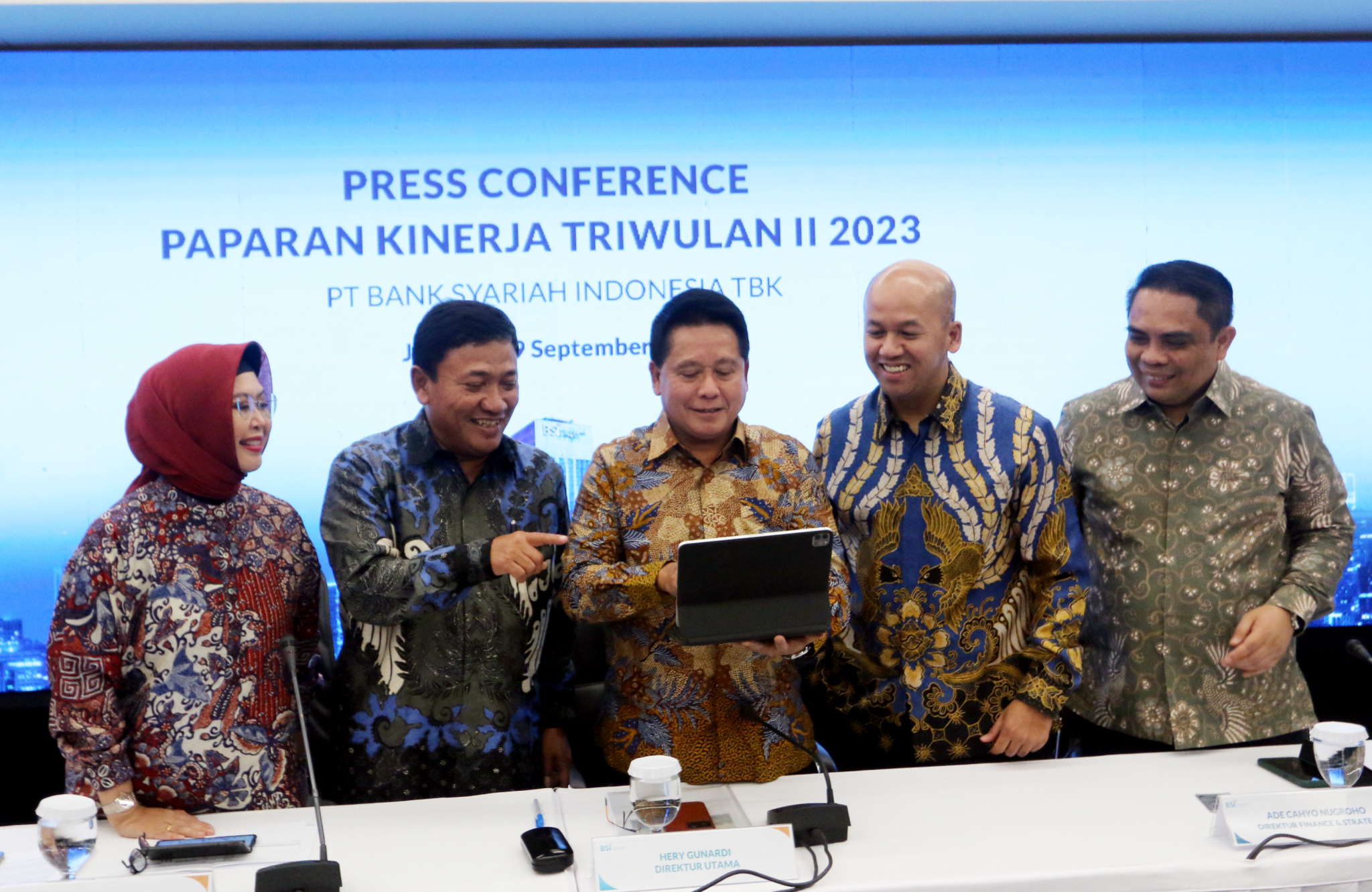 Direktur Utama PT Bank Syariah Indonesia Tbk (BSI) Hery Gunardi (tengah), didampingi Wakil Direktur Utama BSI Bob T Ananta (dua kiri), Direktur Compliance & Human Capital BSI Tribuana Tunggadewi (kiri), Direktur Finance & Strategy BSI Ade Cahyo Nugroho (dua kanan) dan Direktur Sales & Distribution BSI Anton Sukarna (kanan) tengah berbincang saat memaparkan kinerja BSI di kuartal II/2023 di Jakarta, Selasa (19/9). Hingga Juni 2023 BSI berhasil menjaga kinerja yang solid melalui akselerasi strategi bisnis, dimana perseroan mencatatkan pertumbuhan laba yang signifikan sebesar 32,41% menjadi Rp2,82 triliun dibanding periode yang sama tahun lalu.