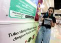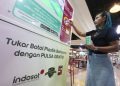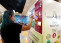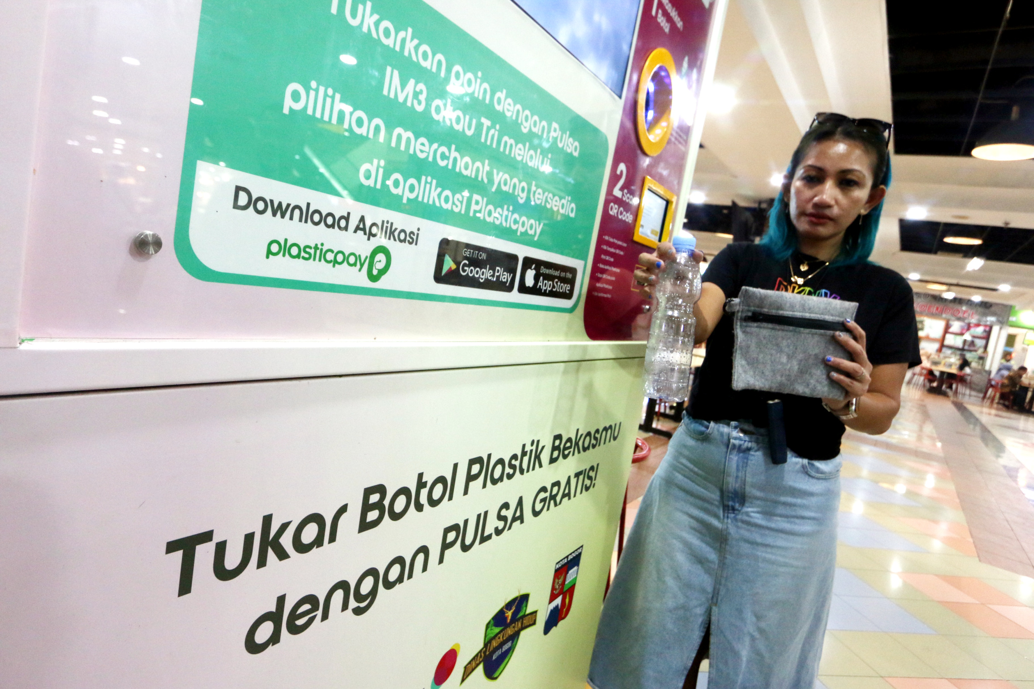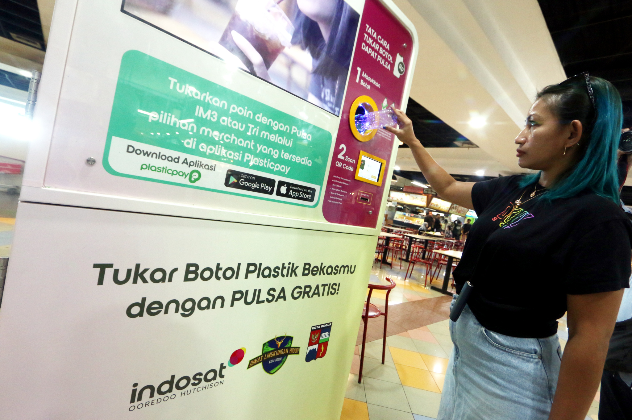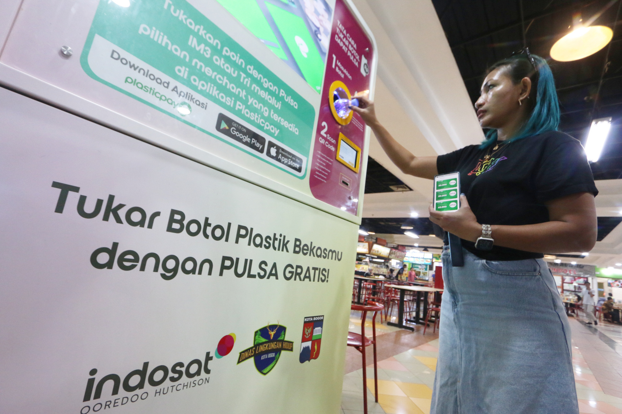 Pengunjung menukarkan botol plastik dengan pulsa IM3 dan Tri melalui Reverse Vending Machine (RVM) Plasticpay di pusat perbelanjaan Bogor Trade Mall (BTM), Bogor, Jawa Barat, Jumat (13/10).