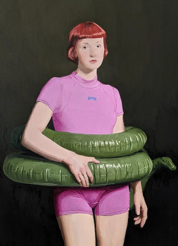 Karya-karya tersebut juga sarat sentuhan absurditas: ada yang memegang pelampung kolam renang atau perlengkapan olahraga; ada pula yang rambutnya menjuntai hingga ke tanah. Simbol dari lukisan mitologis dan religius hadir sebagai tambahan jenaka angsa (rujukan pada Zeus) menjadi hewan pangkuan, atau ular Alkitab menjelma pelampung kolam.