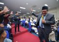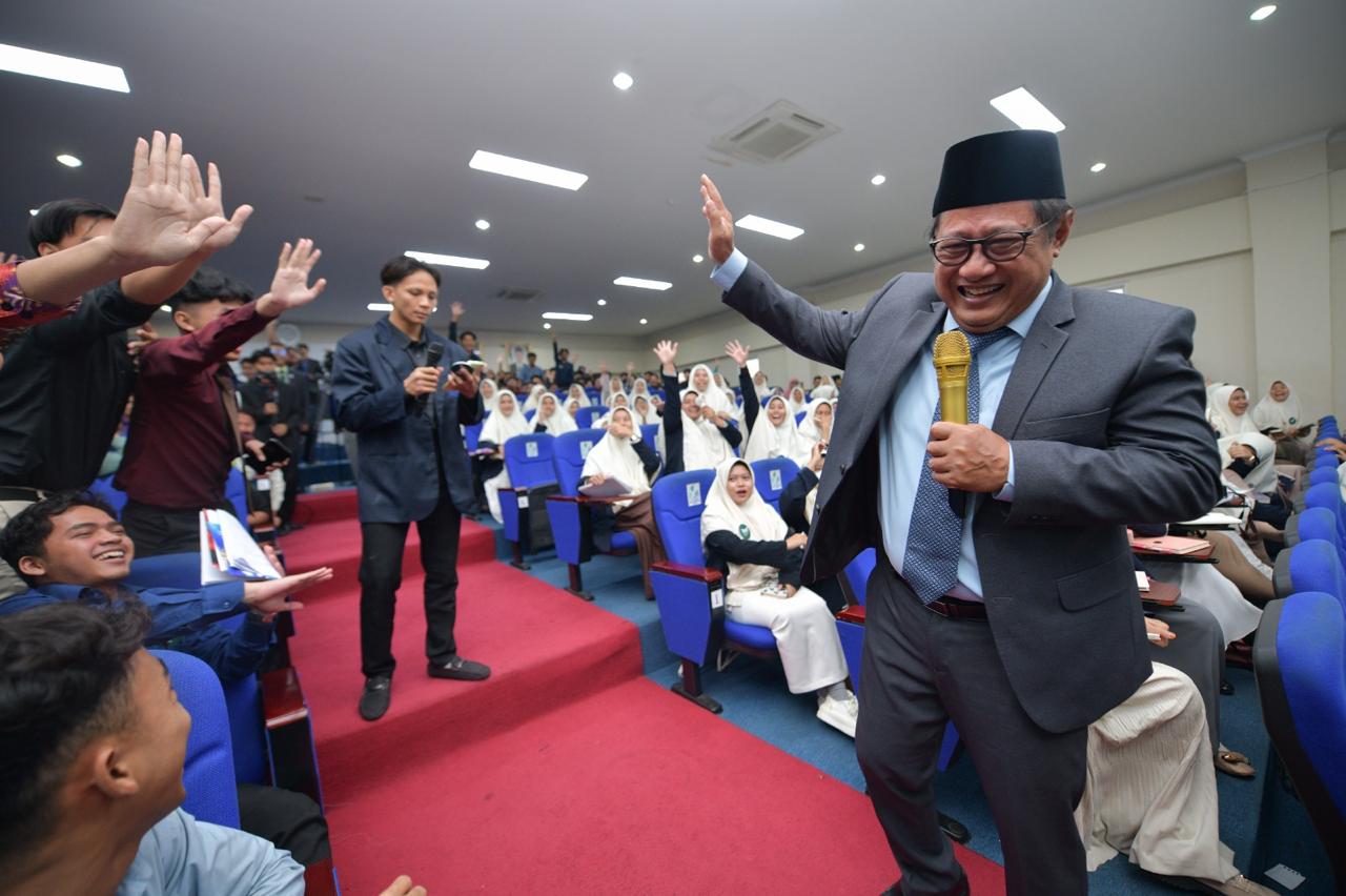 Direktur Utama Bank Syariah Nasional (BSN) Alex Sofjan Noor menyapa para santri usai berfoto bersama dengan Dosen Fakultas Ekonomi Dan Manajemen UNIDA Gontor Royyan Ramdhani Djayusman, Wakil Rektor II Setiawan bin Lahuri, Corporate Secretary BSN Dody Agoeng, Kepala BTN Syariah Solo Toni Ardiansyah saat penyerahan bantuan sosial motor sampah untuk lingkungan pendidikan hijau di sela-sela kuliah umum di Universitas Darusaalam Gontor, Ponorogo, Madiun, Kamis (4/12). Dalam sharing session berjudul Peran Pesantren Dalam Mendukung Transformasi Ekonomi & Perbankan Syariah di Indonesia tercetus gagasan untuk mengajak para santri muda dapat mendukung sosialisasi literasi keuangan syariah di Indonesia dengan pertimbangan pondok pesantren sebagai pusat edukasi dan literasi keuangan syariah, penggerak UMKM syariah, penguat ekonomi halal dan laboratorium syariah. Sebelumnya pada hari yang sama BSN berkunjung ke Pondok Pesantren Gontor dan diterima langsung oleh pimpinan pondok pesantren tersebut KH Hasan Abdullah Sahal.