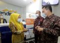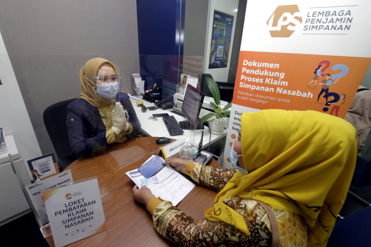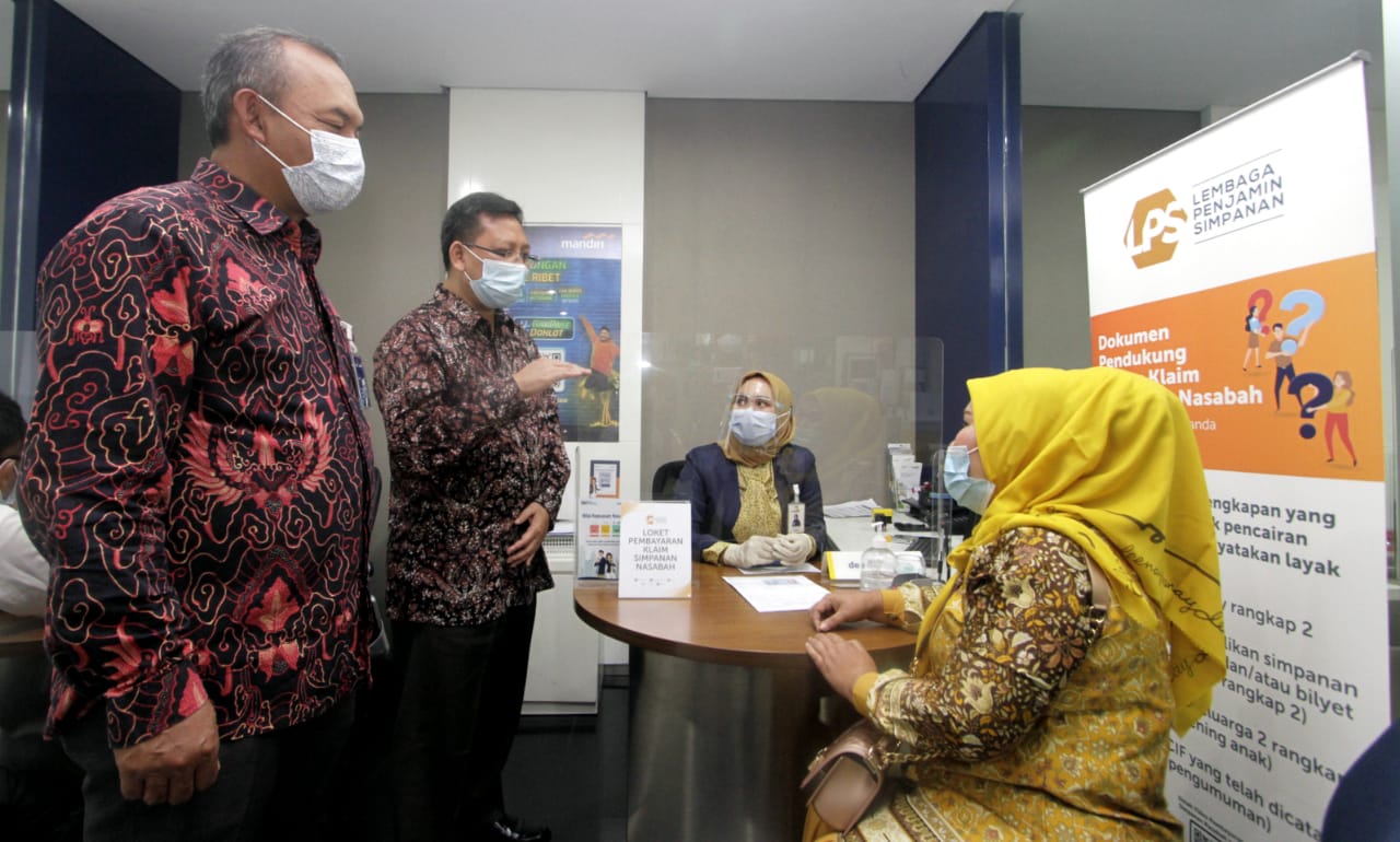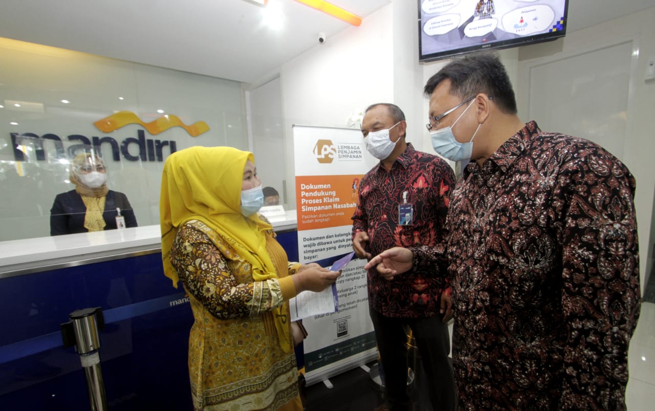 Direktur Eksekutif Klaim dan Resolusi Bank Lembaga Penjamin Simpanan (LPS) Suwandi (kanan) dan Executive Vice President Regional CEO VI Bank Mandiri Sulaeman (kedua kanan) mendampingi nasabah PT. BPR Brata Nusantara yang sedang melakukan pencairan klaim penjaminan simpanan di Bank Mandiri KCP Binacitra, Bandung, Jawa Barat, Jumat (29/01/2021). LPS memastikan proses pembayaran klaim penjaminan simpanan nasabah di BPR Brata Nusantara yang dicabut ijin operasinya pada 30 September 2020 berjalan dengan baik. Sampai 25 Januari 2021 ini, LPS telah berhasil melakukan verifikasi dan menyatakan layak bayar terhadap 1.417 rekening nasabah BPR Brata Nusantara dengan total jumlah saldo yang dijamin Rp 7,3 miliar.