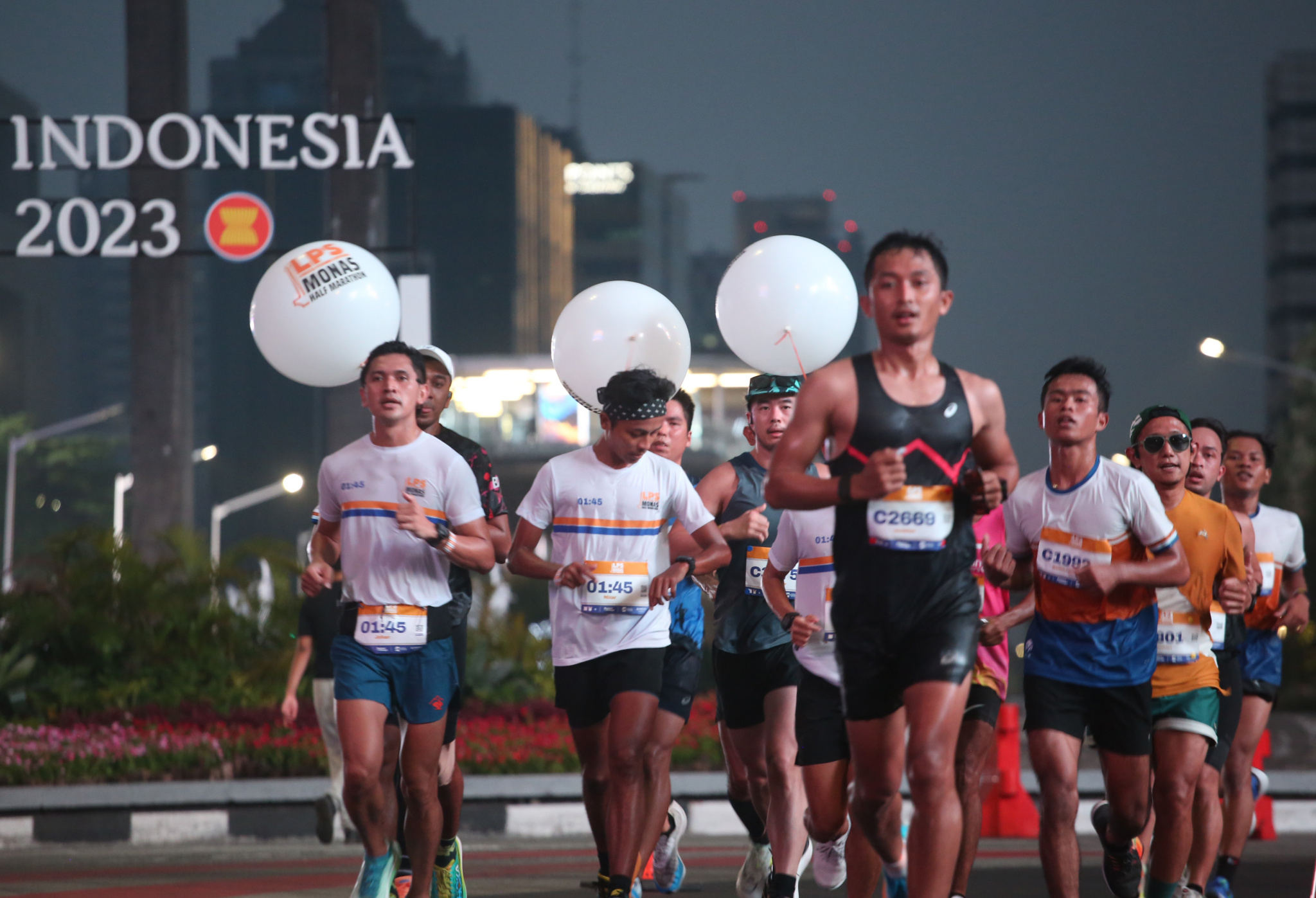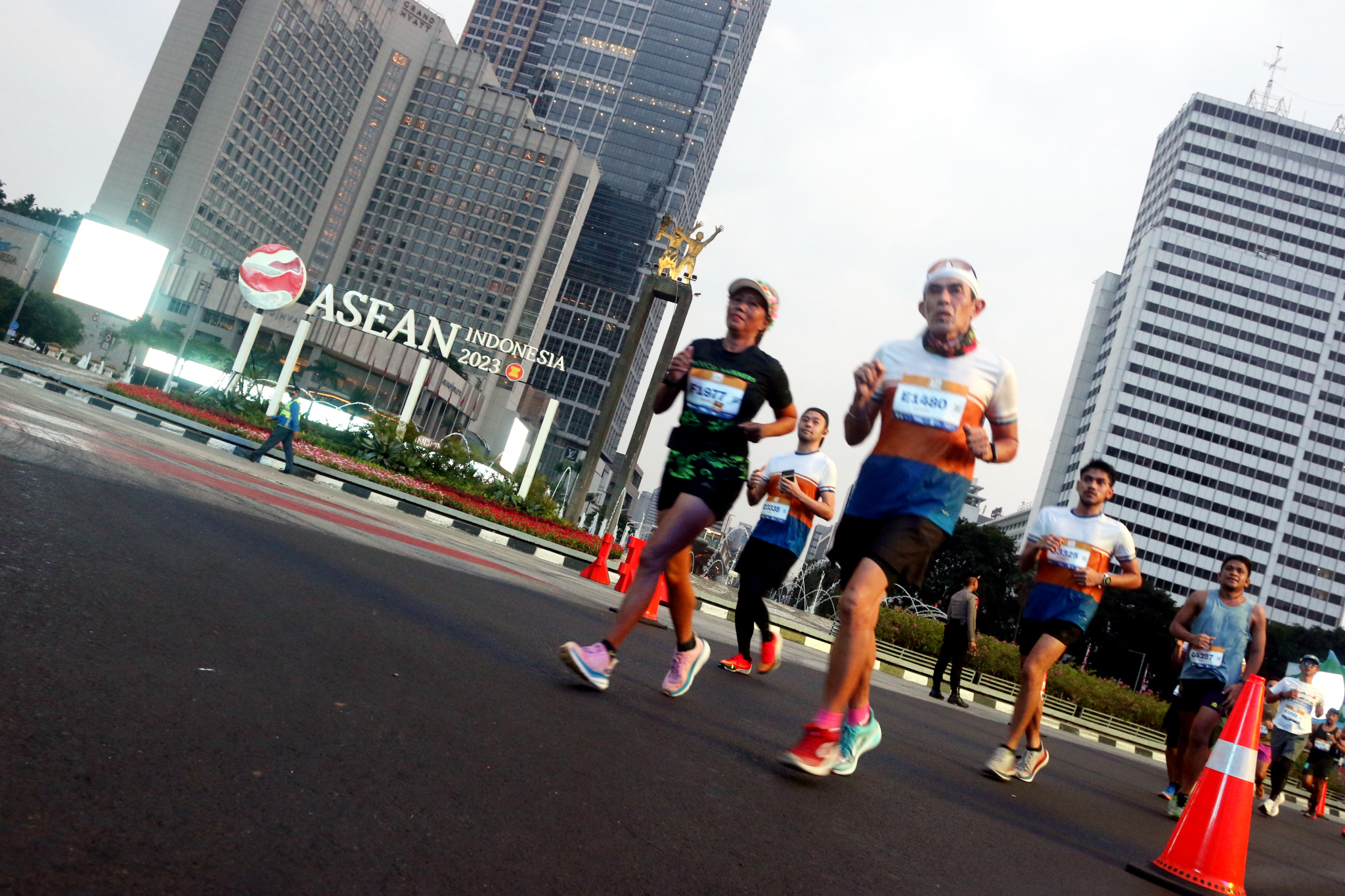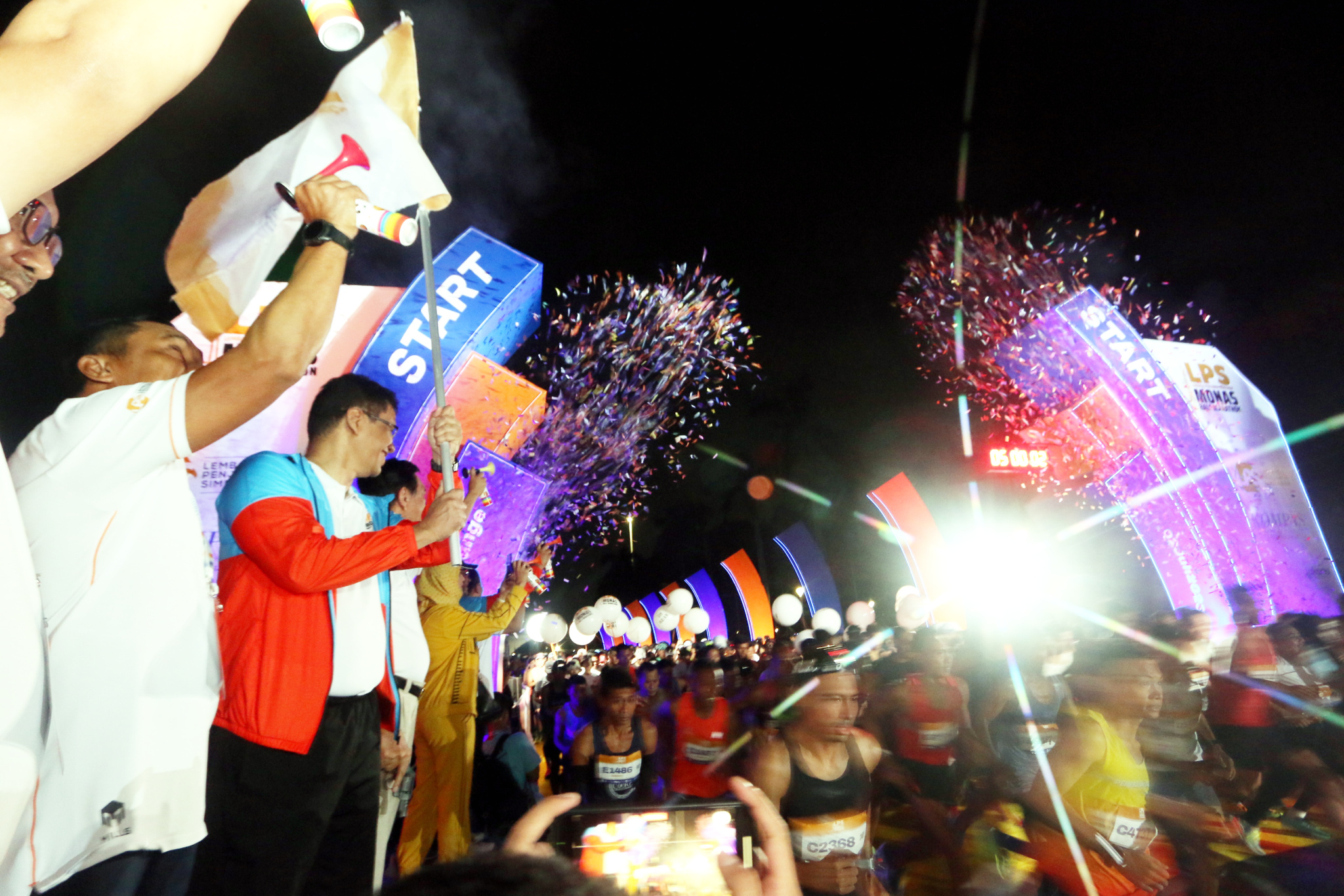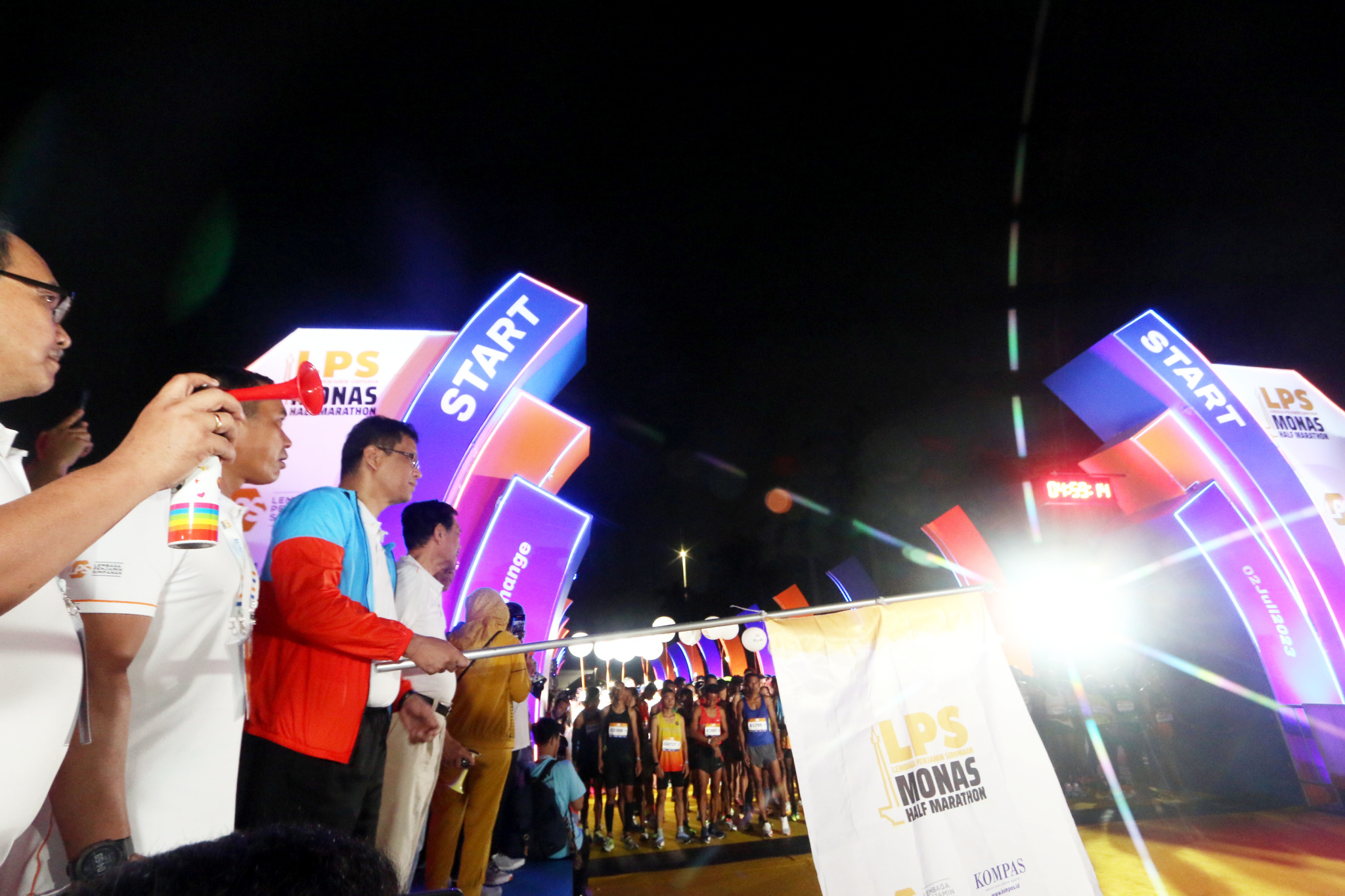 Sejumlah pelari meninggalkan garis start pada kegiatan lomba lari LPS Monas Half Marthon 2023 di Monumen Nasional (Monas), Jakarta Minggu (2/7/2023). Lomba lari yang diikuti 5.000 peserta yang mengangkat tema “Restart for Change” tersebut diharapkan menjadi awal penyemangat kemenangan dan kejayaan demi mewujudkan jaminan kenyamanan lewat berlari.