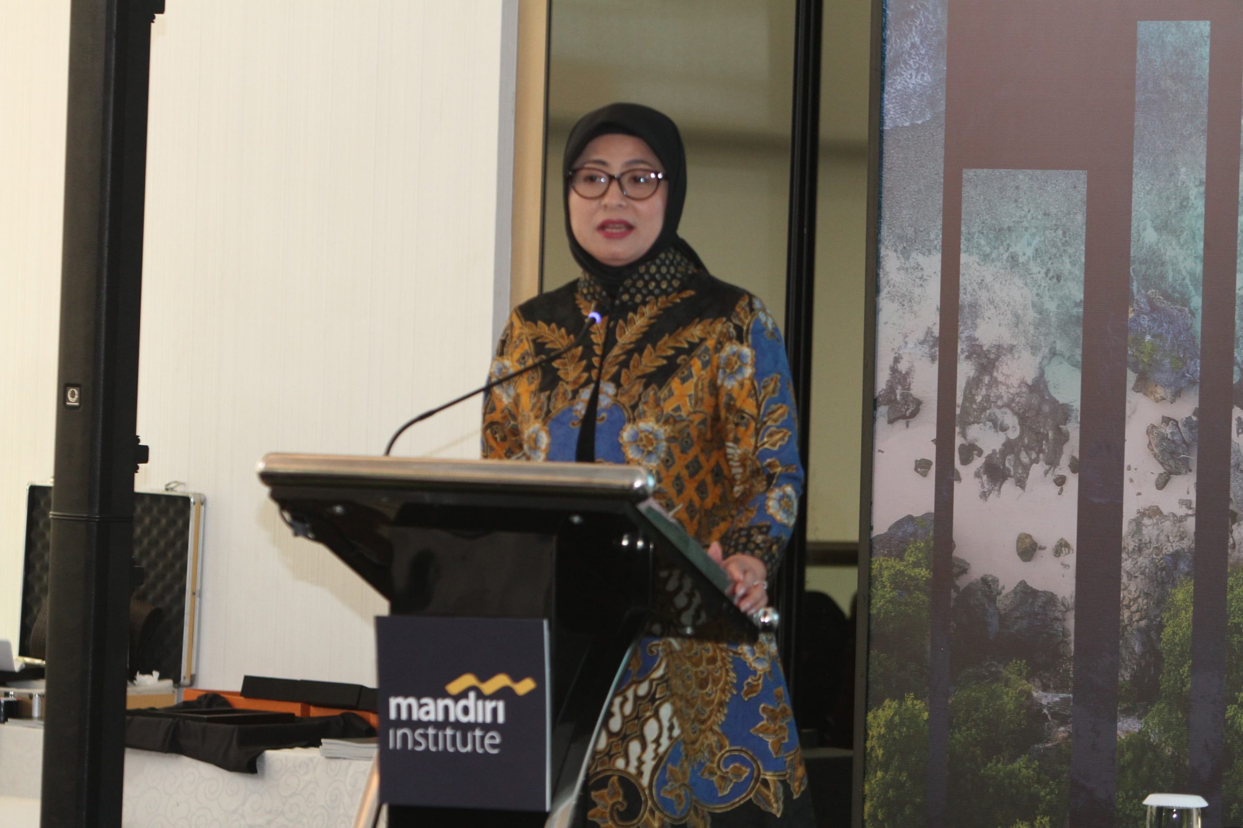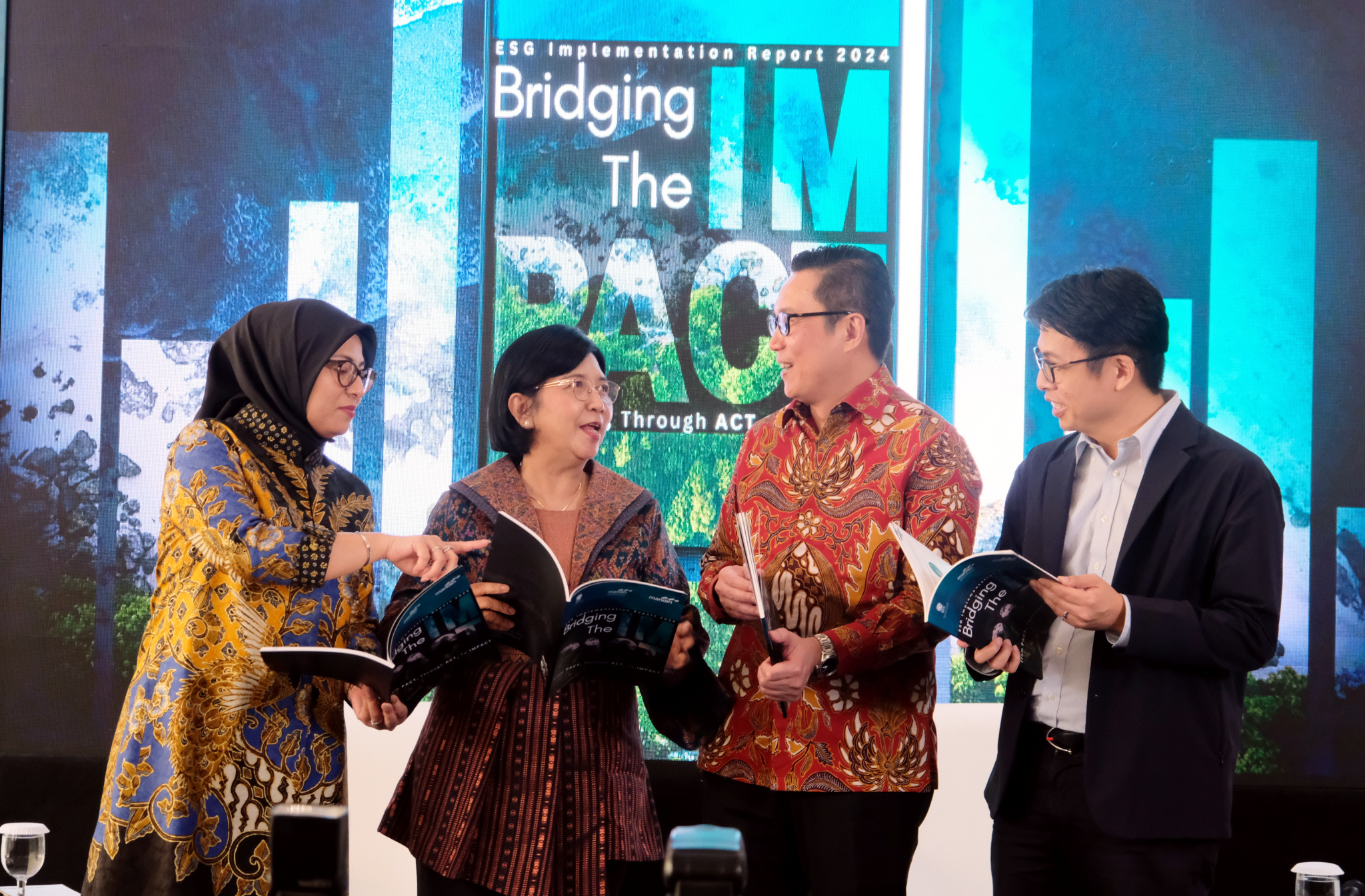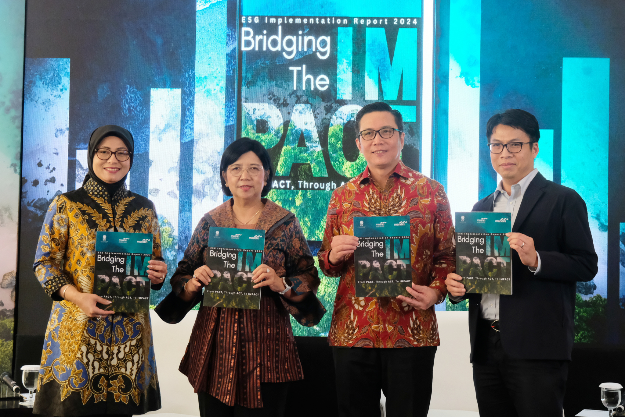 (Ki-Ka) Direktur Treasury & International Banking Bank Mandiri Eka Fitria bersama Deputi Gubernur Bank Indonesia Destry Damayanti serta Direktur Pengembangan Bisnis BEI Jefrey Hendrik dan Advisory Board Member Mandiri Institute Johan Sulaeman saat peluncuran Mandiri Institute Insight: ESG Implementation 2024 di Jakarta, Rabu (11/12). Berangkat dari komitmen dan kepedulian perusahaan BUMN pada inisiatif pengembangan bisnis berkelanjutan di Indonesia, Bank Mandiri melalui Mandiri Institute meluncurkan Laporan ESG Implementation 2024 yang menggambarkan kondisi serta kesiapan dunia usaha di Indonesia dalam pengembangan ESG. Hasil laporan ini diharapkan mampu mendorong perluasan ekosistem ESG dan pasar karbon di Tanah Air.