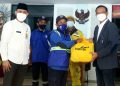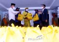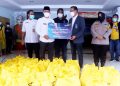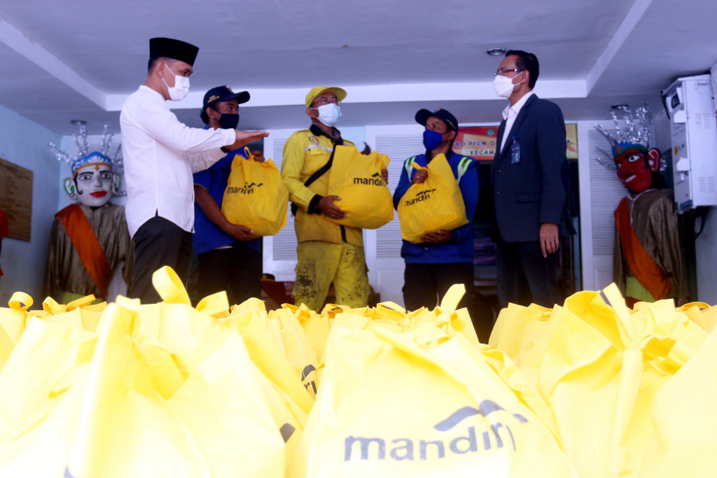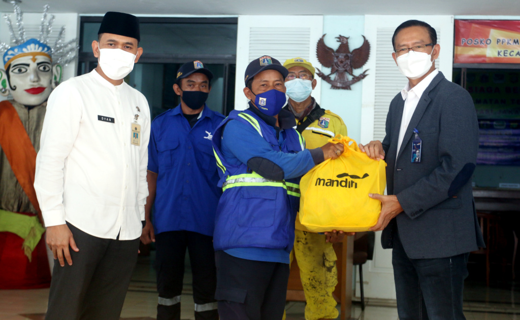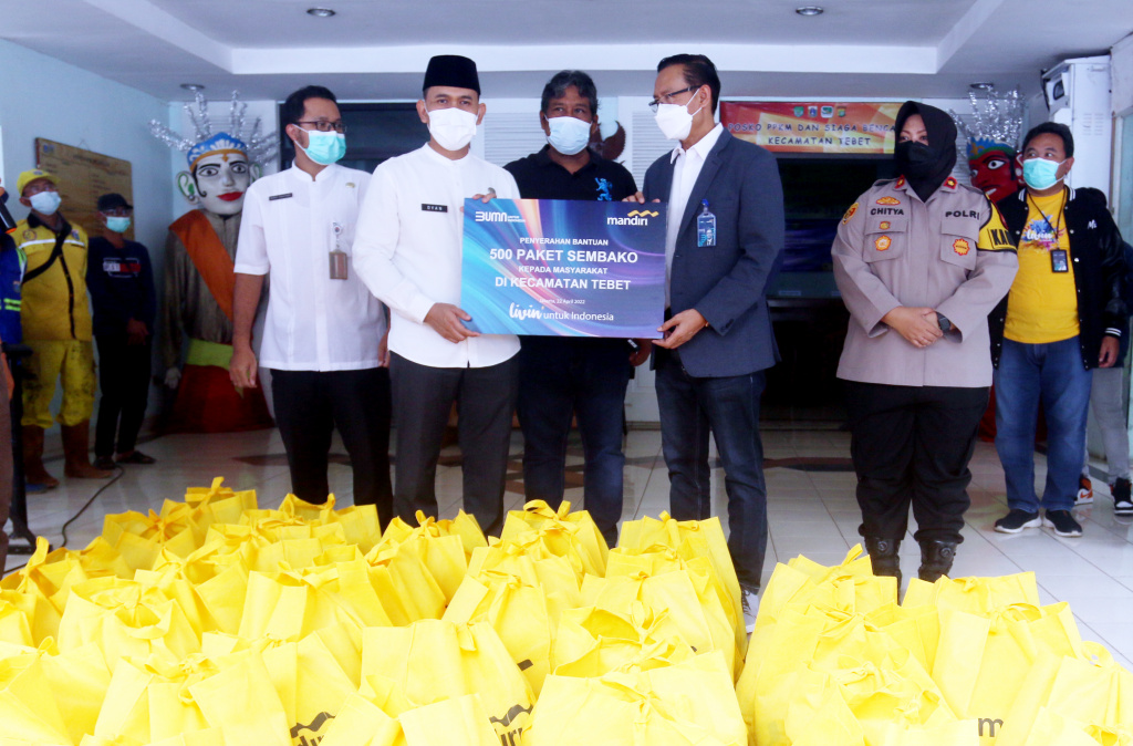 Direktur Jaringan & Retail Banking Bank Mandiri Aquarius Rudianto (kanan) dan Camat Tebet Dyan Airlangga (kiri) saat menyerahkan bingkisan Ramadan kepada petugas kebersihan di kecamatan Tebet, Jakarta Selatan, Jumat (22/4). Sebanyak 500 paket sembako terdiri atas beras,minyak goreng, gula teh, kopi & mie Instant senilai Rp100.000,- hingga Rp 250.000,- per paket akan dibagikan masyarakat kurang mampu dan penerima yang dianggap layak lainnya. Secara keseluruhan, Bank Mandiri pada bulan Ramadan 1443 H ini menyalurkan total 100.000 paket sembako senilai lebih dari Rp 10 Miliar secara bertahap dan menyebar kepada masyarakat di sekitar kantor utama dan kantor wilayah perseroan di Seluruh Indonesia.