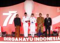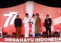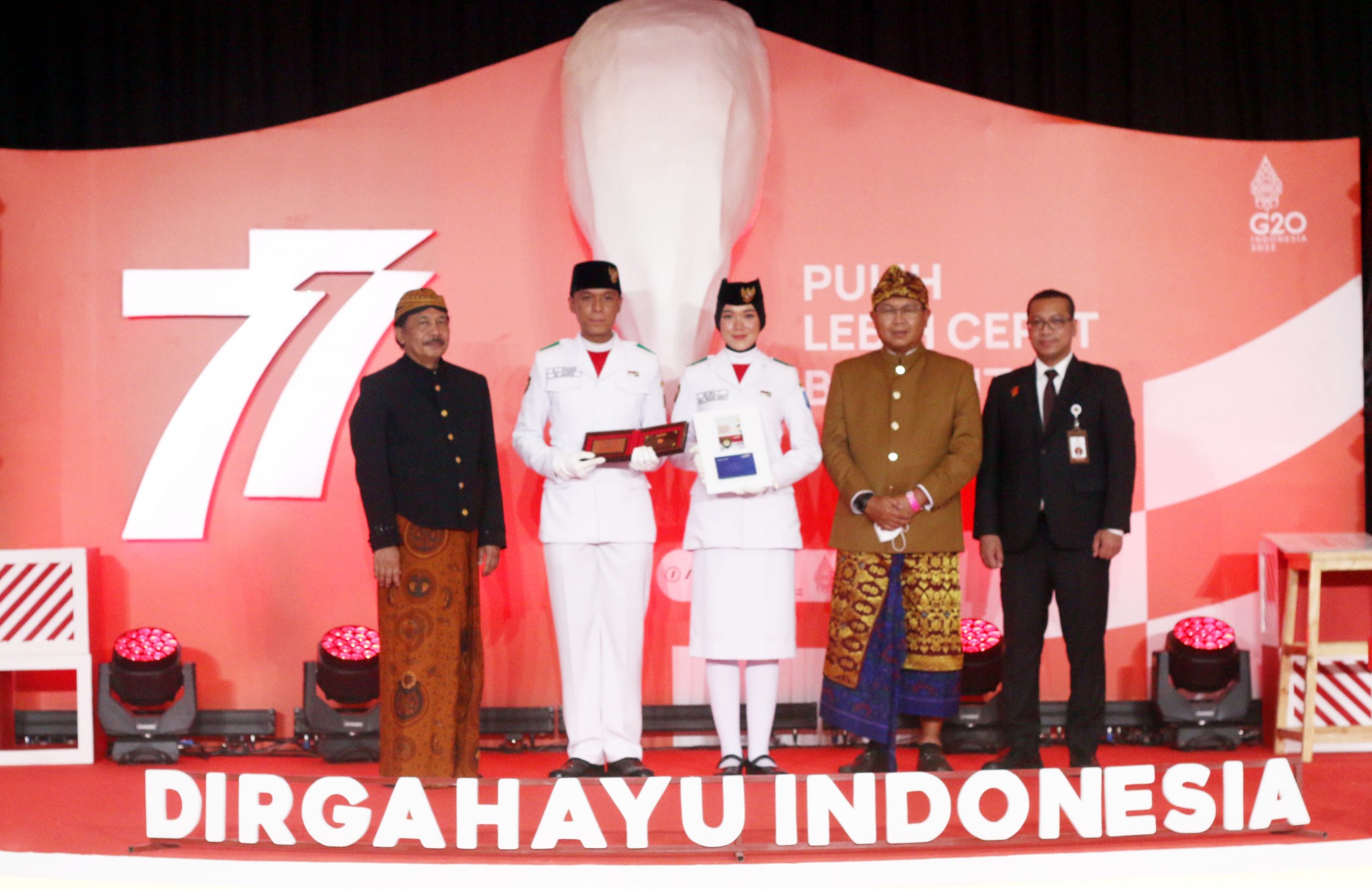 (Ki-Ka) Kepala BPIP Yudian Wahyudi, Anggota Paskibraka Nasional 2022 asal DKI Jakarta M.Ikram Aththariq dan Paskibraka Nasional 2022 asal Nusa Tenggara Barat (NTB) Melinda Trihapsari bersama Direktur Utama Bank Mandiri Darmawan Junaidi beserta Kepala Biro Administrasi Sekretariat Presiden Sony Kartiko dalam penyerahan apresiasi kepada Tim Paskibraka Nasional 2022 di Gedung Krida Bhakti, Jakarta (17/8). Menyambut peringatan HUT Kemerdekaan RI ke -77, Bank Mandiri memberikan apresiasi berupa koin emas murni 24 karat seberat 5 gram, tabungan kepada seluruh siswa-siswi terbaik yang terpilih menjadi Paskibraka nasional 2022 serta kartu e-money edisi khusus Paskibraka kepada pelatih.
