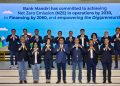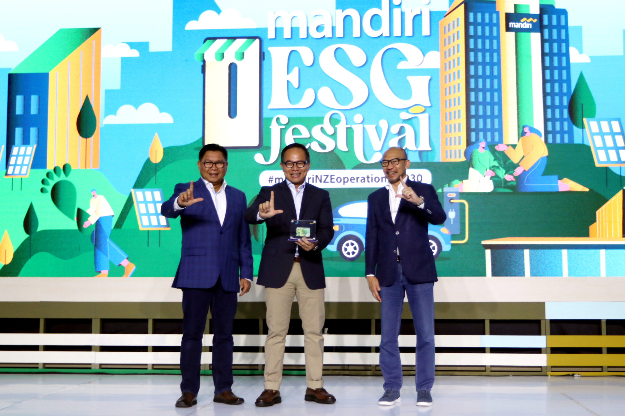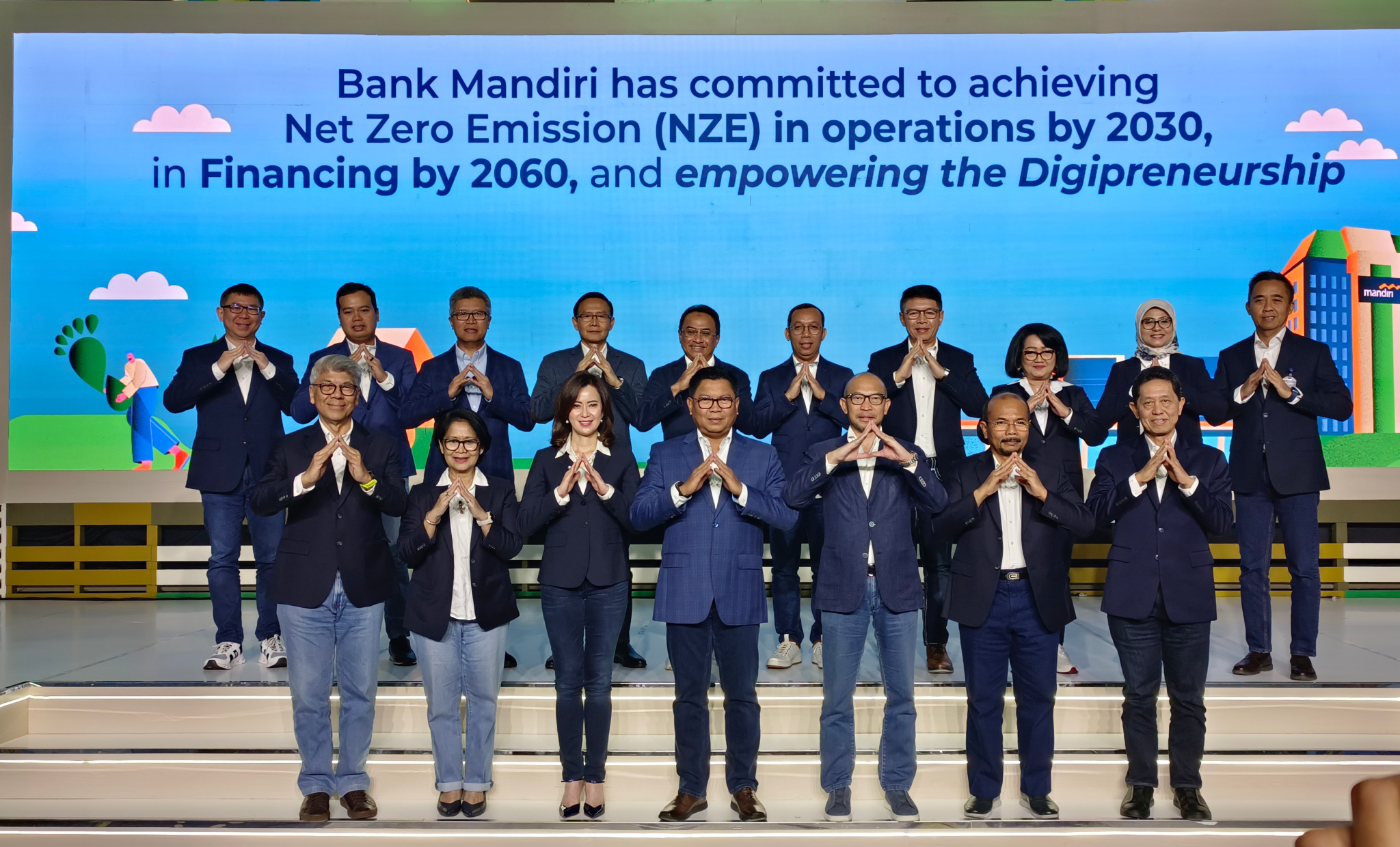 (Kika depan) Komisaris Bank Mandiri Muliadi Rahardja, Komisaris Loeke L. Agoestina, Wadirut Bank Mandiri Alexandra Askandar, Dirut Bank Mandiri Darmawan Junaidi, Komisaris Utama Bank Mandiri M. Chatib Basri, Wakil Komut Andrinof A. Chaniago, dan Komisaris Heru Kristiyana beserta jajaran senior manajemen Bank Mandiri menyampaikan dukungan pada pencapaian NZE 2060 saat membuka Mandiri ESG Festival di Jakarta, Rabu (12/7). Bank Mandiri terus konsisten mendorong praktik Sustainable Banking untuk mendukung transisi menuju Indonesia Net Zero Emission (NZE) 2060. Pada event ini, Bank Mandiri meluncurkan Kartu Debit dan kartu e-Money daur ulang sebagai wujud komitmen perseroan mencapai target NZE Operations di 2030, serta menuju NZE emisi pembiayaan pada 2060