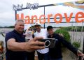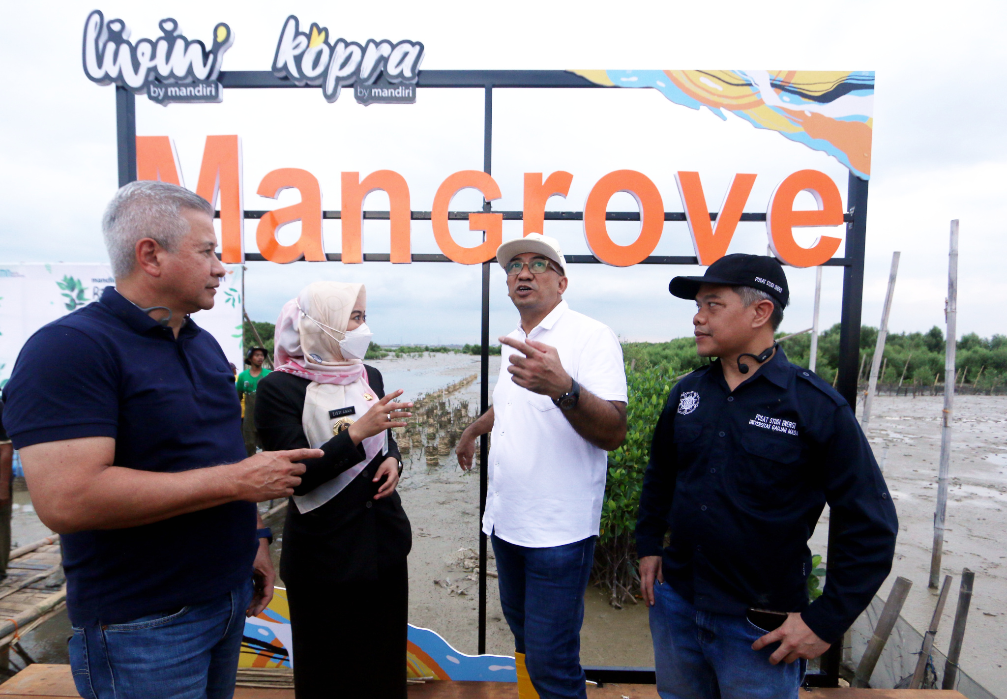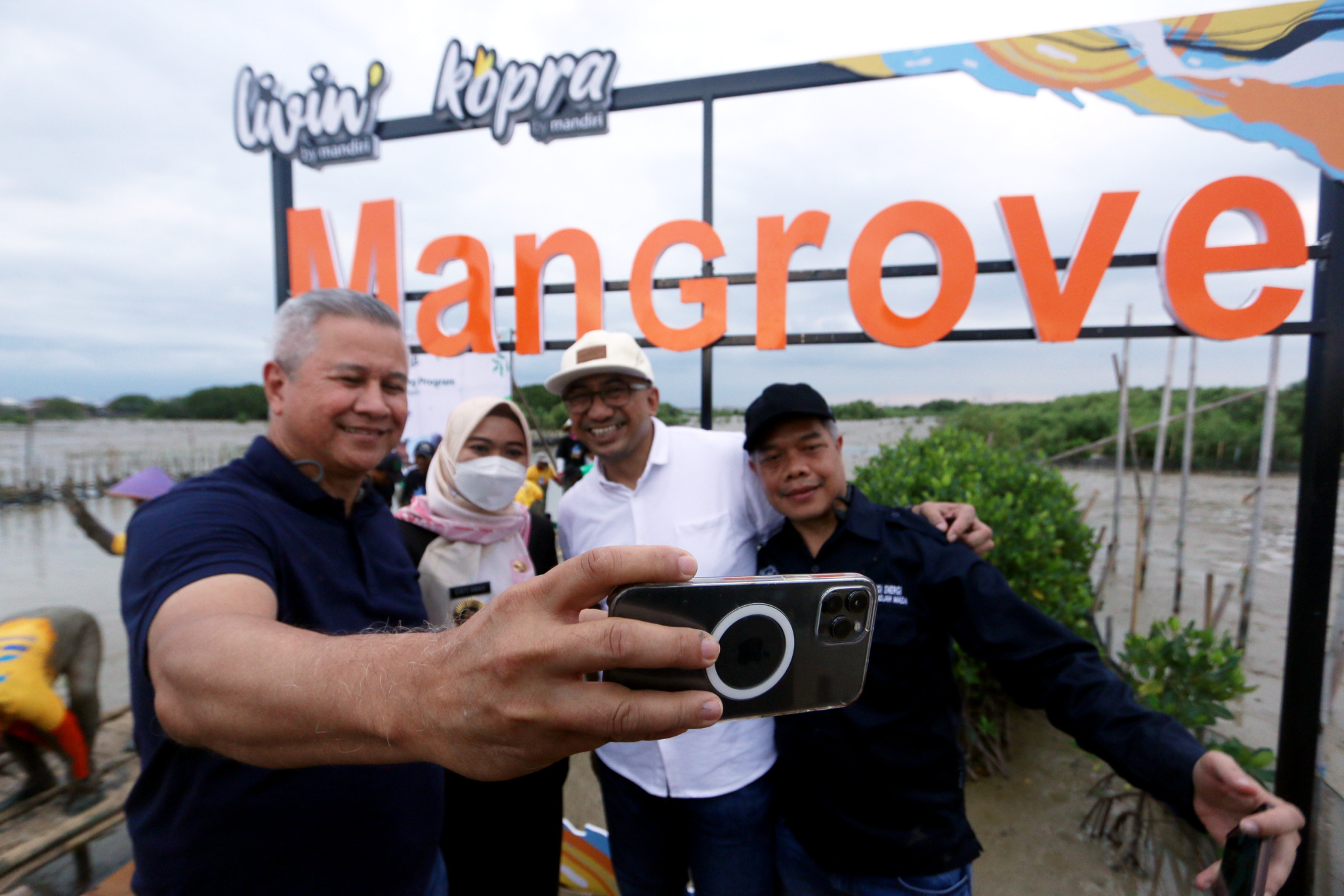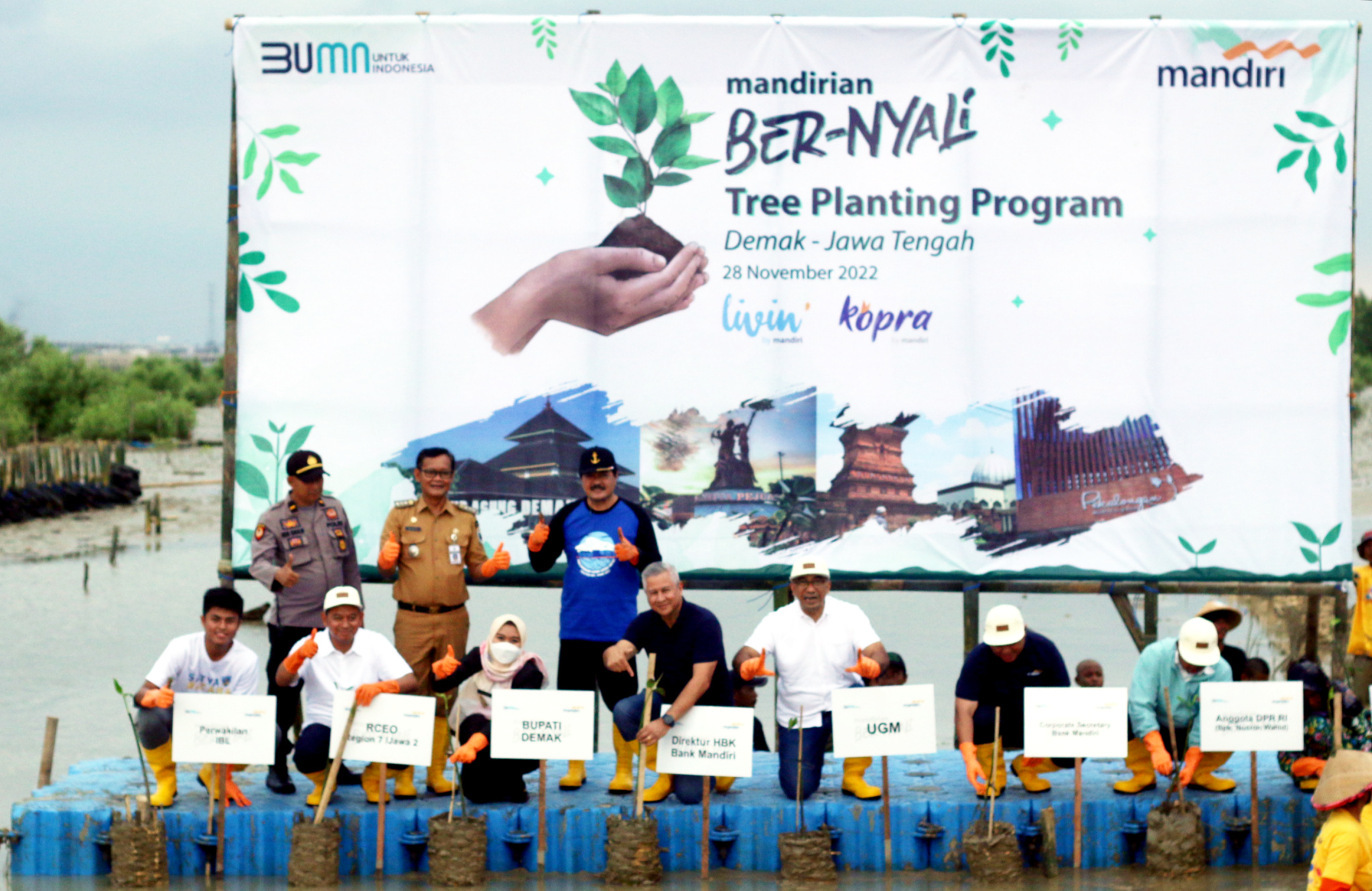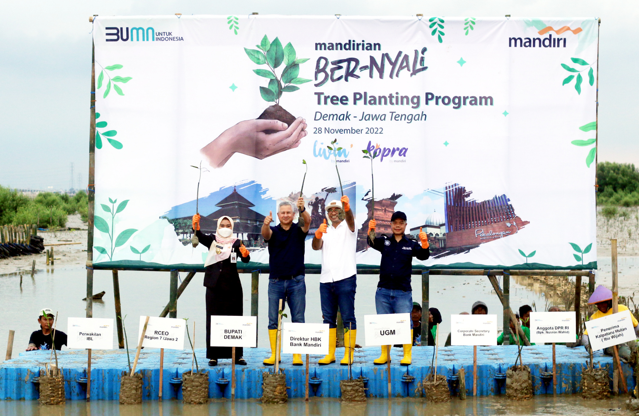 (kika) Direktur Hubungan Kelembagaan Bank Mandiri Rohan Hafas, Wakil Rektor Universitas Gadjah Mada (UGM) Bidang Penelitian, Pengembangan Usaha, dan Kerja Sama Ignatius Susatyo Wijoyo, Bupati Demak Eisti’anah dan Kepala Pusat Studi Energi (PSE) UGM Sarjiya Ph.D., sedang berswafoto usai melakukan penanaman pohon mangrove di Desa Bedono, Demak, Jawa Tengah, Senin (28/11). Mengusung misi ekonomi berkelanjutan dan mendukung pengurangan emisi karbon, Bank Mandiri di tahap awal menggandeng PSE UGM dalam konservasi alam di lahan kritis yang kedepannya diperluas hingga 500 Ha. Memanfaatkan pendekatan kolaborasi pentahelix yang melibatkan pemangku kepentingan lokal, kegiatan nature-based solutions (NBS) yang dilakukan sebagai peringatan Hari Menanam Pohon Indonesia, 28 November 2022 ini juga diikuti upaya pemberdayaan masyarakat setempat melalui penyaluran KUR dan pemasangan QR Code Indonesian Standard (QRIS) pada sejumlah warung di lokasi konservasi.