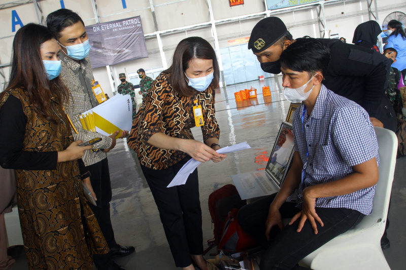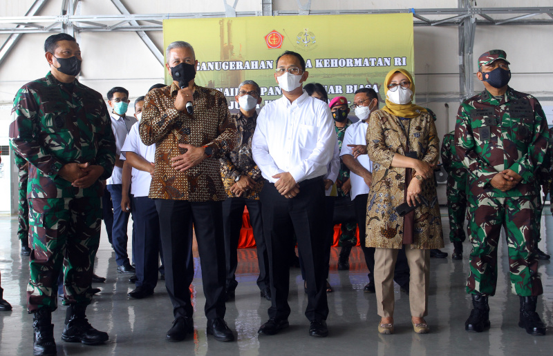 Direktur Utama Bank Mandiri Taspen Elmamber P. Sinaga (dua dari kiri) didampingi Direktur Bank Mandiri Taspen Iwan Soeroto secara simbolis pemberian program Tabungan Hari Tua (THT) dan Jaminan Kecelakaan Kerja (JKK) kepada perwakilan keluarga Kru Nanggala 402 di Puspenerbal Surabaya, kamis (29/4). Bank Mandiri Taspen ditunjuk oleh ASABRI dalam menyalurkan kepada 17 ahli waris Kru Nanggala 402 dengan manfaat santunan THT sebesar Rp. 398 juta, JKK Rp 5,95 miliar dan Beasiswa sebesar Rp. 360 juta yang merupakan bagian dari implementasi Peraturan Pemerintah (PP) 54 Tahun 2020.