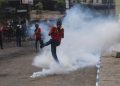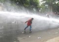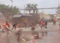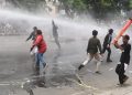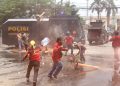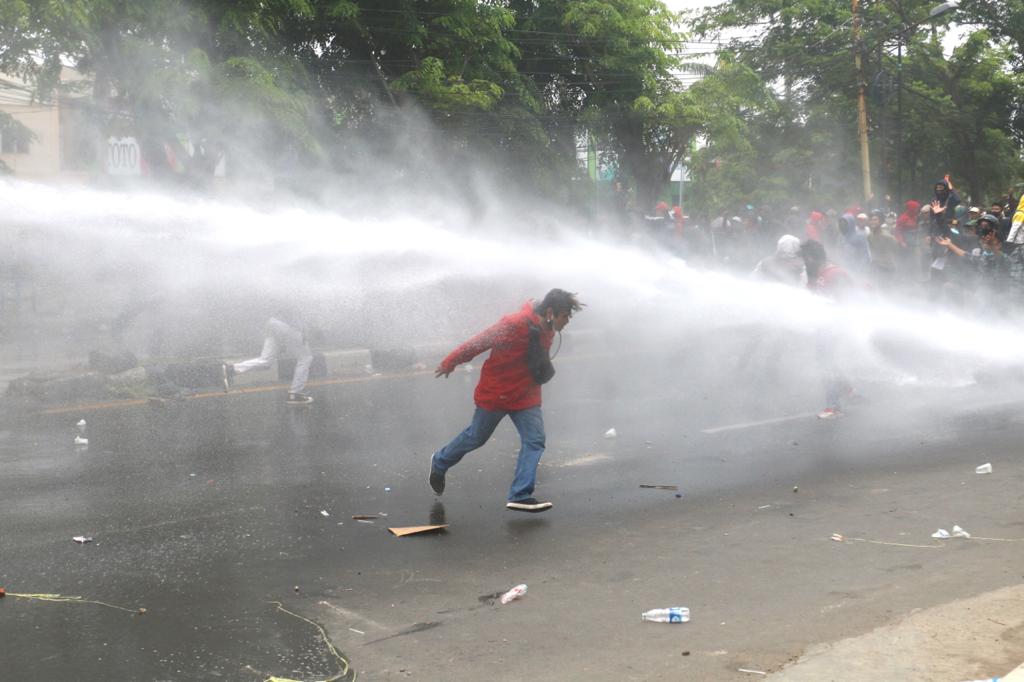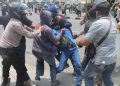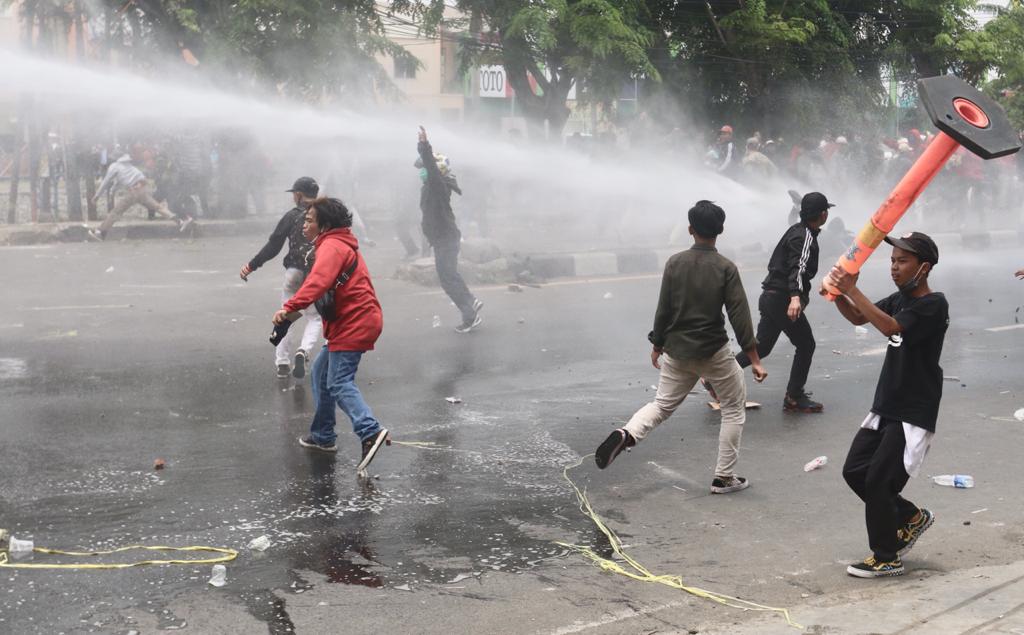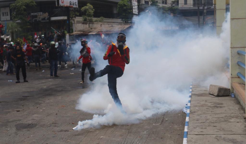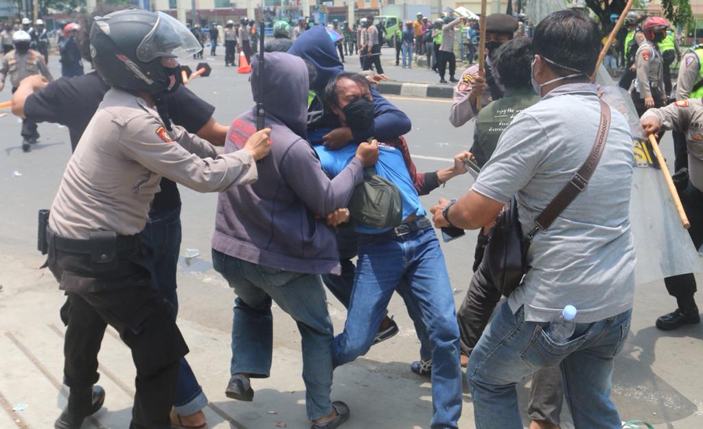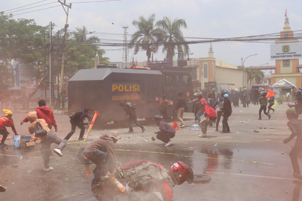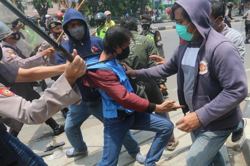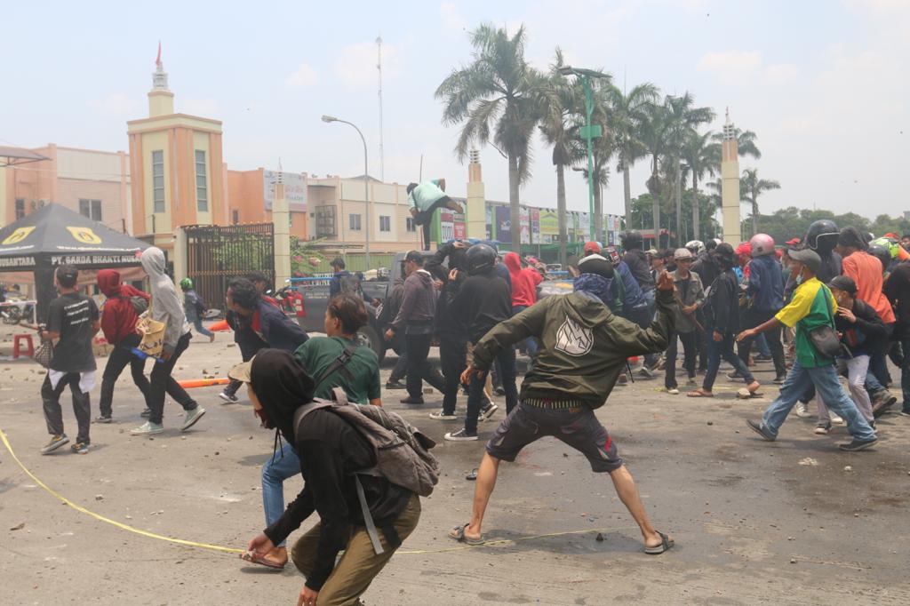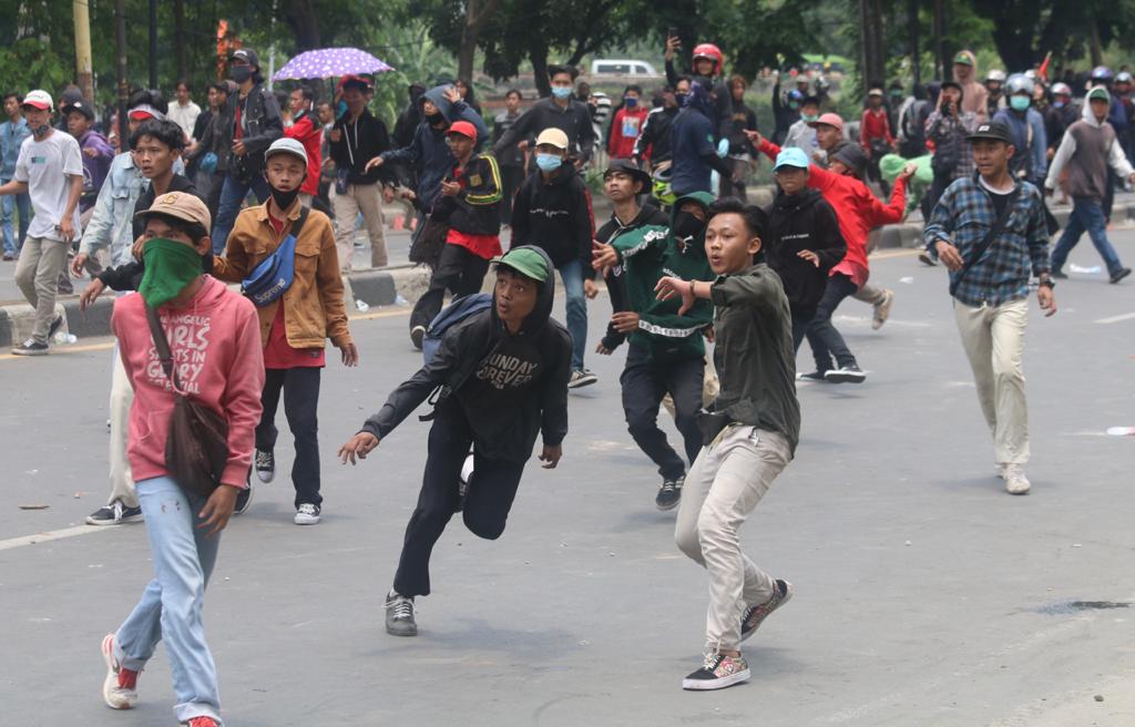 Masa Aksi unjuk rasa menolak UU Cipta Kerja Omnibus Law terlibat bentok dengan Aparat Kepolisian di Jalan Daan Mogot, Kota Tangerang Bante, Kamis (8/10). Bentrokan dipicu dihadangnya masa aksi yang ingin ke Jakarta oleh polisi. Akibat rusuh ini sebuah mobil Polisi dirusak masa. Foto/ Rendi Tri Kurniawan