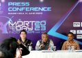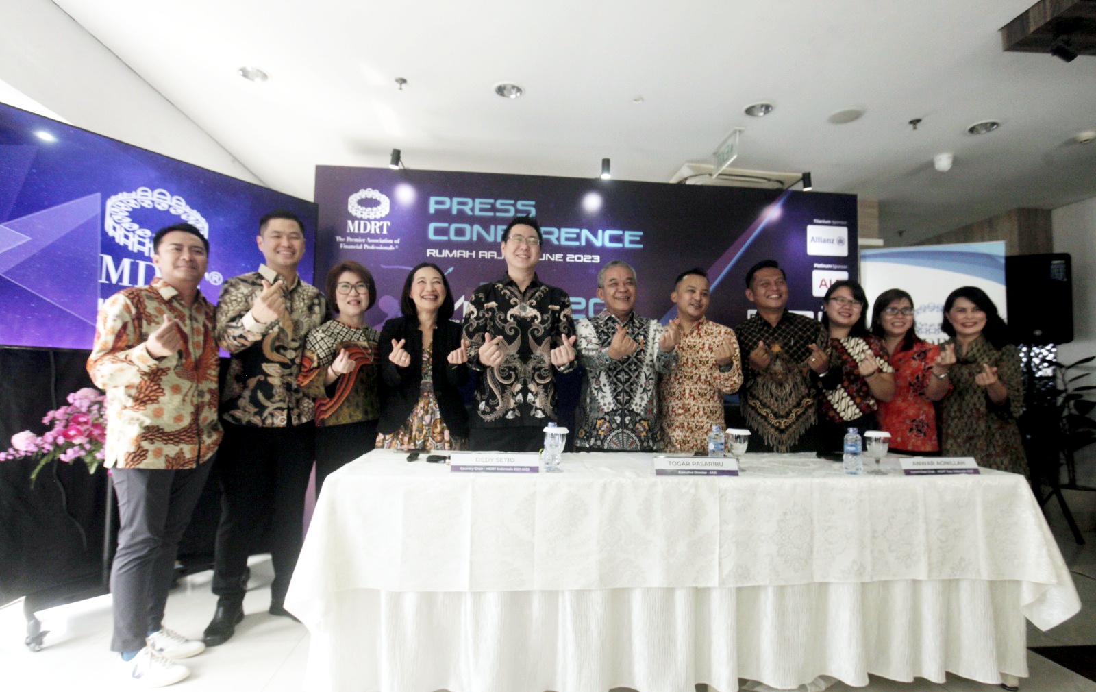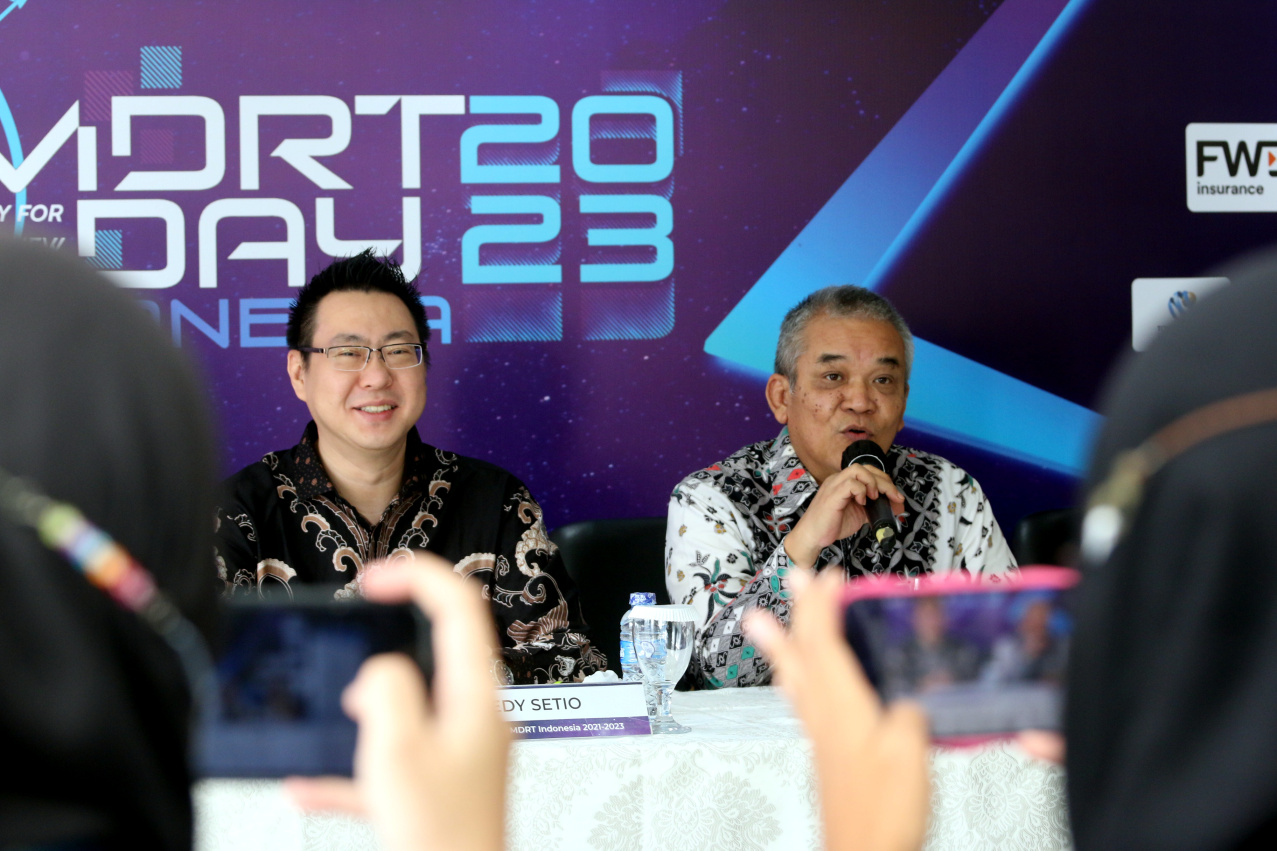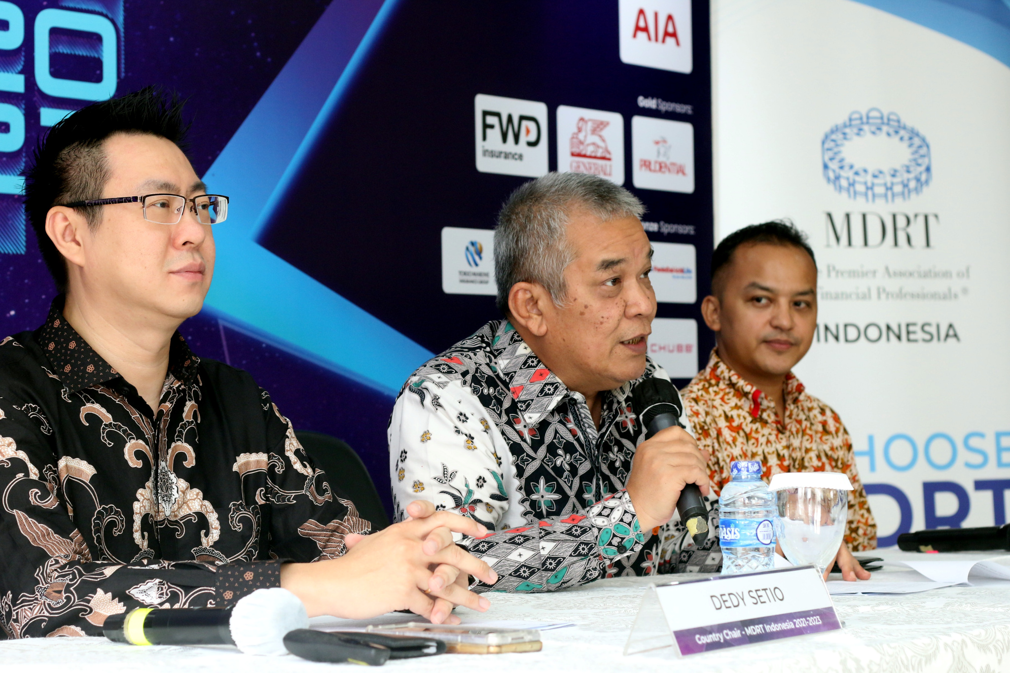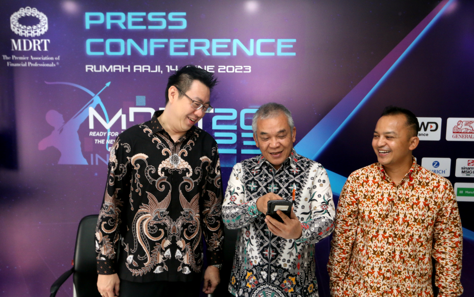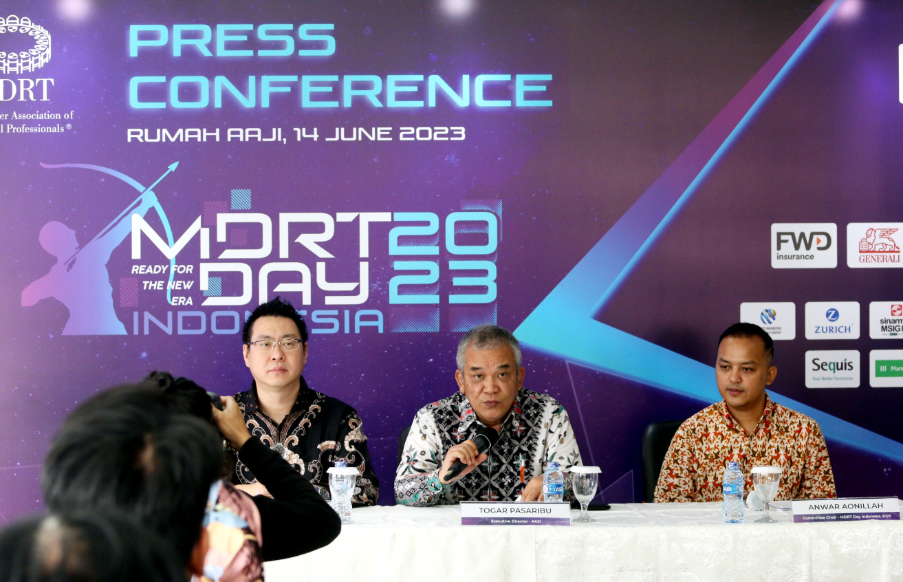 Direktur Eksekutif Asosiasi Asuransi Jiwa Indonesia (AAJI) Togar Pasaribu (tengah) berbincang dengan Country Chair Million Dollar Round Table (MDRT) Indonesia Dedy Setio (kiri) dan Committee Chair of MDRT Day Indonesia 2023 Anwar Aonillah disela memberikan keterangan terkait penyelenggaraan MDRT Day Indonesia 2023 di Jakarta, Rabu (14/6). MDRT Indonesia kembali menyelenggarakan MDRT Day Indonesia 2023 dengan tema “Ready For The New Era” yang akan digelar pada tanggal 13 Juli 2023 di ICE BSD, Tangerang Selatan.