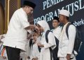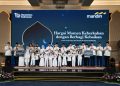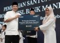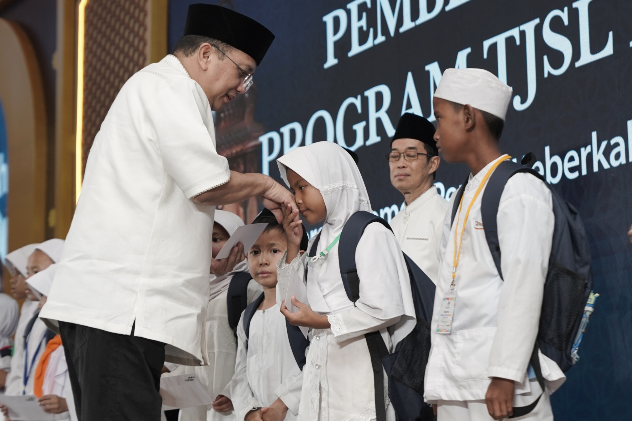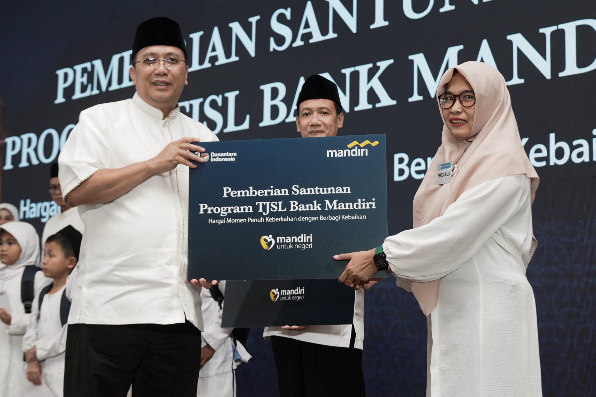 Direktur Utama Bank Mandiri Riduan bersama Jajaran Dewan Komisaris dan Direksi Bank Mandiri menyerahkan santunan Ramadan kepada perwakilan penerima manfaat di Menara Mandiri, Jakarta, Senin (16/3). Melalui program Mandiri Berbagi Kebaikan, Mandiri Group menyerahkan 114.000 paket berupa perlengkapan sekolah bagi anak-anak yatim, paket vitamin kesehatan untuk lansia, hingga dukungan lain yang dibutuhkan bagi masyarakat di seluruh Indonesia sepanjang bulan Ramadan. Selain itu, Bank Mandiri menyiapkan fasilitas mudik bersama gratis dengan 80 kota tujuan yang dapat diikuti secara terbuka oleh masyarakat.
