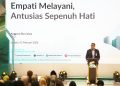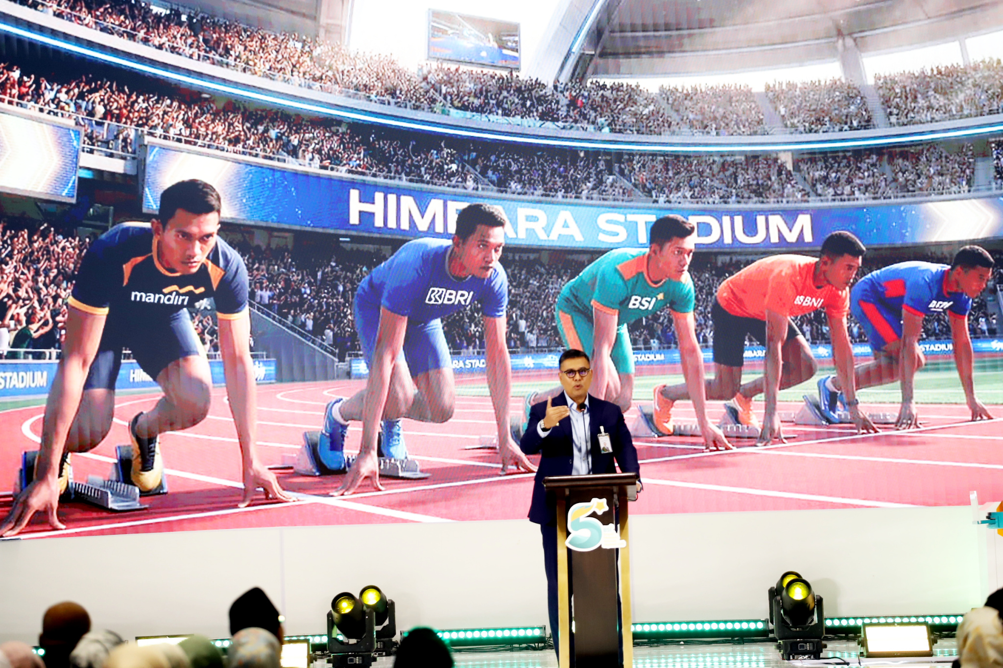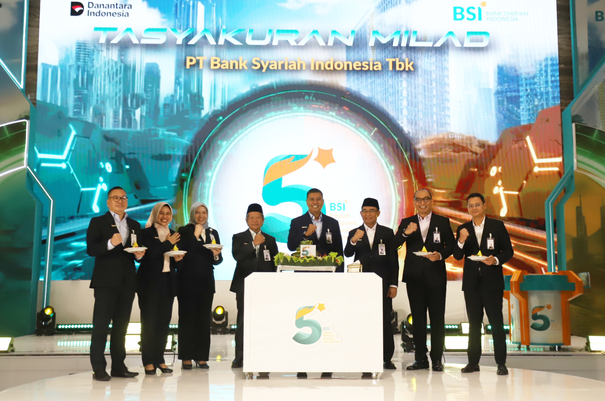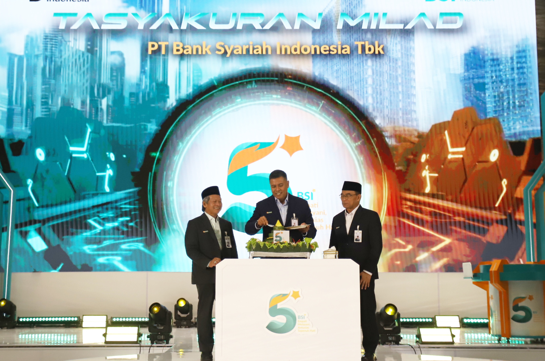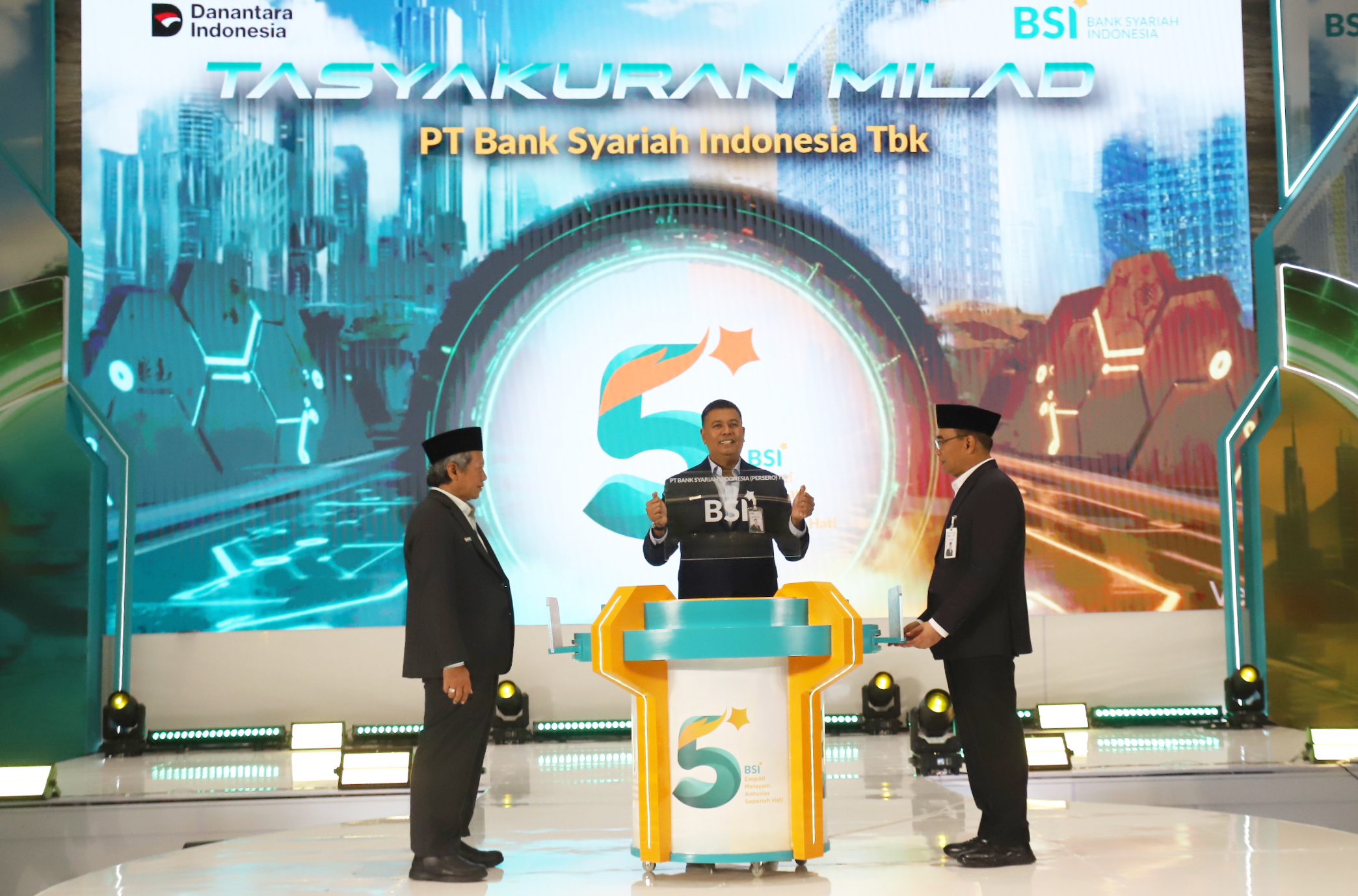 Direktur Utama PT Bank Syariah Indonesia (Persero) Tbk Anggoro Eko Cahyo didampingi Komisaris Utama BSI Prof Dr Muhadjir Effendy MAP (kanan) dan Dewan Pengawas Syariah BSI ProfDr KH Hasanudin (kiri) meresmikan penyesuaian nama perseroan menjadi PT Bank Syariah Indonesia (Persero) Tbk pada momen Tasyakuran Milad ke-5. Pada acara tersebut juga diluncurkan campaign Langkah EMAS Generasi E.M.A.S (Ekosistem Mudah Aman Syariah) di Kantor BSI Tower Jakarta,Senin(2/2/2026). Kampanye sekaligus sebagai sosialisasi positioning BSI sebagai bank emas pertama di Indonesia dan mengajak masyarakat Indonesia dengan investasi emas yang mudah, aman, sesuai syariah.