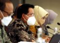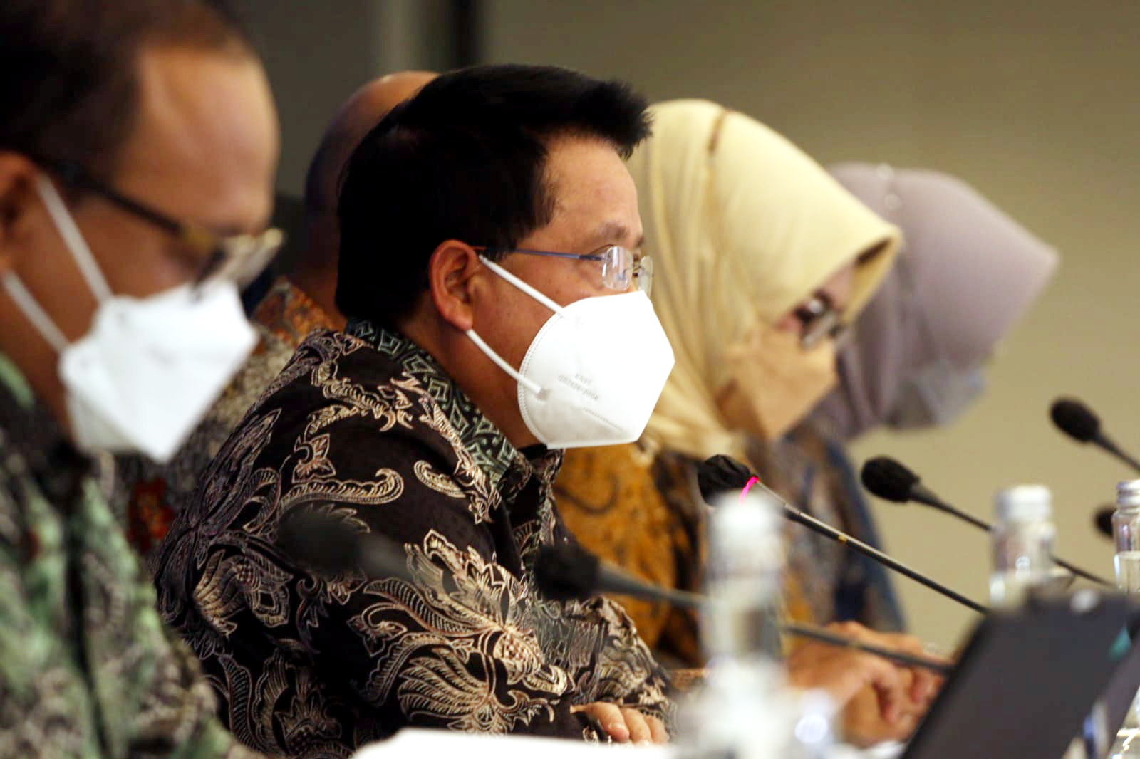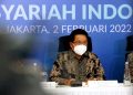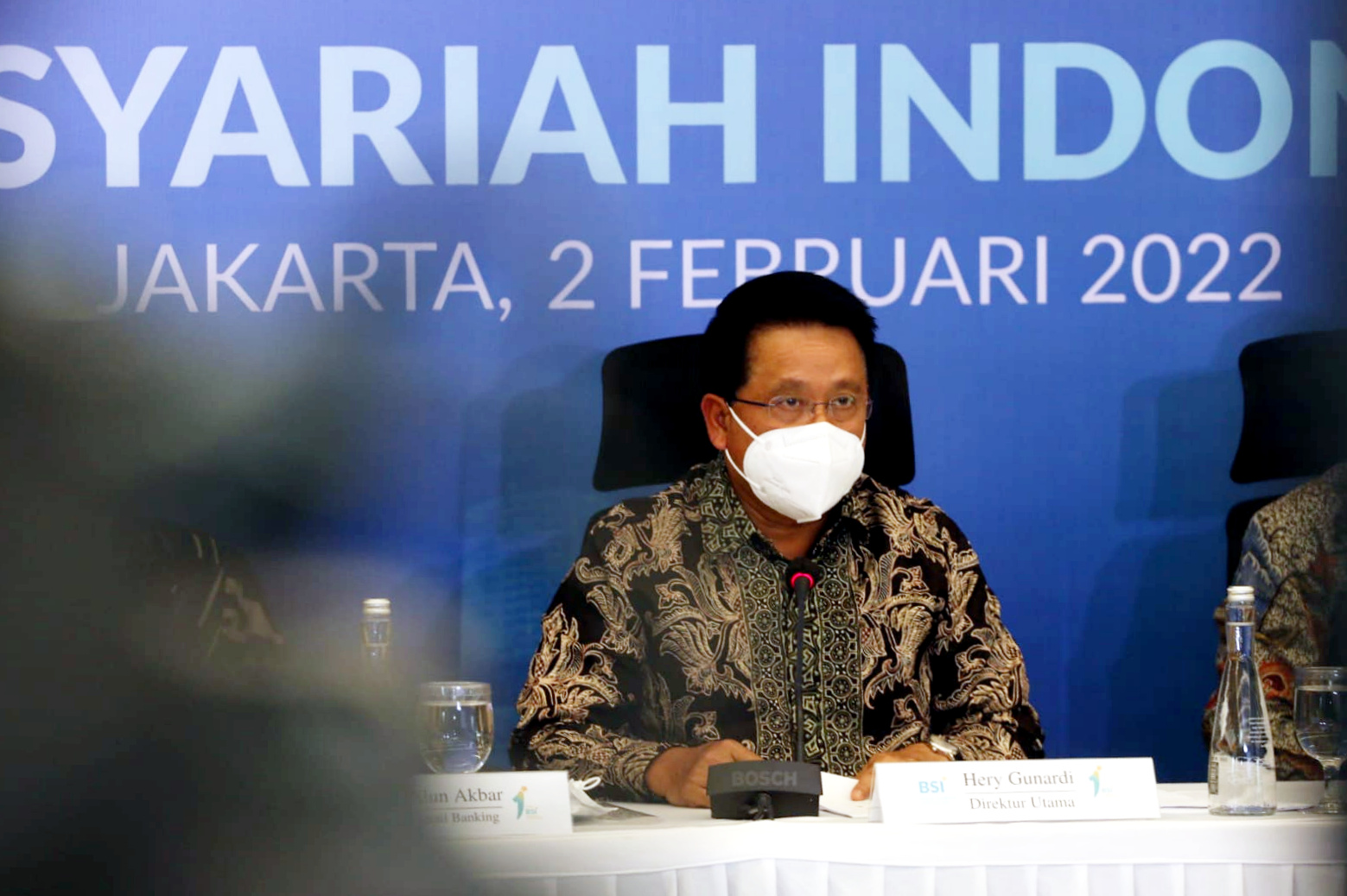 Direktur Utama PT Bank Syariah Indonesia Tbk (BSI) BSI Hery Gunardi (tengah) didampingi Direktur Information Technology BSI Achmad Syafii (paling kiri), Direktur Retail Banking BSI Kokok Alun Akbar (dua dari kiri), Direktur Finance & Strategy BSI Ade Cahyo Nugroho (empat dari kiri), Direktur Risk Management BSI Tiwul Widyastuti (lima dari kiri) dan Direktur Compliance & Human Capital BSI Tribuana Tunggadewi diskusi (lima dari kanan) diskusi bersama saat Press Conference Pemaparan Kinerja PT Bank Syariah Indonesia Tbk Triwulan IV Tahun 2021 di Jakarta (2/2)