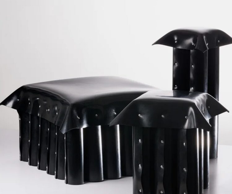 Selain itu, kursi dengan paku logam juga tampil dalam pameran Alcova. Tren ini membawa nuansa punk ke dalam dekorasi modern.