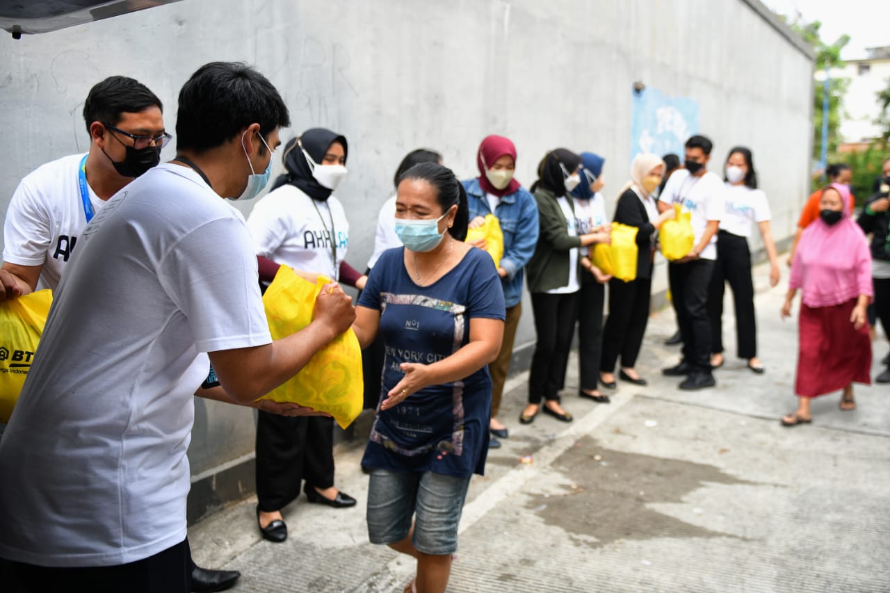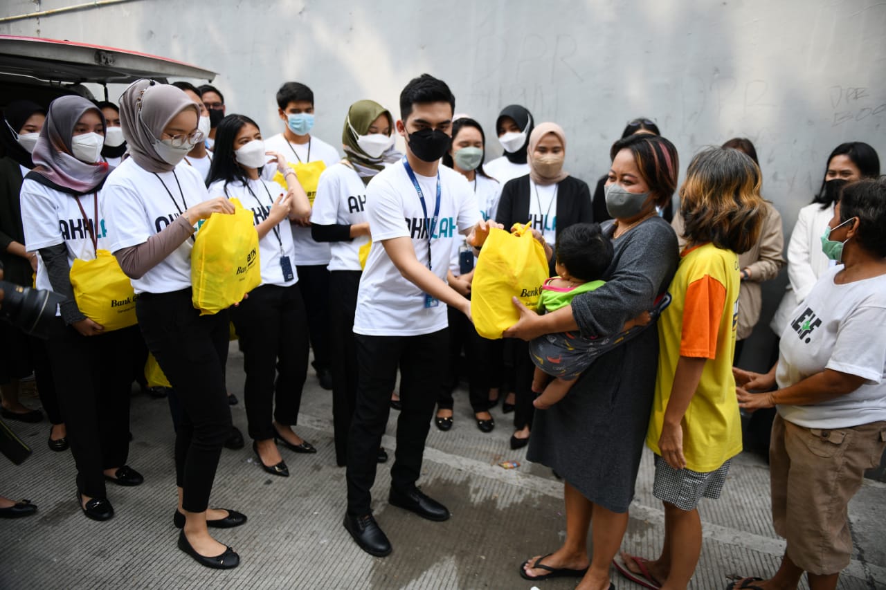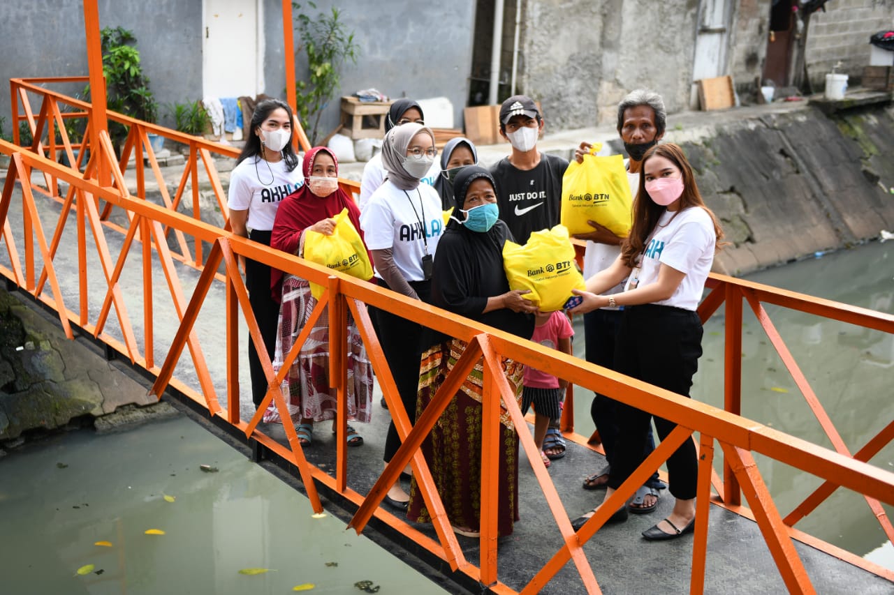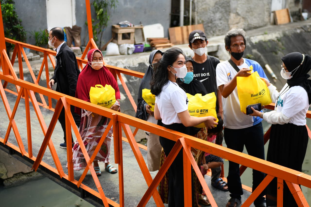 Karyawan usia milenial PT Bank Tabungan Negara (Persero) Tbk. membagikan bantuan paket sembako kepada masyarakat tidak mampu di sekitar kawasan Menara Bank BTN di Jakarta, Senin (11/4). Penyerahan ratusan paket sembako tersebut merupakan komitmen Bank BTN untuk memberikan manfaat bagi masyarakat Indonesia terutama dalam mendukung tercapainya pemenuhan hak dasar manusia. Bantuan bahan pangan tersebut juga disalurkan sebagai bentuk Tanggung Jawab Sosial dan Lingkungan (TJSL) Bank BTN sebagai bagian dari BUMN.