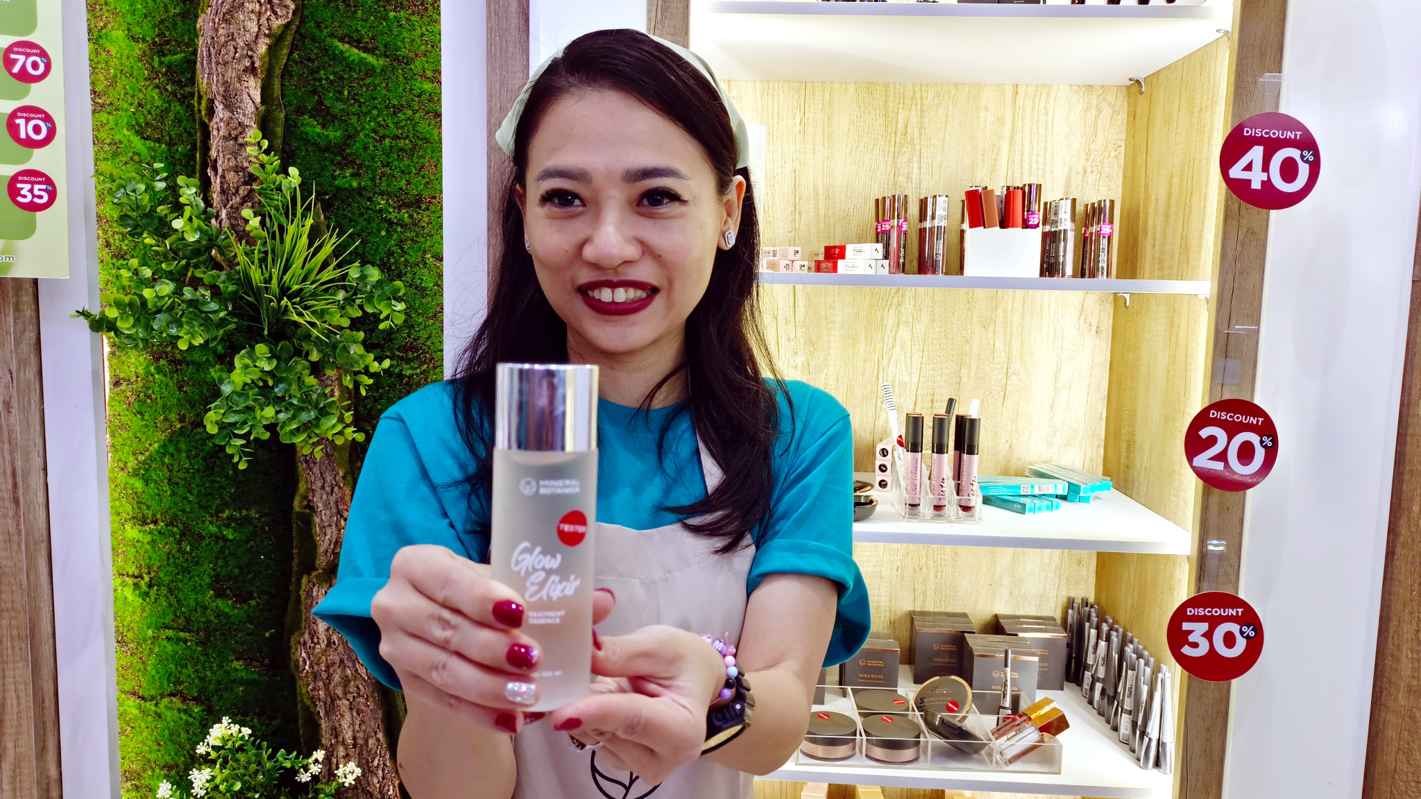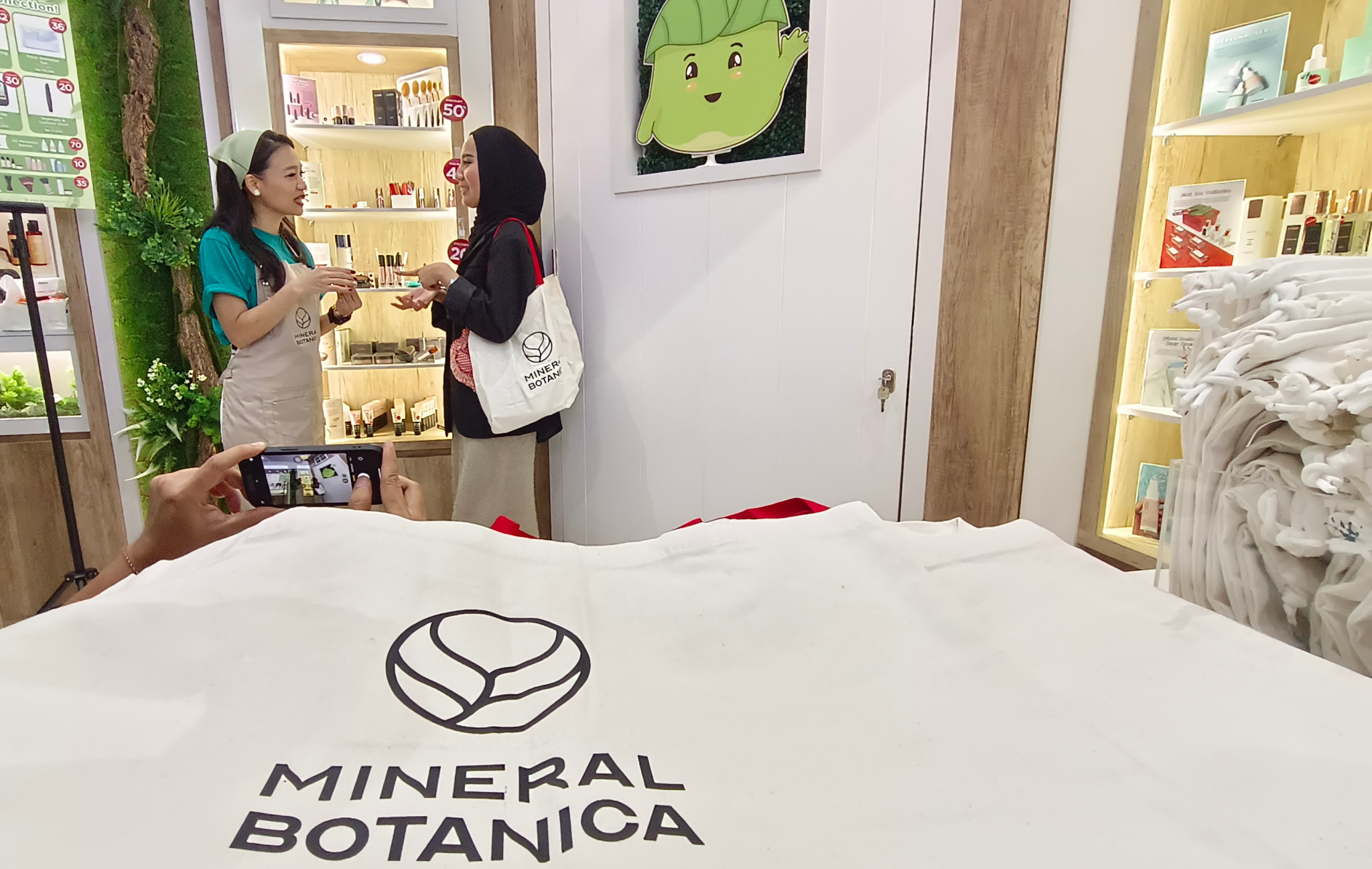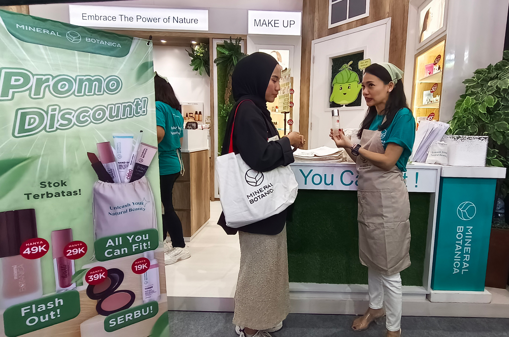 Co-Founder Mineral Botanica Anita berbincang kepada customer memperlihatkan produk terbaru ‘ Glow Elixir Treatment Essence’ di booth Mineral Botanica pada acara Jakarta X Beauty 2023 di di Jakarta 03 Agustus 2023 di Hall A JCC Senayan. Mineral botanica memperkenalkan varian baru untuk para pecinta lip cream, dengan menambahkan varian warna baru yang lebih soft dan nude pada produk lipcream terbaiknya, The Grail Soft Matte Lip Cream, dan The Grail Lipmousse yang lebih ringan dengan warna-warna cerah dan terjangkau sehingga cocok digunakan bahkan oleh anak remaja.