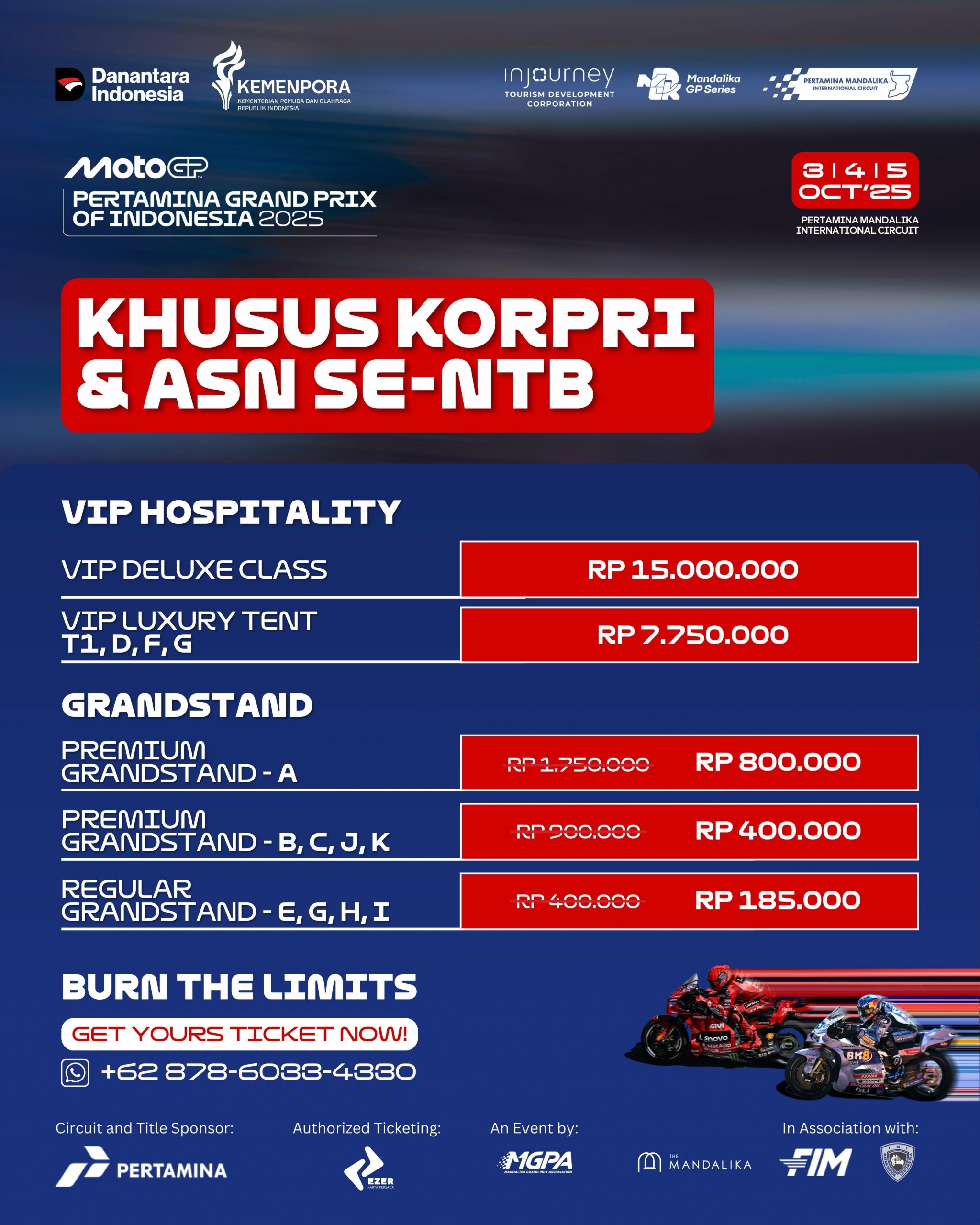 Sebagai wujud apresiasi, penyelenggara menghadirkan program harga tiket spesial bagi pemilik KTP NTB dan Aparatur Sipil Negara (ASN) se-NTB. Inisiatif ini membuka kesempatan lebih besar bagi masyarakat lokal untuk merasakan langsung atmosfer MotoGP Mandalika dengan biaya yang lebih terjangkau.
