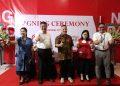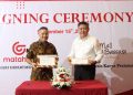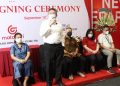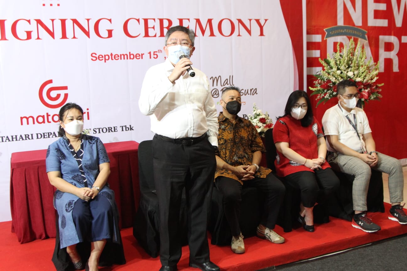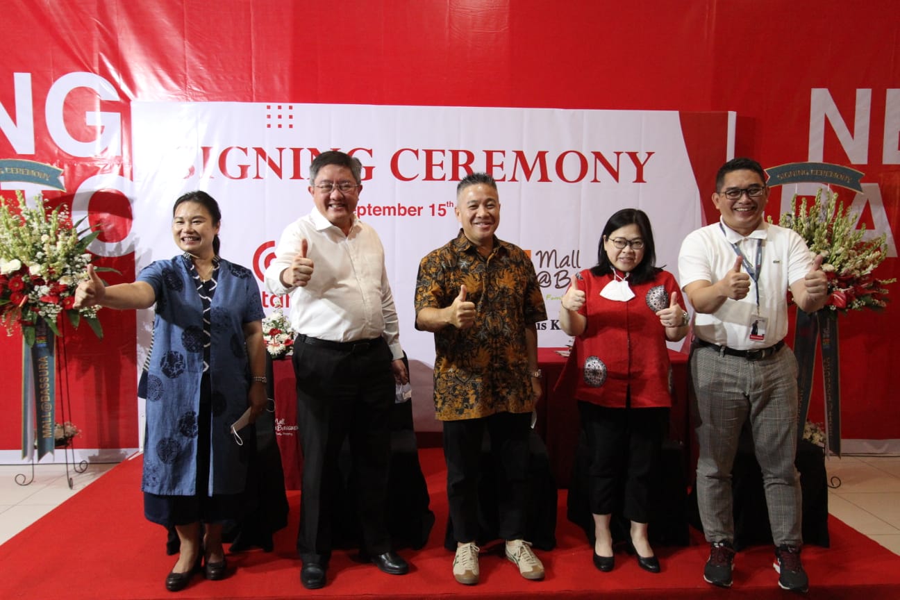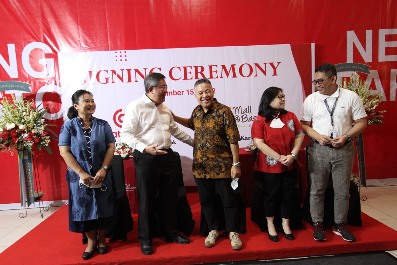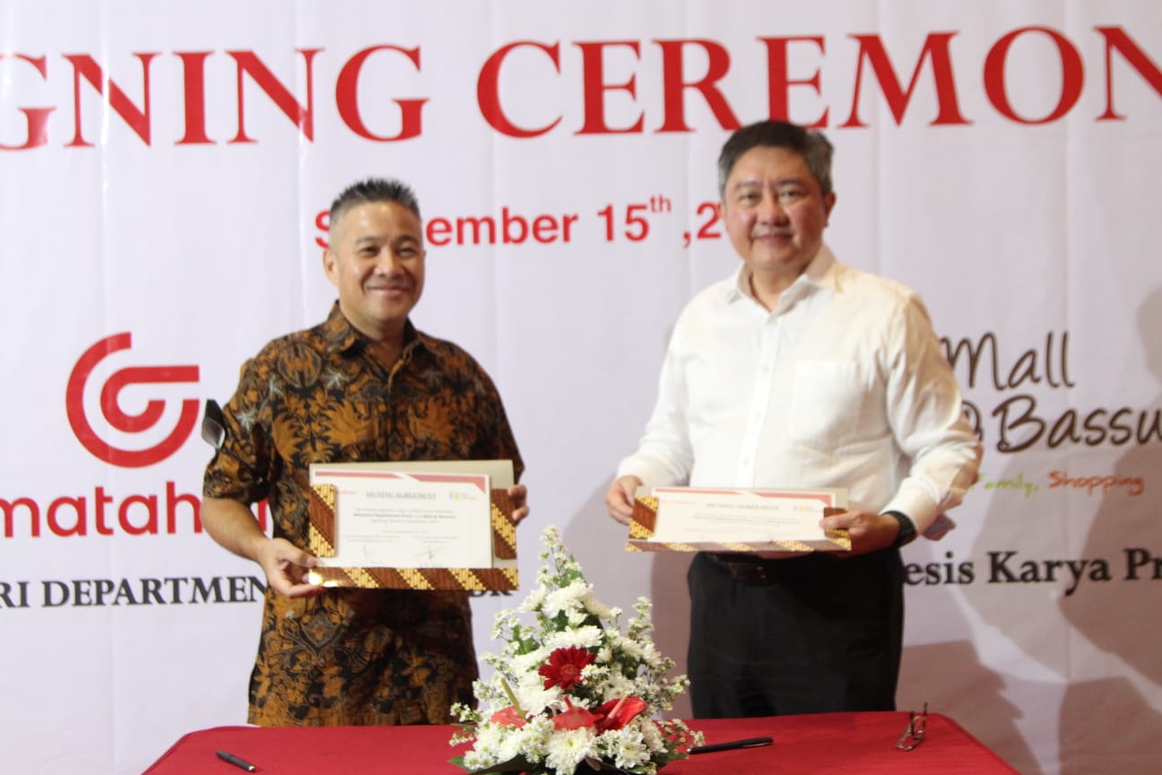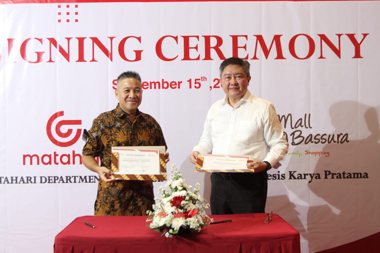 Irwin Abuthan, Direktur Real Estate & Store Planing PT Matahari Departement Store Tbk (kiri), Budi Yanto Lusli, CEO Synthesis Development (kanan). saat penandatanganan kerja sama Mall @Bassura dengan Matahari Departemen Store, Kamis (15/9/2022) yang dihadiri juga oleh