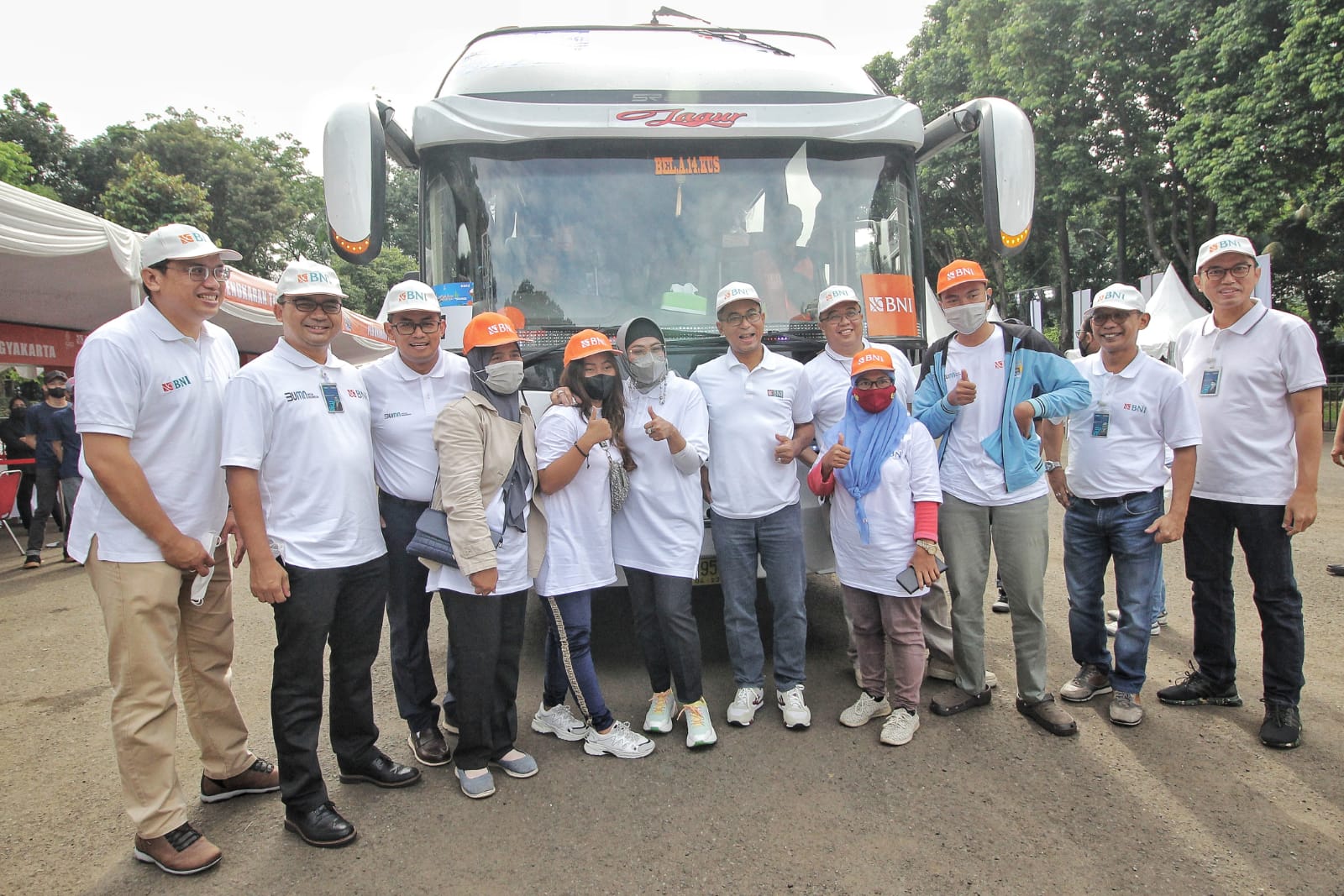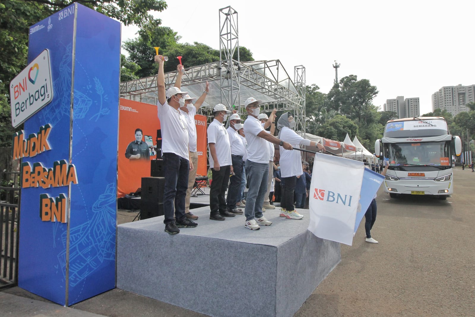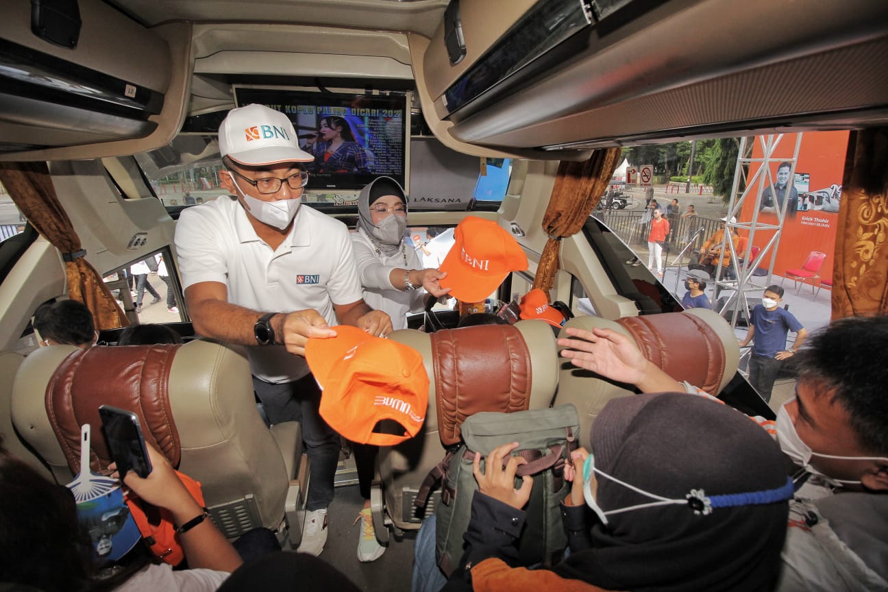 Wakil Direktur Utama BNI Adi Sulistyowati (kanan) didampingi Direktur Layanan dan Jaringan BNI Ronny Venir (tengah) berbincang dengan peserta Mudik Aman Mudik Sehat Bersama BUMN 2022 di kawasan Gelora Bung Karno (GBK), Senayan, Jakarta, Rabu (27/4/2022). BNI menyediakan kuota sebanyak 1.000 orang dengan moda transportasi bus jurusan Palembang via Lampung, Yogyakarta via Solo, Malang, Surabaya, dan Semarang.