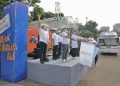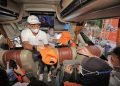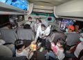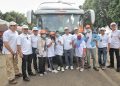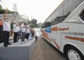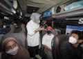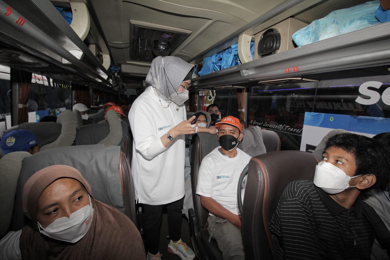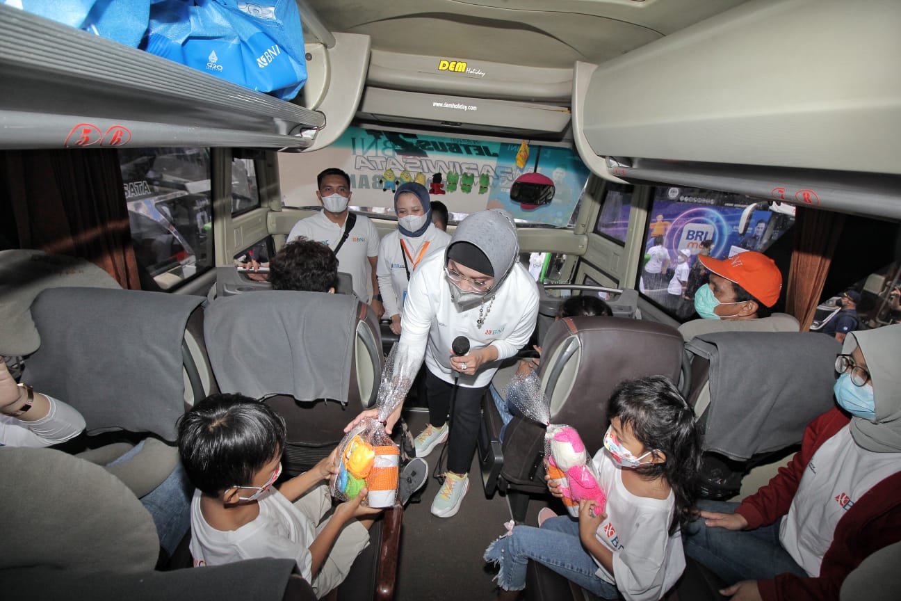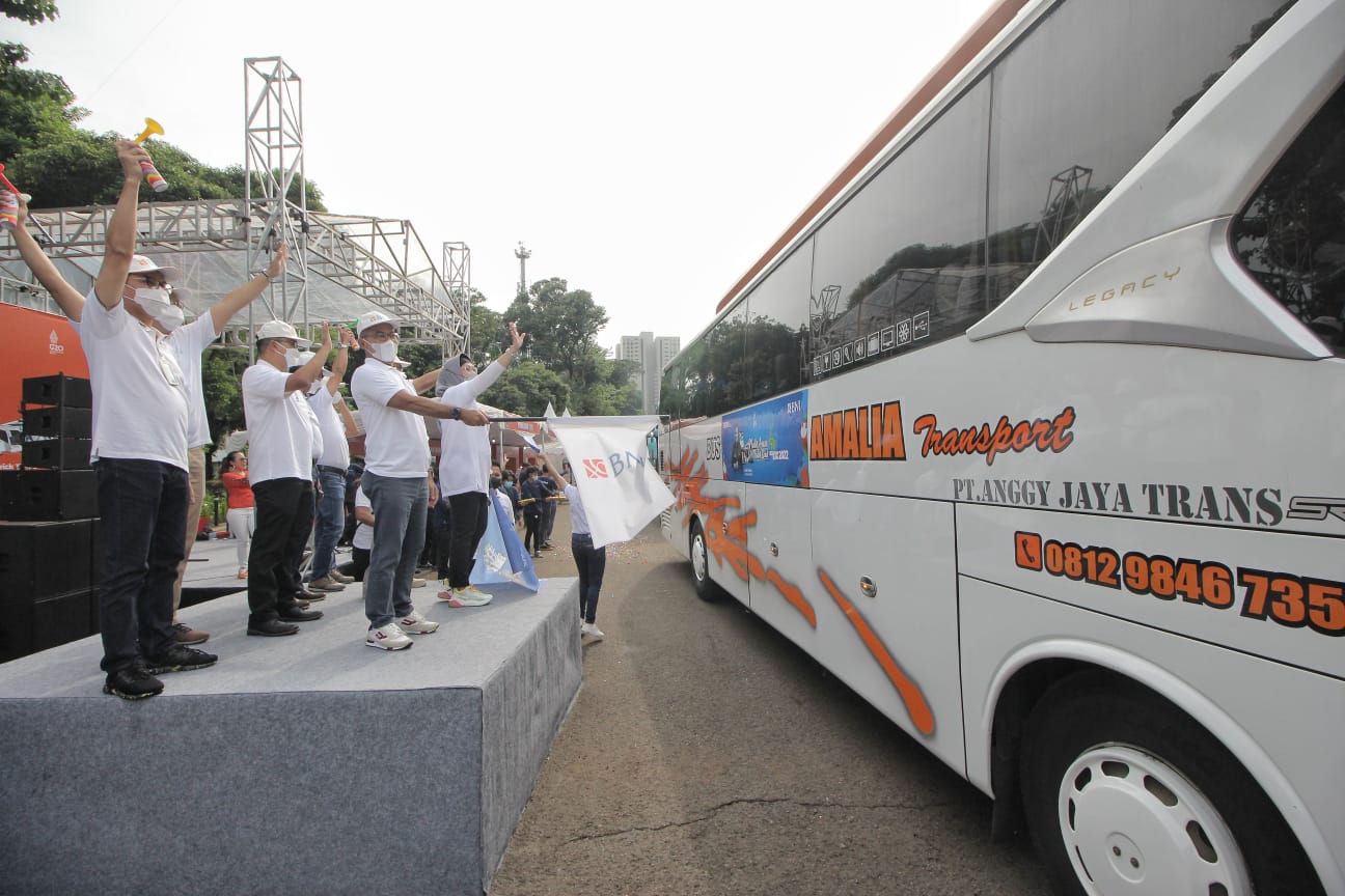 Wakil Direktur Utama BNI Adi Sulistyowati (kanan) didampingi Direktur Layanan dan Jaringan BNI Ronny Venir (tengah) berbincang dengan peserta Mudik Aman Mudik Sehat Bersama BUMN 2022 di kawasan Gelora Bung Karno (GBK), Senayan, Jakarta, Rabu (27/4/2022). BNI menyediakan kuota sebanyak 1.000 orang dengan moda transportasi bus jurusan Palembang via Lampung, Yogyakarta via Solo, Malang, Surabaya, dan Semarang.