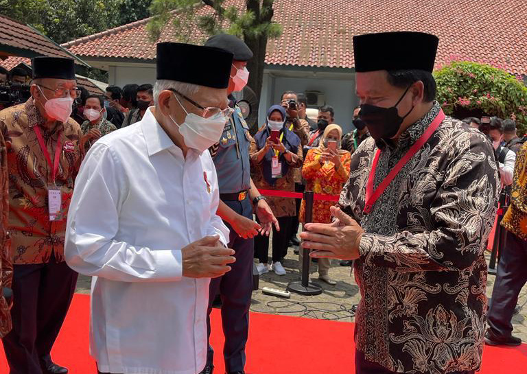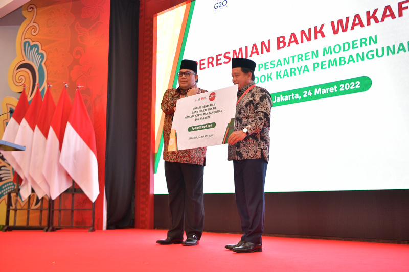 Bank Wakaf Mikro Pesantren Modern Pondok Karya Pembangunan di DKI Jakarta tersebut diresmikan oleh Wakil Presiden RI KH. Ma’ruf Amin (kiri) dan dihadiri oleh Direktur Utama BSI sekaligus Pembina LAZ BSMU Hery Gunardi (kanan) di Pesantren Modern Pondok Karya Pembangunan (PKP) di Jakarta, Kamis (24/3). PT Bank Syariah Indonesia Tbk (BSI) mendukung Otoritas Jasa Keuangan (OJK) dalam mendorong pertumbuhan Usaha Mikro Kecil dan Menengah (UMKM) di Indonesia lewat Bank Wakaf Mikro (BWM). Salah satunya dengan membentuk Bank Wakaf Mikro (BWM) pertama di DKI Jakarta yaitu BWM Syariah di Pesantren Modern Pondok Karya Pembangunan (PKP).