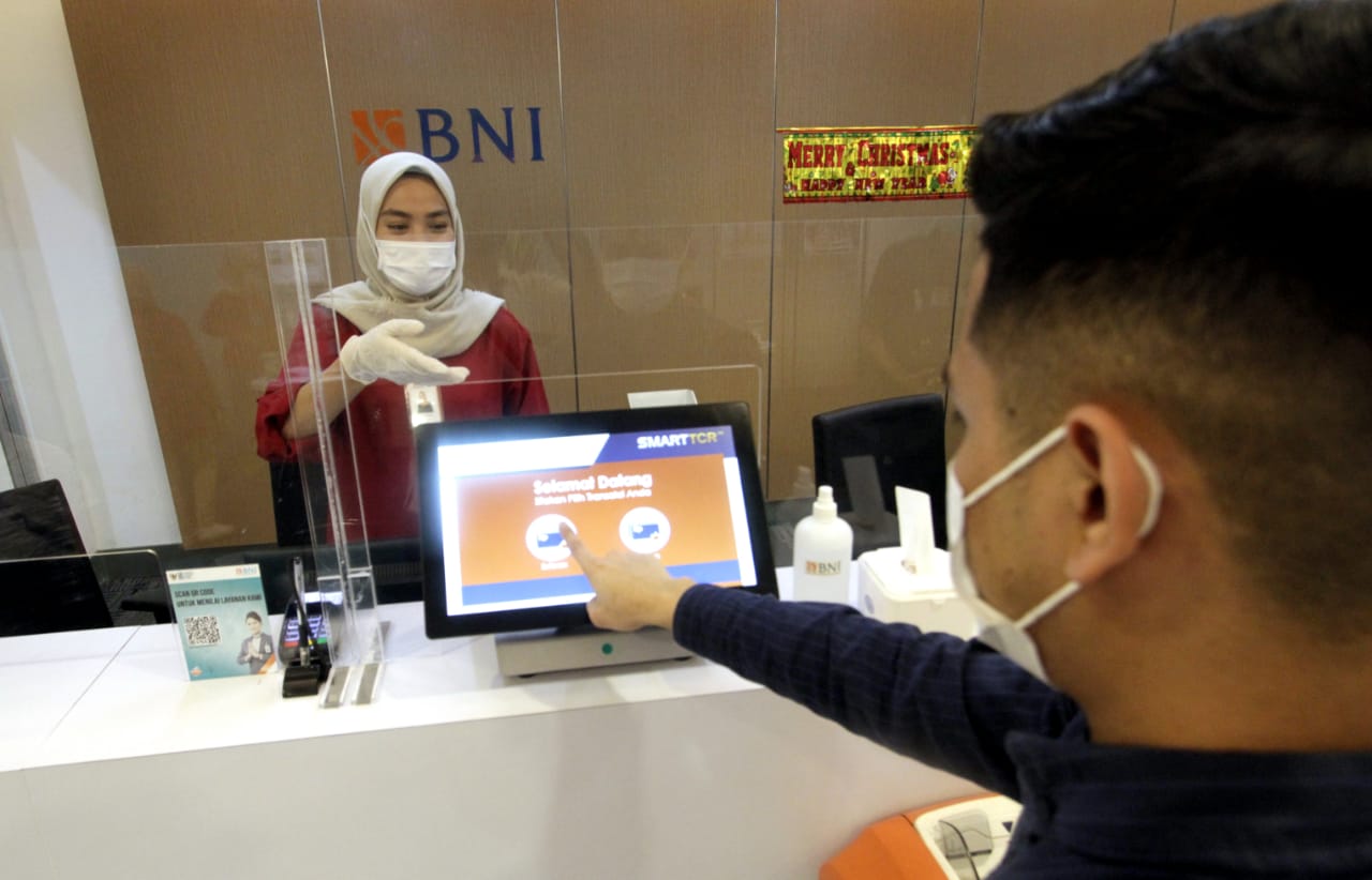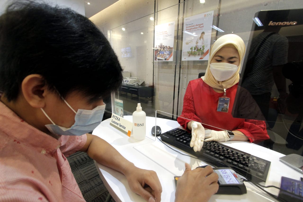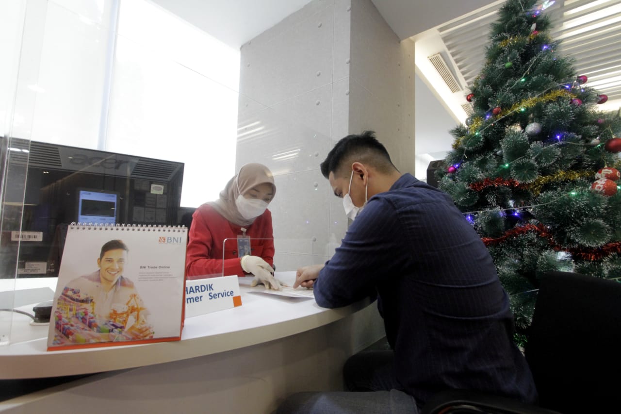 Petugas Customer Service sedang melayani nasabah dengan pembukaan rekening baru BNI Sonic sekaligus memberikan souvenir Natal dan Tahun Baru pada operasional terbatas BNI di Jakarta, Kamis (31 Desember 2020). Selama masa liburan akhir tahun 2020, BNI mengoperasikan 201 outlet di seluruh Indonesia dengan tetap menerapkan protokol kesehatan.