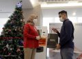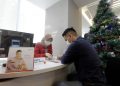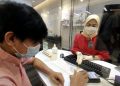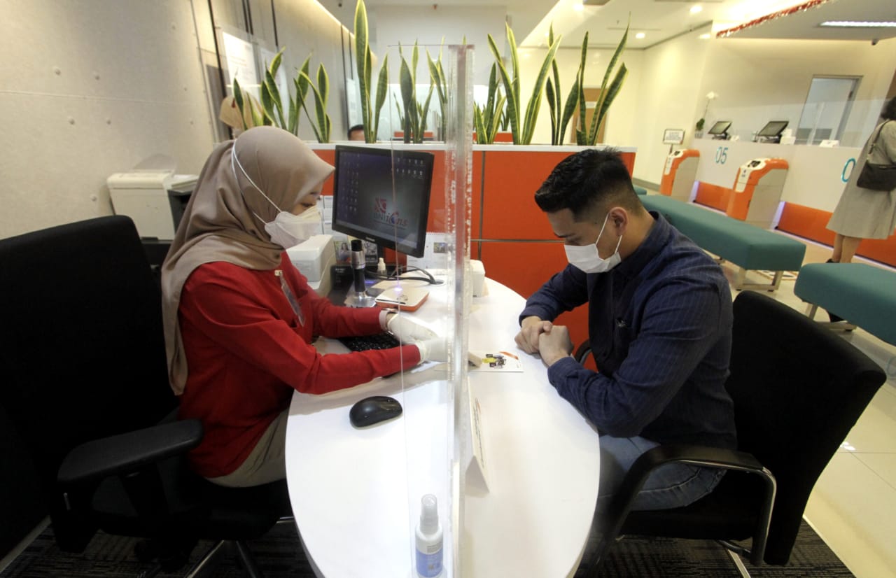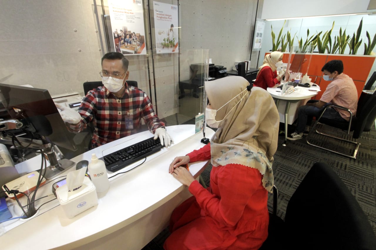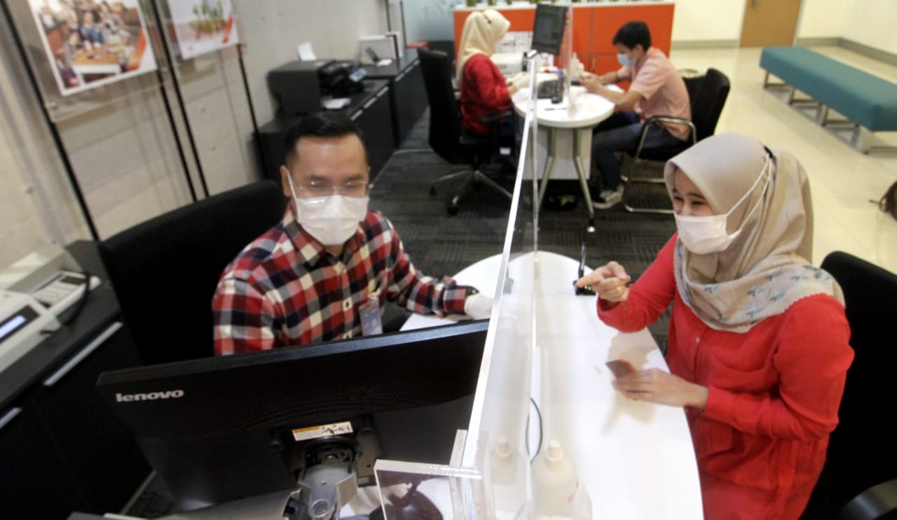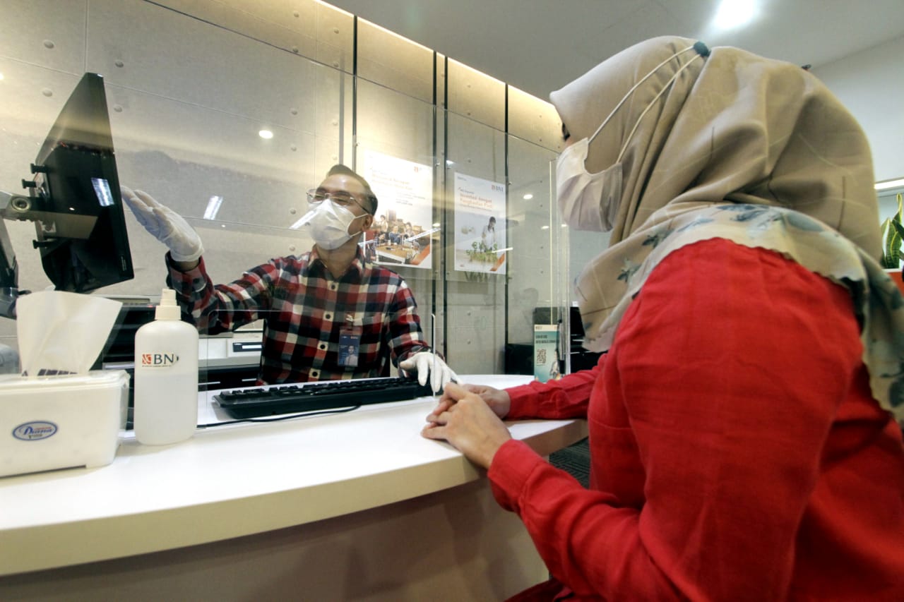 Petugas Customer Service sedang melayani nasabah dengan pembukaan rekening baru BNI Sonic sekaligus memberikan souvenir Natal dan Tahun Baru pada operasional terbatas BNI di Jakarta, Kamis (31 Desember 2020). Selama masa liburan akhir tahun 2020, BNI mengoperasikan 201 outlet di seluruh Indonesia dengan tetap menerapkan protokol kesehatan.