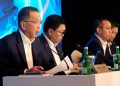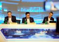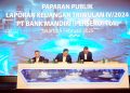 (Kika) Direktur Teknologi Informasi Bank Mandiri Tim Utama, Direktur Utama Bank Mandiri Darmawan Junaidi, dan Direktur Keuangan dan Strategi Sigit Prastowo sedang berbincang saat menyampaikan paparan kinerja Bank Mandiri Triwulan IV-2024 di Jakarta, Rabu (5/2). Bank Mandiri berhasil mendorong pertumbuhan kredit secara konsolidasi sebesar 19.5% YoY pada 2024, atau dua kali lipat dari industri menjadi Rp1.670,55 triliun menyusul agresifitas perseroan dalam mengoptimalkan ekosistem segmen wholesale. Strategi ini terbukti ampuh dalam menjaga konsistensi pertumbuhan bisnis perseroan, serta menjaga laba bersih perseroan tetap tumbuh positif 1,31% YoY menjadi Rp55,8 triliun.