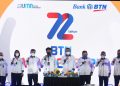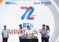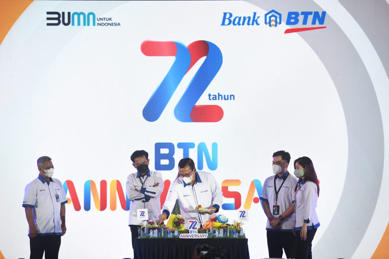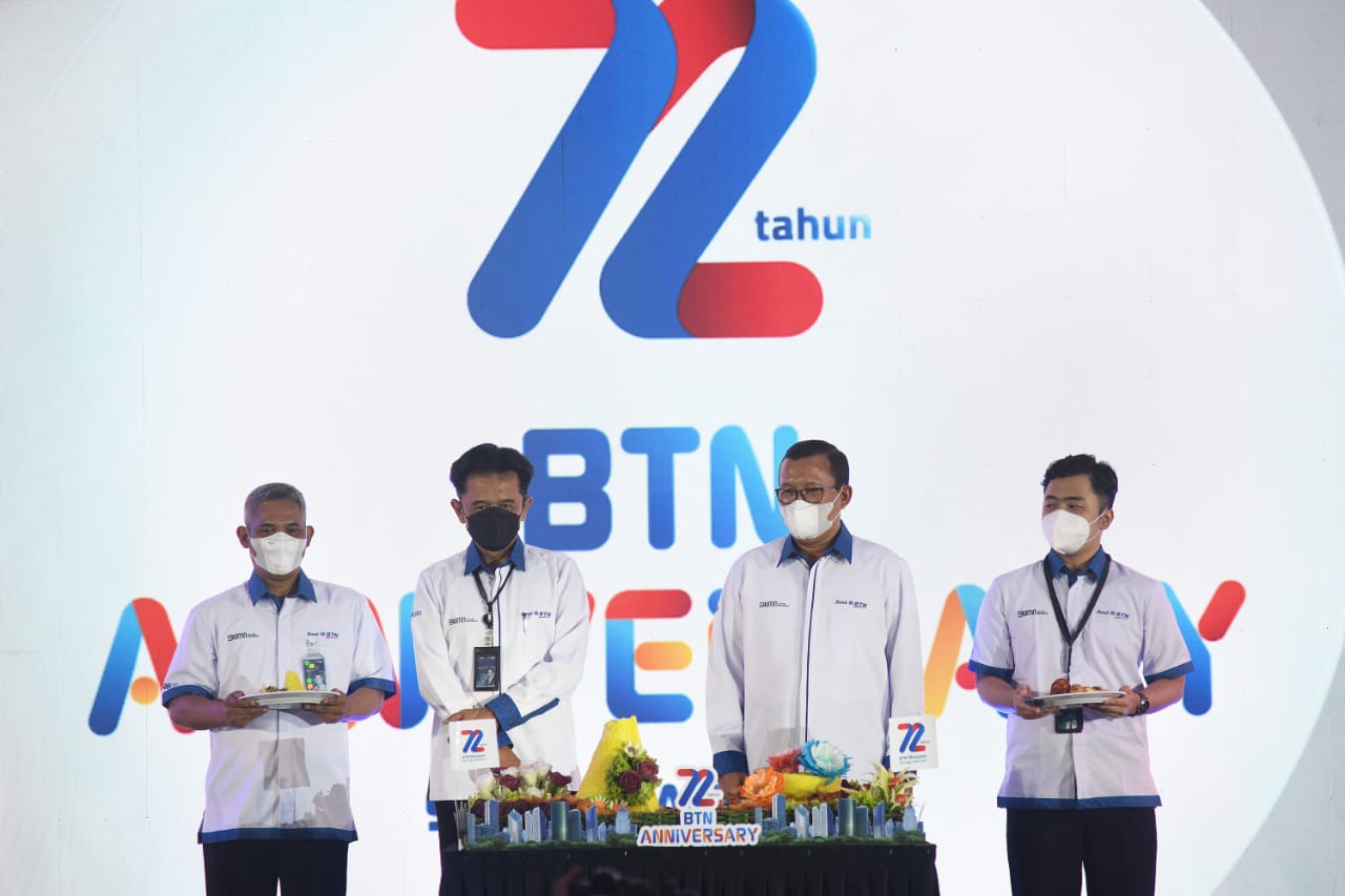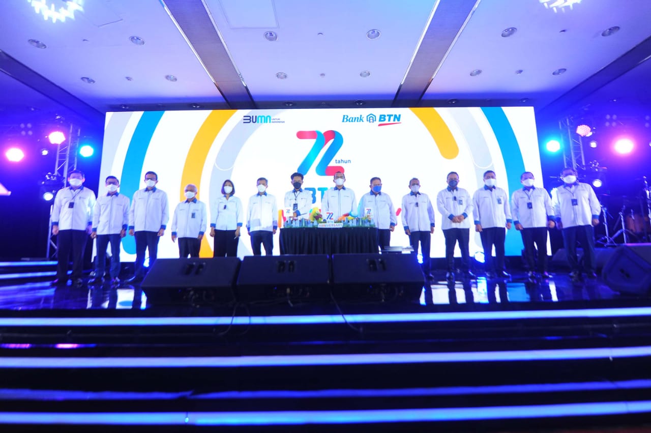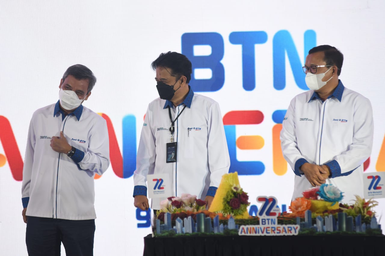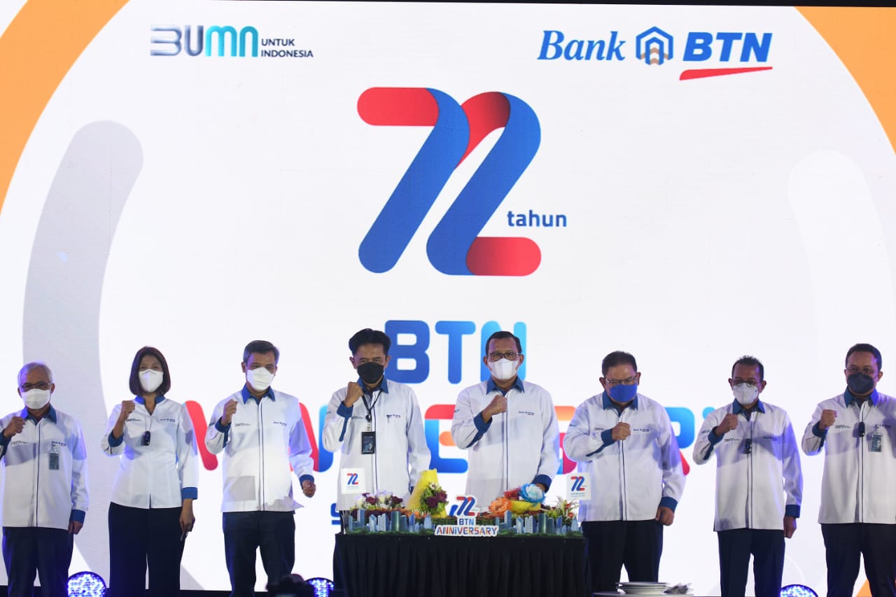 Direktur Utama Bank BTN Haru Koesmahargyo dan Komisaris Utama Bank BTN Chandra Hamzah bersama jajaran direksi dan komisaris Bank BTN berfoto bersama usai memotong tumpeng dalam perayaan HUT BTN ke-72 di Jakarta, Rabu (9/2). Dalam usia ke-72 tahun Bank BTN berkomitmen tetap menjadi pendamping pemerintah dan memegang peranan dalam pembiayaan perumahan untuk memudahkan masyarakat berpenghasilan rendah memiliki rumah layak dan menjadi motor penggerak program pemerintah dalam sejuta rumah. Dengan catatan positif kinerja tahun 2021, perseroan optimis dapat melalui tahun 2022 dengan baik sekaligus mewujudkan misi menjadi Best Mortgage Bank in Souteast Asia pada tahun 2025.