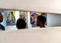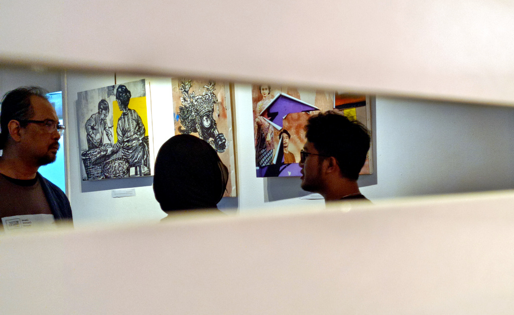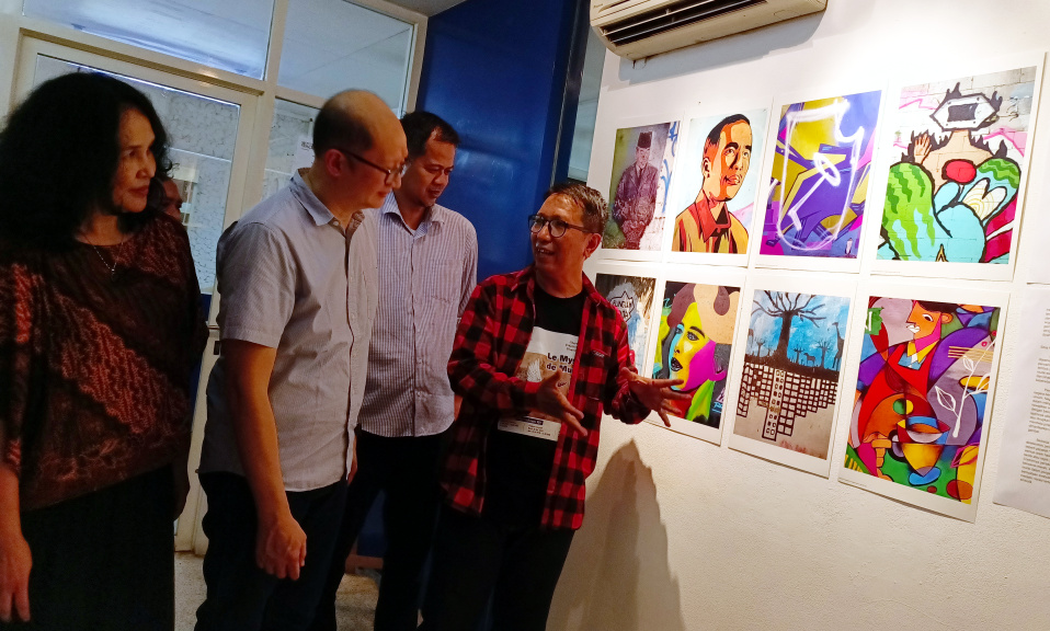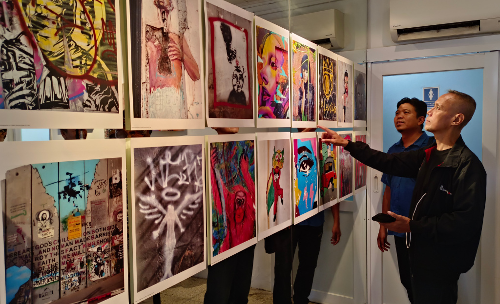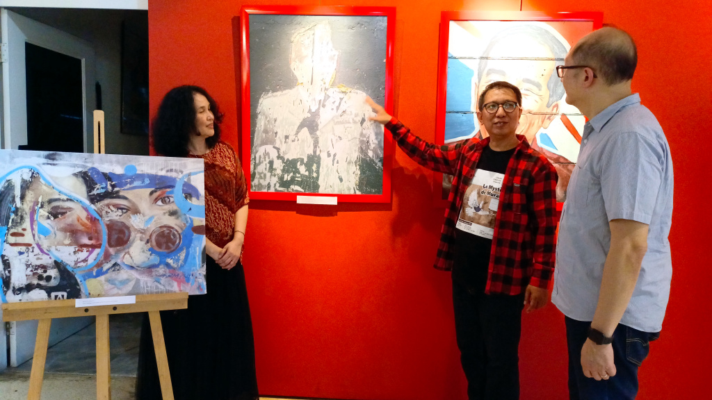 Direktur IFI Jakarta-Wijaya Syarah H Andriani (kanan), bersama Direktur PT Astra Graphia Tbk King Iriawan Sutanto (tengah) mendengarkan penjelasan Pewarta Foto Hasiolan Siahaan XIV (kiri) terkait karya fotonya saat pameran tunggal fotografi yang bertajuk “Le Mystere de Mural” di Gedung IFI Wijaya, Jakarta, Selasa (2/5/2023). Pameran fotografi yang menampilkan puluhan karya dari Hasiolan Siahaan XIV tersebut berlangsung hingga 3 Juni 2023.