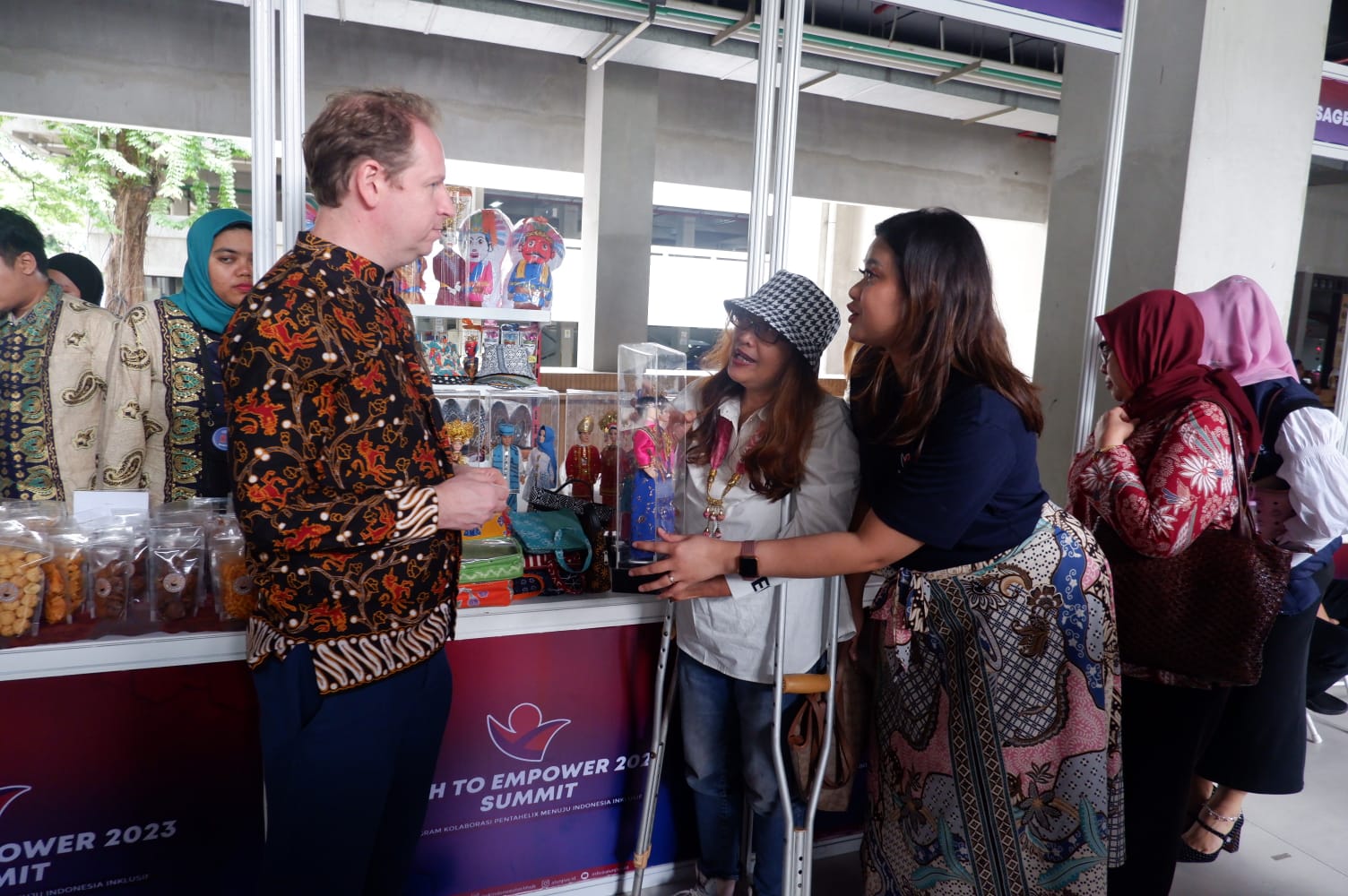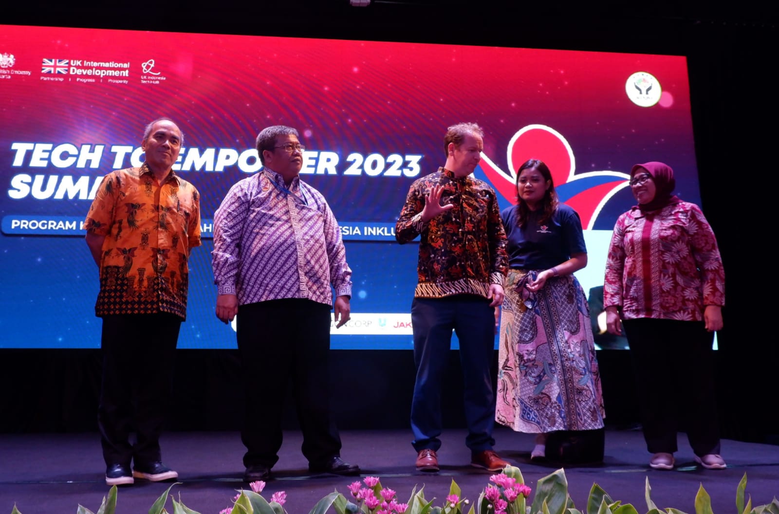 Dari kiri, Staf Ahli Menteri Bidang Produktivitas Dan Daya Saing Dr.Ir. Herbert Hot Ojahan Siagian, M.Sc bersama Komisioner Komisi nasional Disabilitas RI Jonna Aman Damanik, British Charge d’Affaires to Indonesia and Timor-Leste  Matthew Downing, Co-Founder Alunjiva Indonesia Fany Efrita serta Direktur Bina Penempatan Tenaga Kerja Dalam Negeri Kementerian Ketenagakerjaan Republik Indonesia Kustiati, S.E.,M.Si berbincang saat penyelenggaraan Tech to Empower Summit ketiga di Taman Ismail Marzuki. Kegiatan yang digagas Kedutaan Besar Inggris di Jakarta bersama AlunJiva Indonesia tahun ini bertema ‘Kolaborasi Pentahelix Menuju Indonesia Inklusif’. Dengan dukungan dari Komisi Nasional Disabilitas dan dihadiri oleh Kementerian Koperasi dan Usaha Kecil Menengah dan Kementerian Ketenagakerjaan. Di acara ini juga diluncurkan panduan mengenai disabilitas, yang dikembangkan sebagai bagian dari program Tech to Empower yang terdiri dari panduan untuk mempromosikan kesempatan kerja yang setara, serta panduan untuk mendukung entrepreneur penyandang disabilitas.