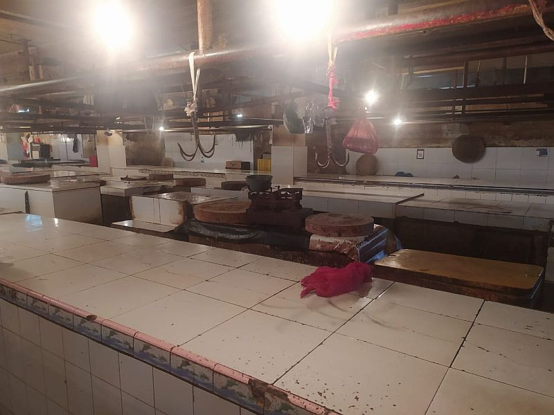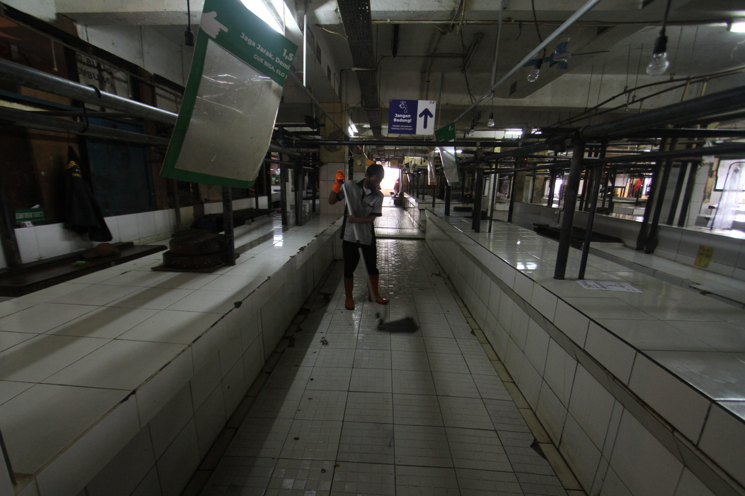 Petugas membersihkan lantai didepan lapak pedagang daging yang mogok di Pasar Kramat Jati, Jakarta, Rabu (20/1/2021). Pedagang daging sapi di wilayah Jabodetabek sepakat untuk mogok berjualan selama tiga hari, terhitung mulai Rabu (20/1/2021) hari ini hingga Jumat (22/1/2021) mendatang. Aksi mogok berjualan itu dilakukan sebagai bentuk protes atas melonjaknya harga daging sapi di rumah pemotongan hewan.