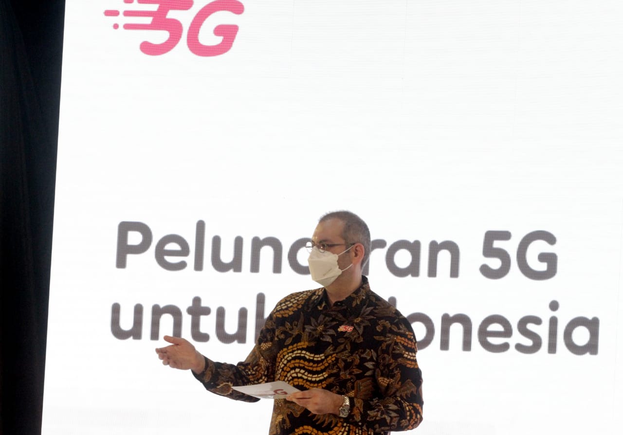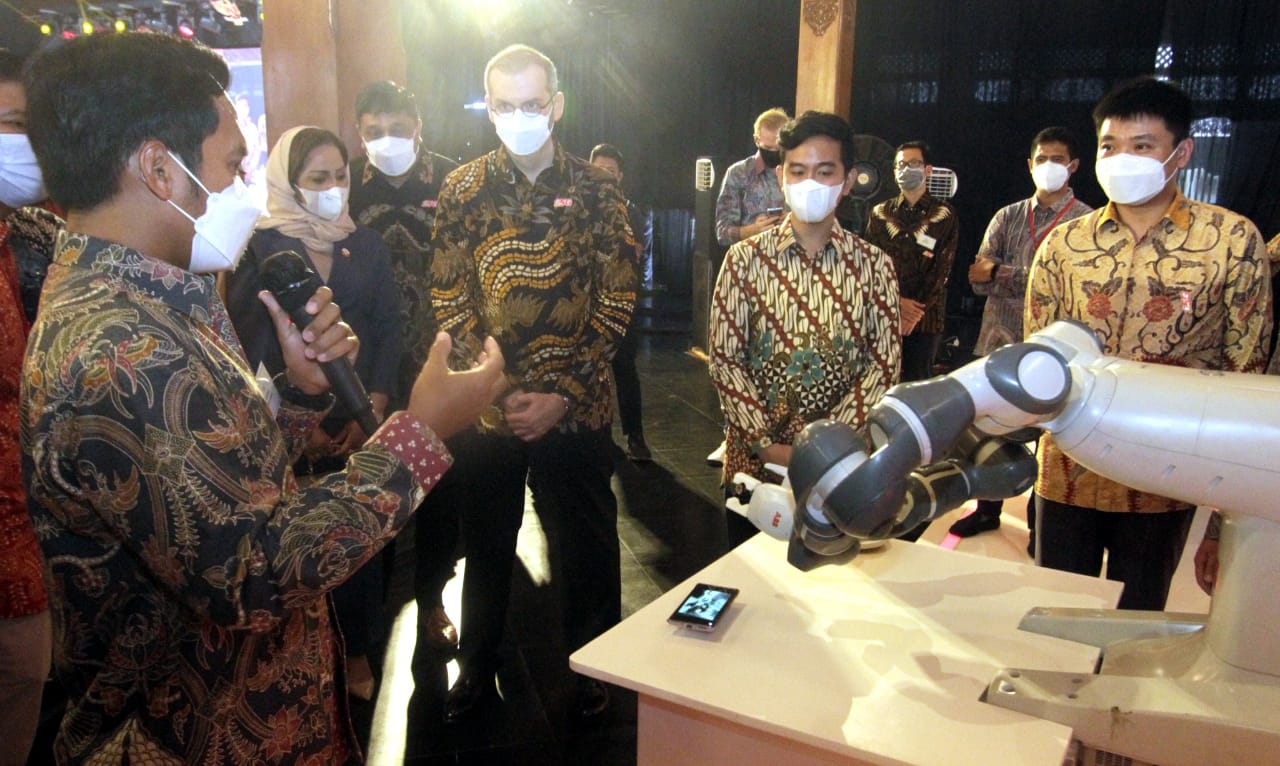 Presiden Direktur dan CEO Indosat Ooredoo Ahmad Al-Neama (kiri) bersama Wali Kota Solo Gibran Rakabuming Raka (kanan) melambaikan tangan saat acara Peluncuran Layanan 5G Indosat Ooredoo di Balai Kota Solo, Jawa Tengah, Selasa (22/6/2021). Indosat Ooredoo meluncurkan layanan jaringan 5G pertama di Kota Solo untuk mendukung akses internet yang lebih cepat serta membantu mewujudkan transformasi digital dan mendukung program pemulihan ekonomi Pemerintah Kota Solo.