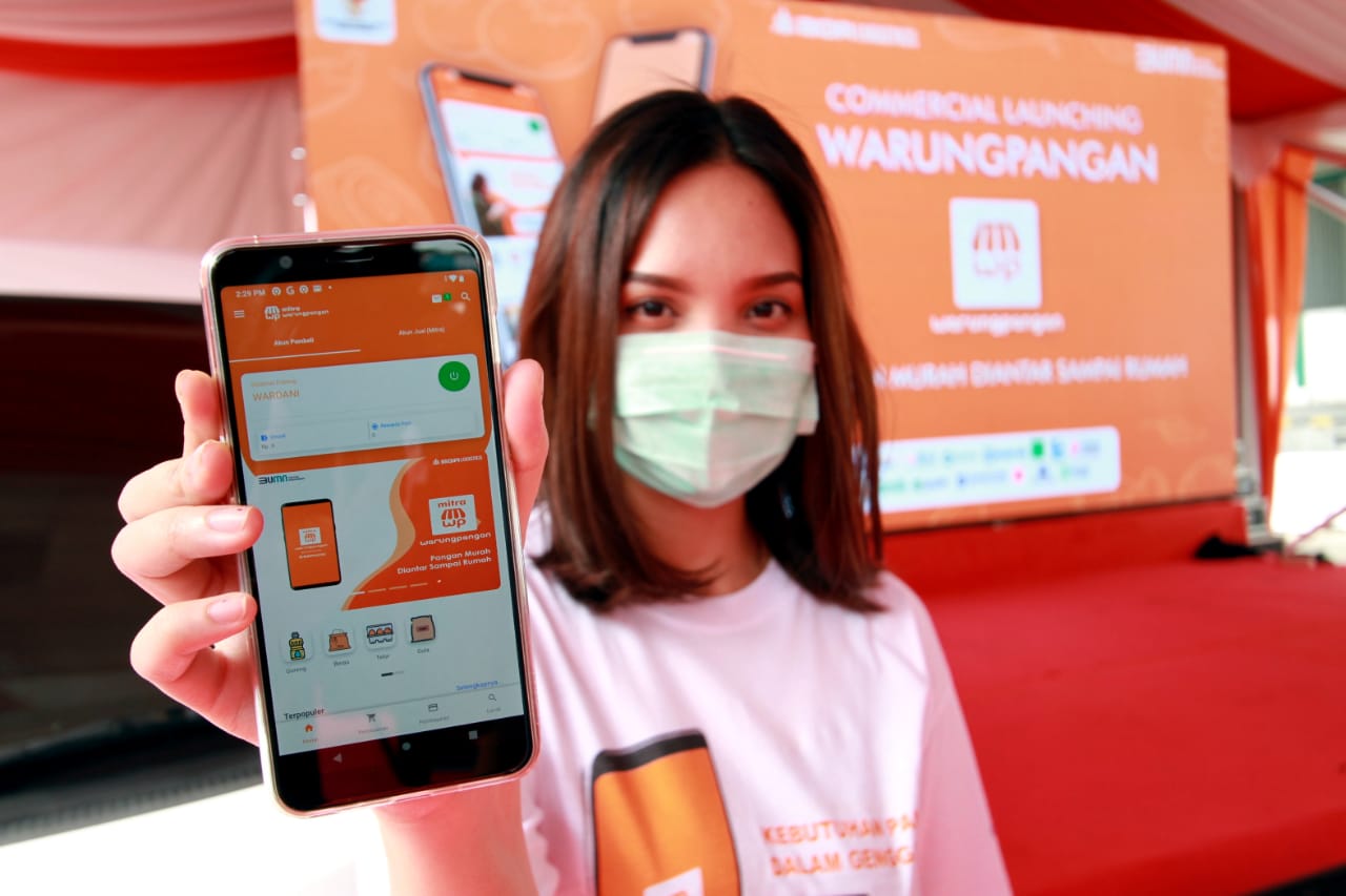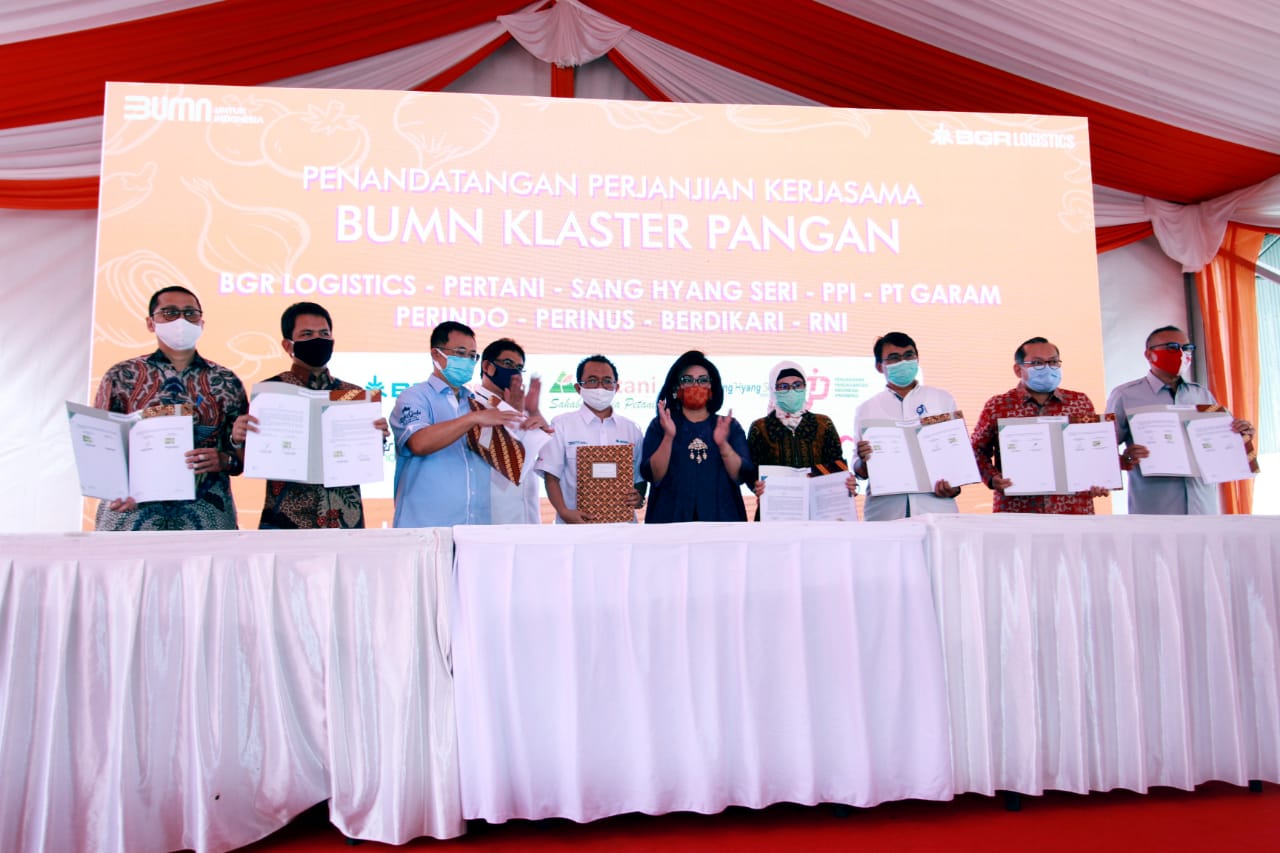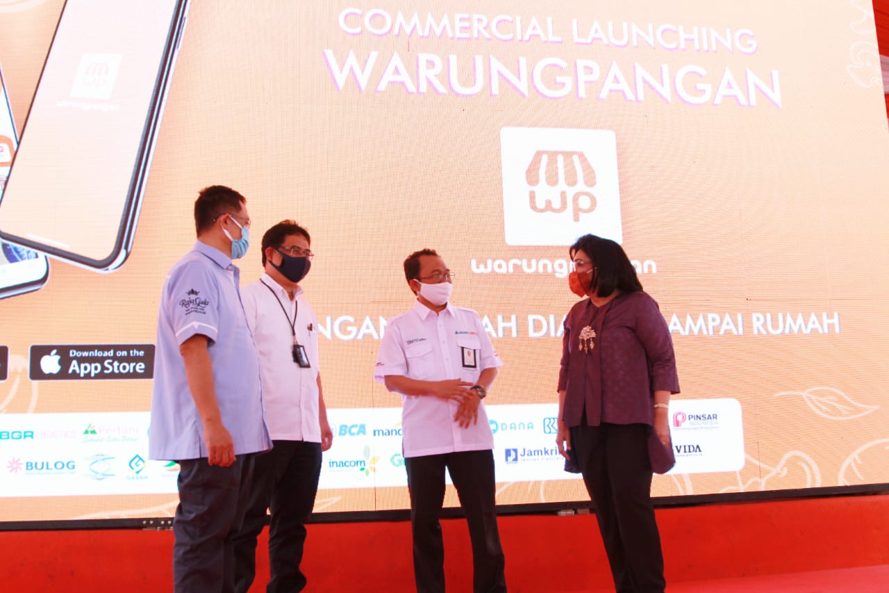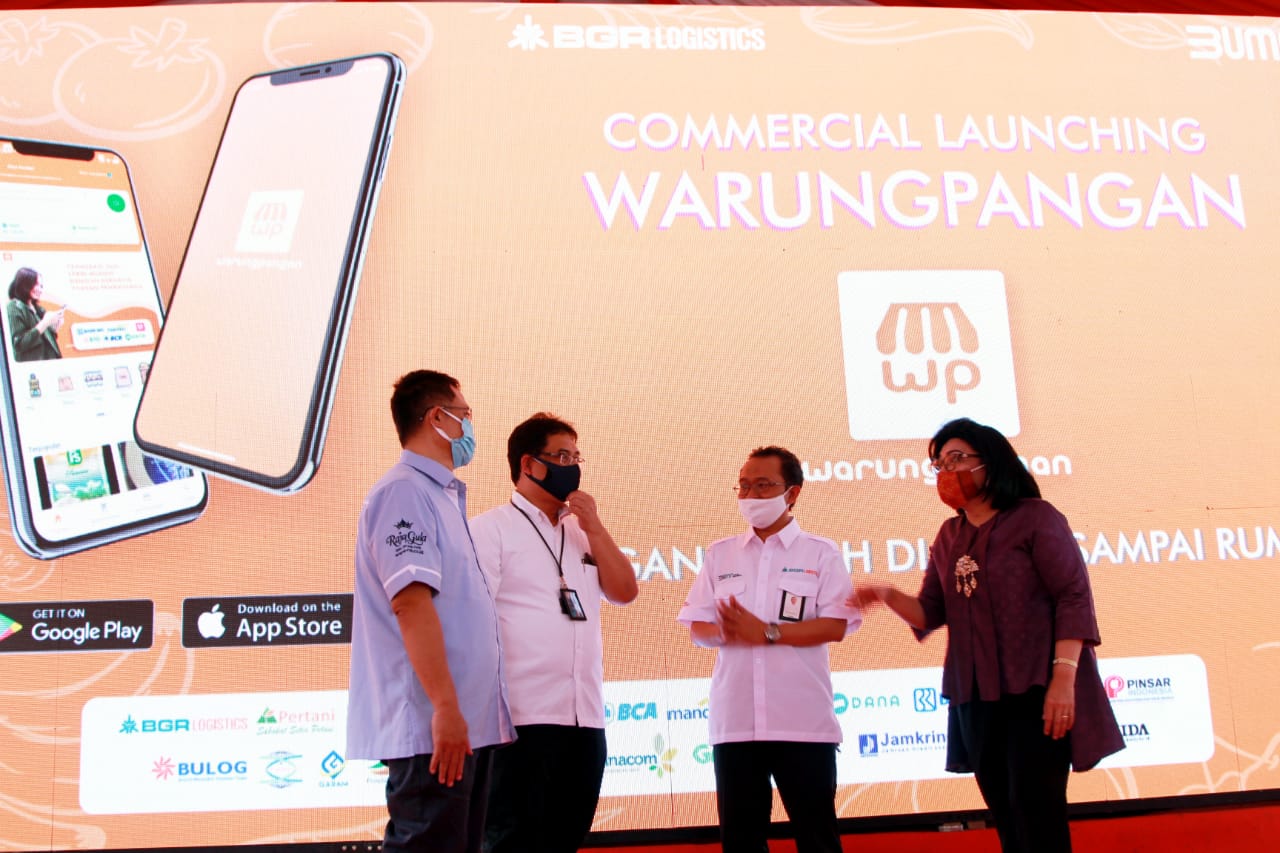 (Dari kiri) Direktur Utama PT Rajawali Nusantara Indonesia, Eko Taufik Wibowo, Asisten Deputi Bidang Pupuk & Pangan Kementerian BUMN Imam Paryanto, Dirut BGR Logistic, M Kuncoro Wibowo, dan Deputi Bidang Produksi & Pemasaran Kementerian Koperasi & UKM, Victoria Simanungkalit berbincang usai meluncurkan aplikasi Mitra Warung Pangan dan aplikasi wWarung Pangan di jakarta, Rabu (12/8/2020). Untuk membantu pengembangan usaha warung tradisional BGR Logistics mengembangkan Aplikasi Mitra Warung Pangan berbasi Android dan Ios yang diperuntukkan bagi pemilik warung untuk membeli stok bahan pangan dari BUMN Pangan berupa bahan sembako, seperti beras, minyak, dan gula, dengan mudah dan bebas biaya pengiriman. Sementara itu aplikasi Warung Pangan diperuntukan bagi masyarakat yang akan berbelanja di Mitra Warung Pangan.