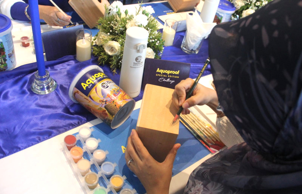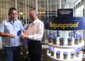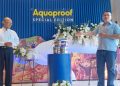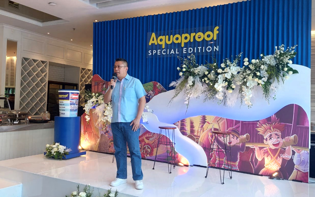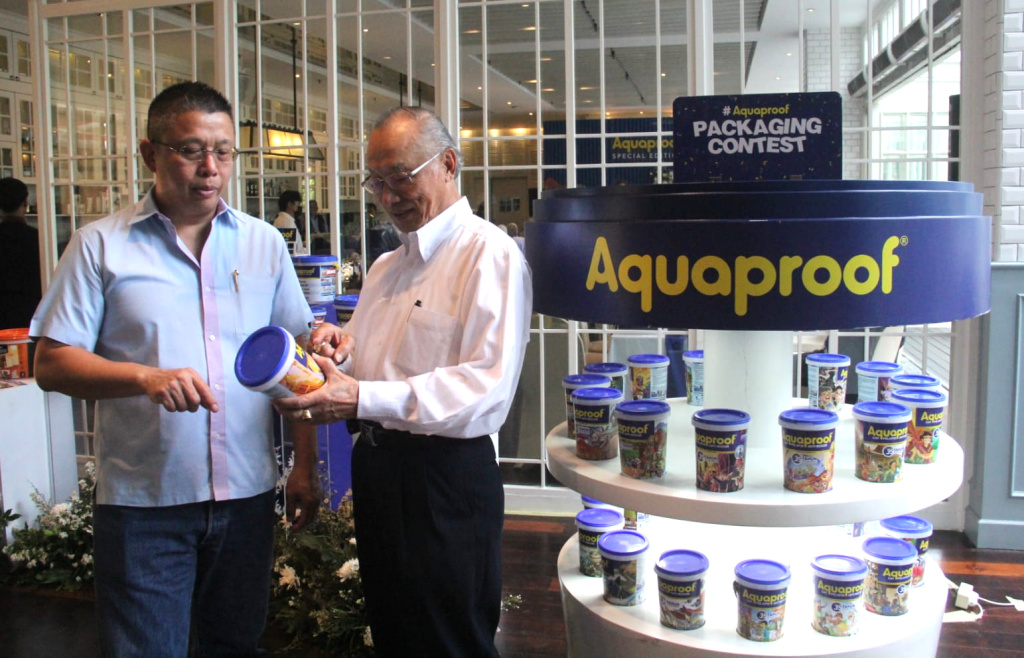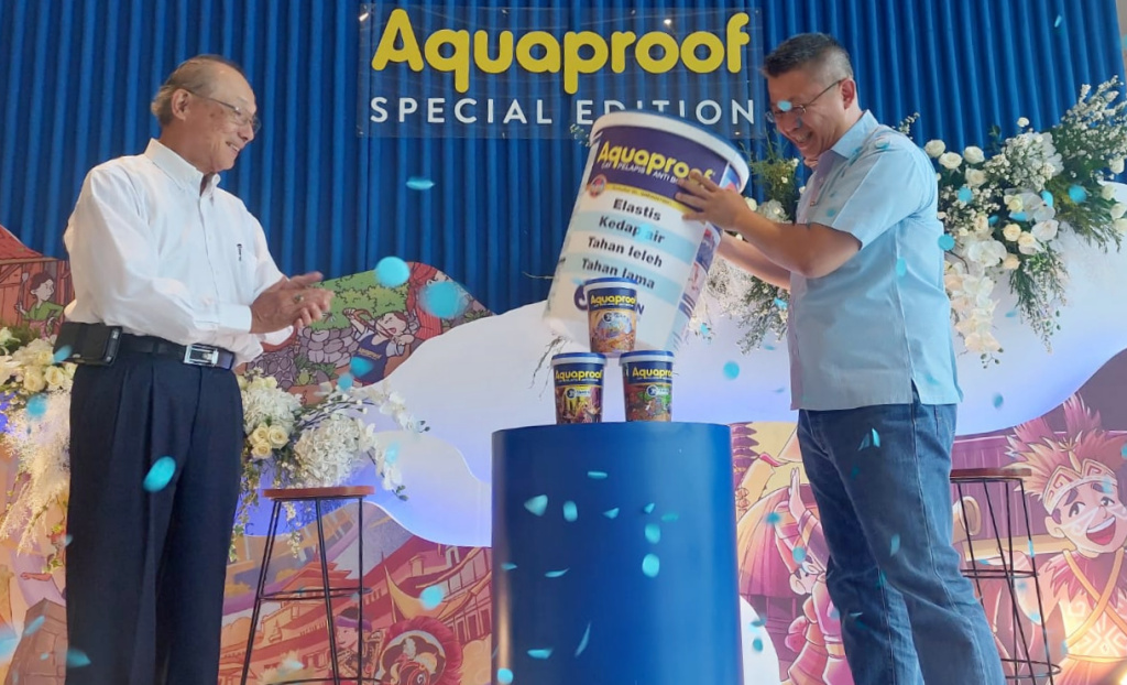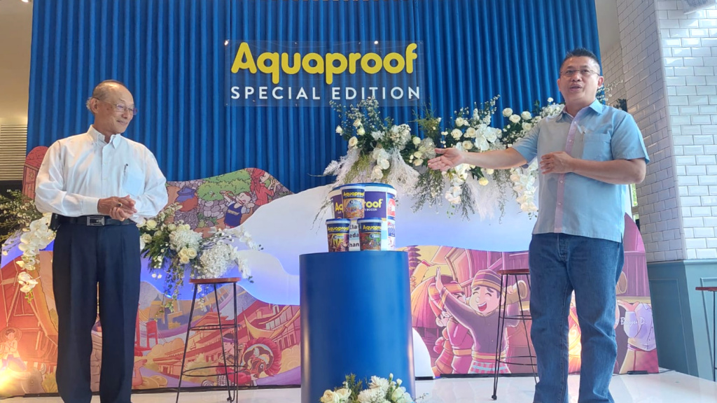 GM Commerce PT Adhi Cakra Utama Mulia (Aquaproof) Antony Kostka (kiri) berbincang dengan Founder Aquaproof Herman Moeliana (kanan) saat acara peluncuran Aquaproof Special Edition di Jakarta, Ahad (13/8/2023). Aquaproof sebagai pelopor cat pelapis anti bocor di usianya yang lebih dari 35 tahun meluncurkan tiga design packaging menarik hasil dari Aquaproof Packaging Contest dengan tema “Rumah & Budaya Indonesia”.