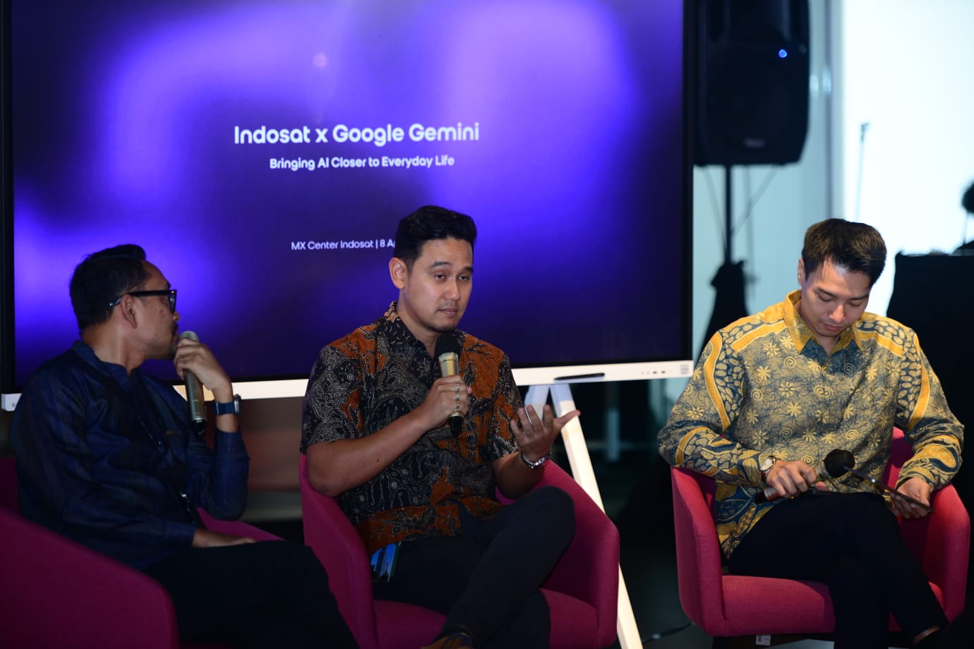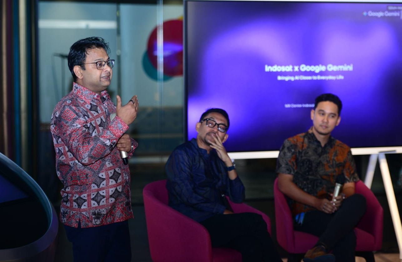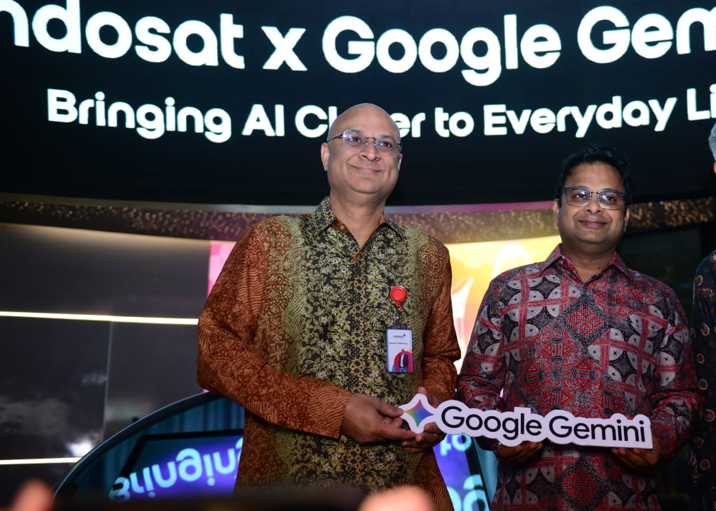 Dari kiri : Apoorva Mehrotra Chief Growth Officer Indosat bersama Dheeraj Kumar EVP-Head of Mass Market Growth Indosat Platforms & Devices Partnerships, APAC Google saat acara peluncuran Bundling Indosat dan Google Gemini yang berlangsung di Jakarta, Kamis (8/4). Pelanggan IM3 dan Tri kini bisa menikmati akses Google Gemini lewat bundling paket data di aplikasi myIM3 dan BIMA+.
