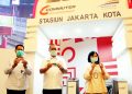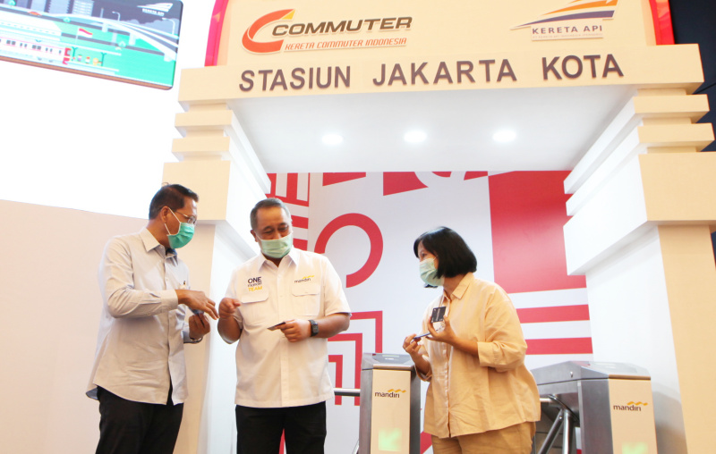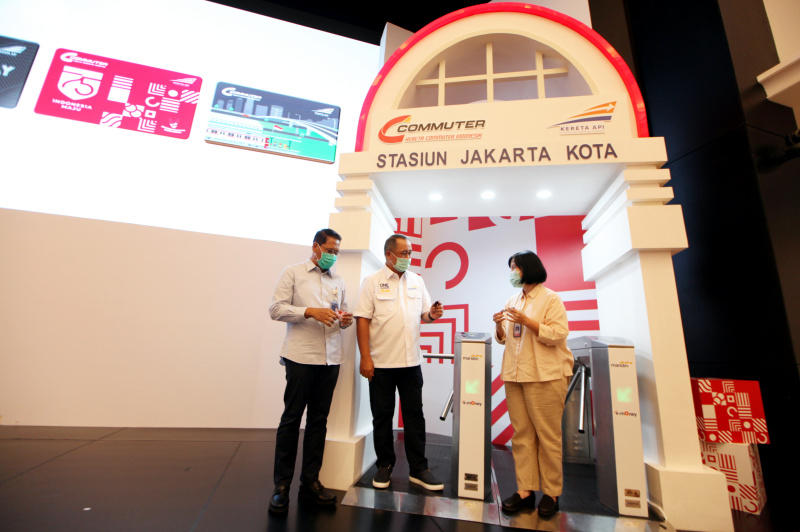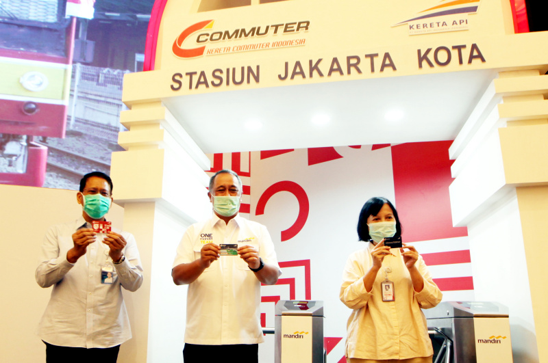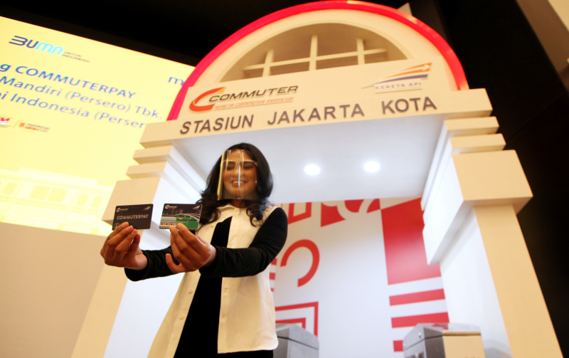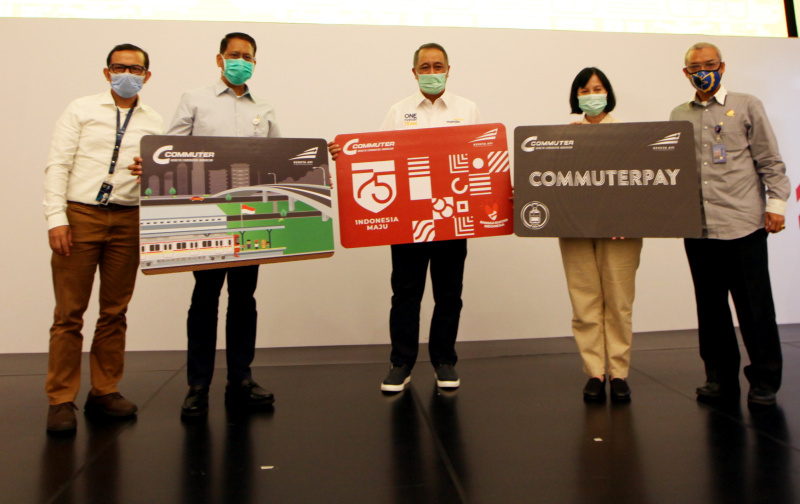 (kika) Asdep Bidang Sarana dan Prasarana Perhubungan Kementerian BUMN Priyatmo Hadi, Dirut Kereta Api Indonesia (KAI) Didiek Hartantyo, Dirut Bank Mandiri Royke Tumilaar, Dirut Kereta Commuter Indonesia (KCI) Wiwik Widayanti dan Staf Ahli Menteri Perhubungan Bidang Logistik, Multimoda dan Keselamatan Cris Kuntadi saat meresmikan peluncuran kartu Co Branding Commuter Pay di Jakarta, Selasa (18/8). Kartu prabayar hasil kolaborasi PT. KAI dan Bank Mandiri ini akan memudahkan masyarakat karena cukup menggunakan 1 kartu untuk pembayaran di semua moda transportasi dan belanja. Kartu yang dapat diperoleh di loket-loket stasiun kereta Commuterline mulai Oktober 2020 ini. Foto/ Rizki Meirino