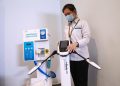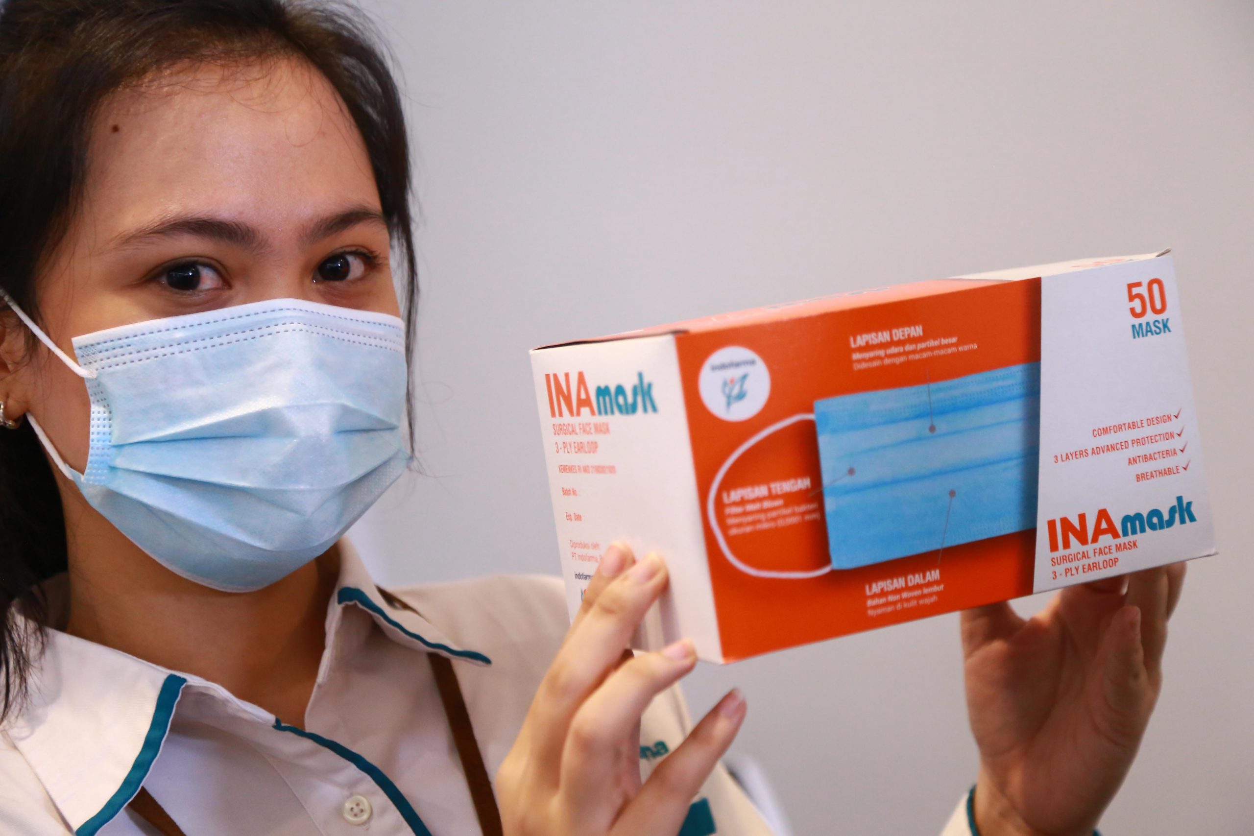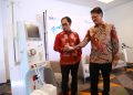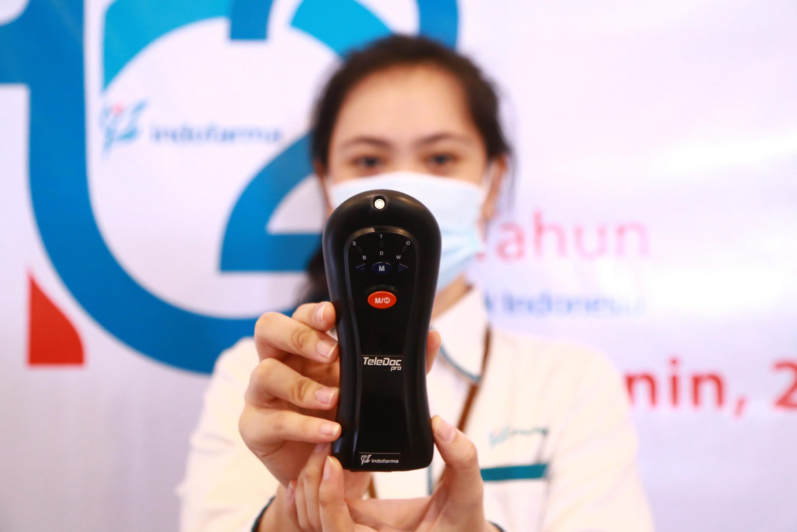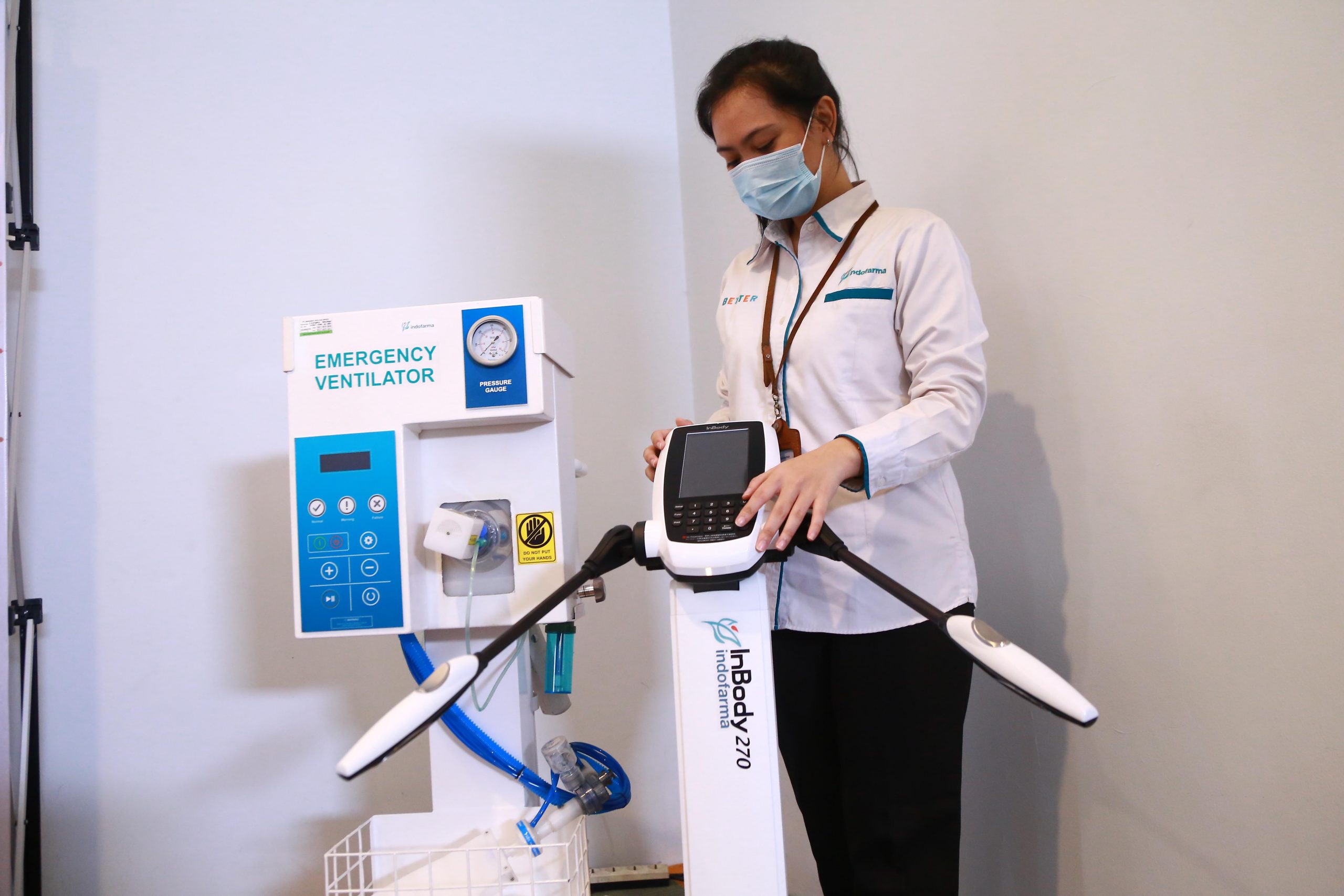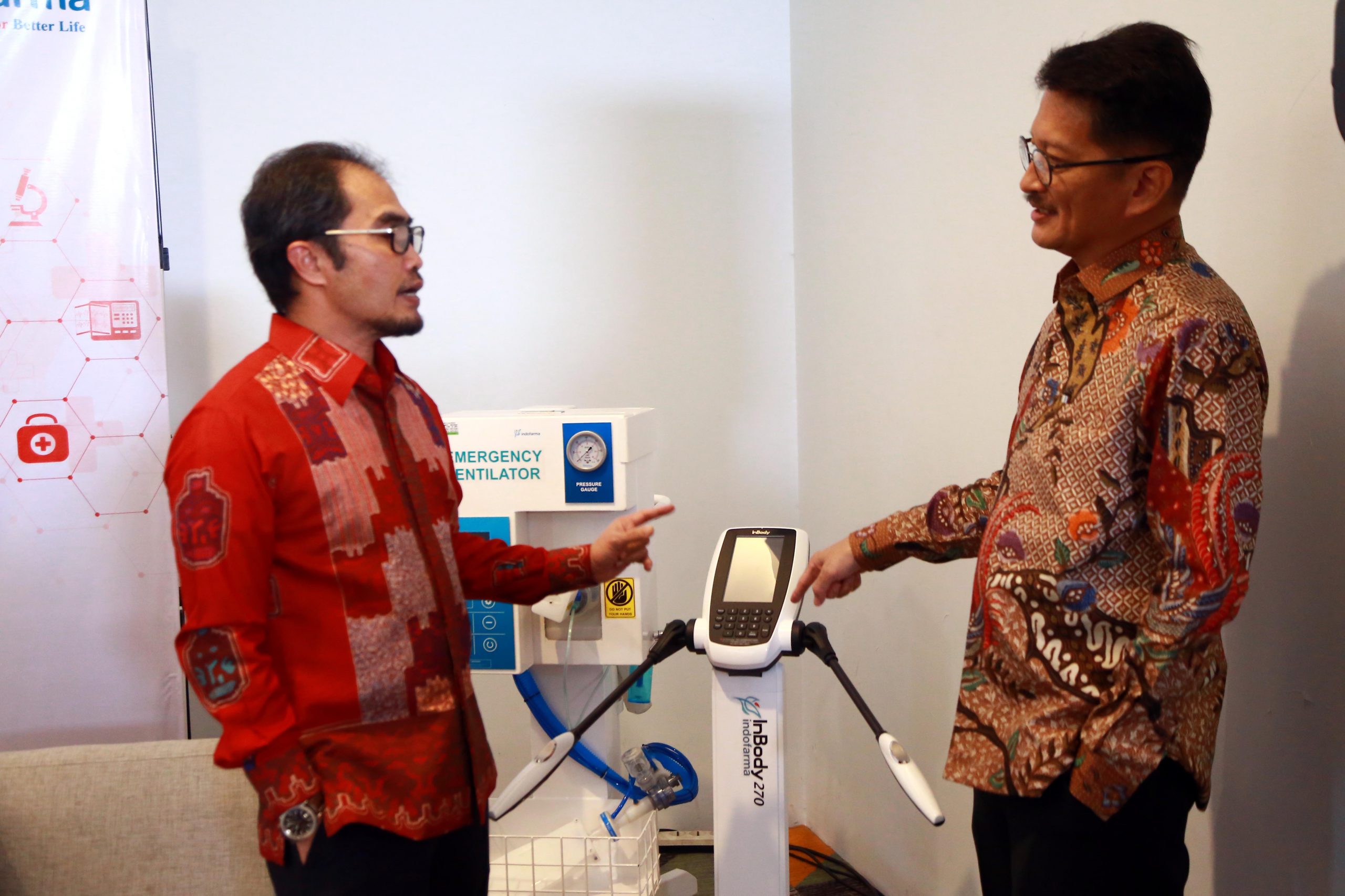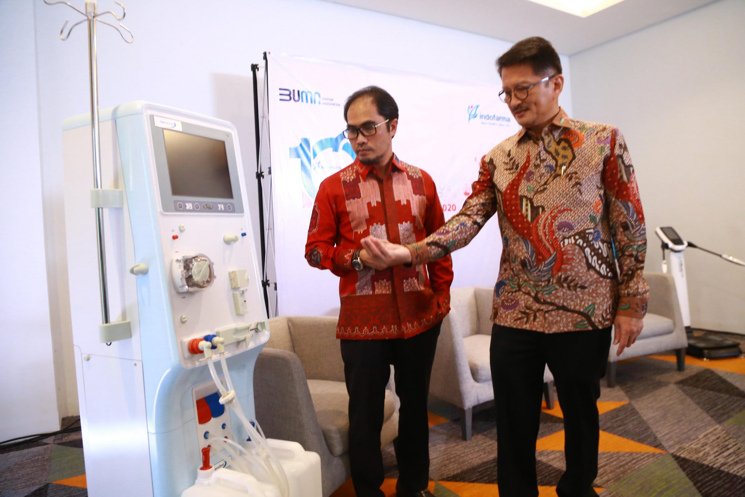 Dirut PT Indofarma Tbk, Arief Pramuhanto (kanan) dan Dirut PT Bio Farma, Honesty Basyir berbincang disela peluncuran produk dan webinar dalam rangka Hari jadi ke 102 Indofarma di Jakarta, Senin (27/7). Pada kesempatan itu diluncurkan enam produk baru alat kesehatan; masker INA Mask, hand sanitizer CLIND, alat pemeriksaan kesehatan mandiri Teledoc, emergency ventilator INAVENT, alat untuk mengukur komposisi tubuh Indofarma InBody Test, serta mesin untuk cuci darah (hemodialisa) Hemodind.