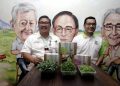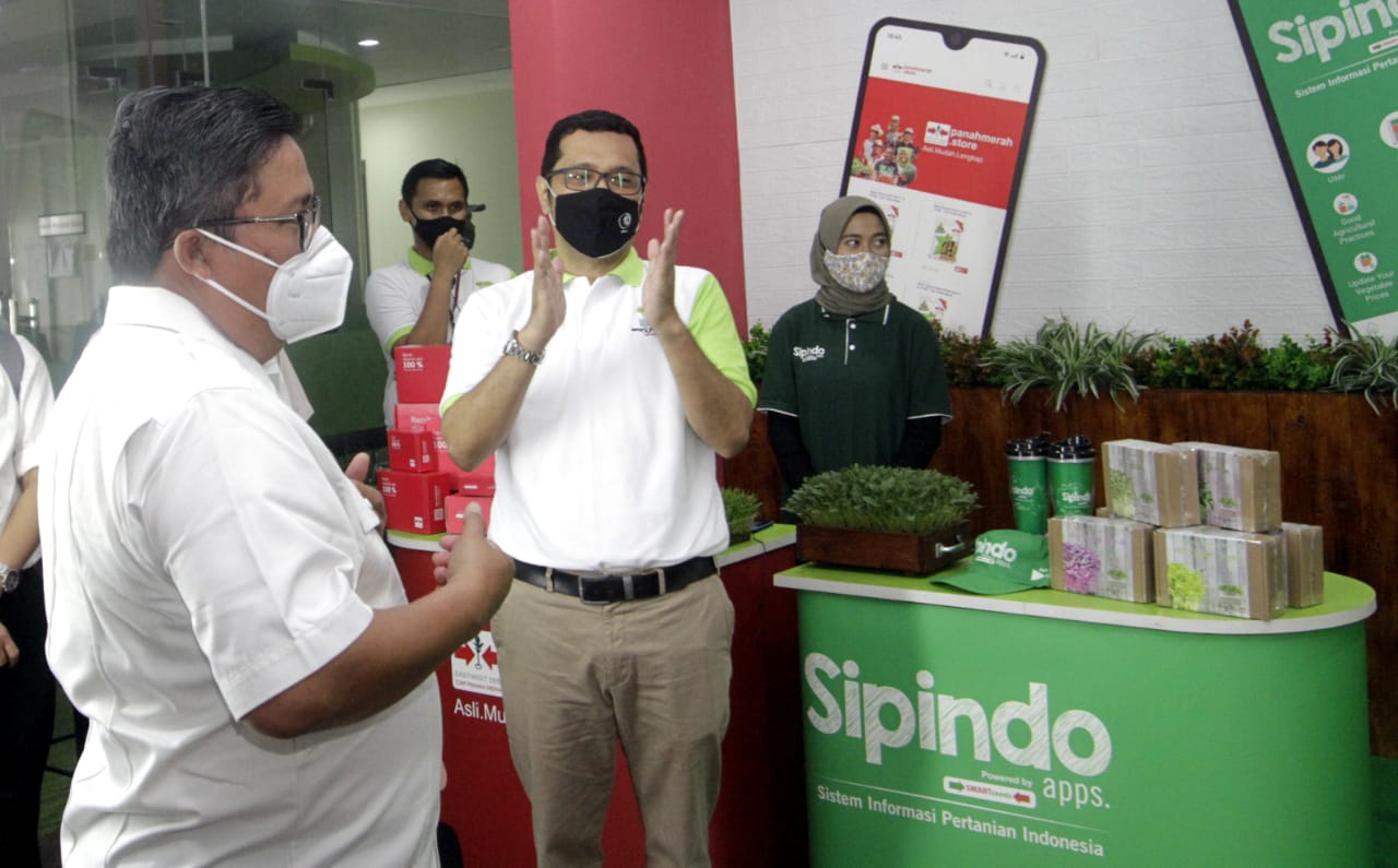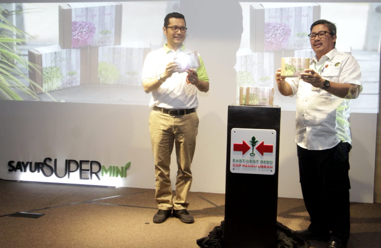 Direktur Jenderal Hortikultura Kementerian Pertanian RI Prihasto Setyanto (kanan) bersama Managing Director PT East West Seed Indonesia (Ewindo) Glenn Pardede berbincang di sela peluncuran produk Microgreens Kit “SAYURSUPERMINI” di Purwakarta, Jawa Barat, Rabu, (21/10). Ewindo meluncurkan Microgreens Kit SAYURSUPERMINI untuk mendorong peningkatan konsumsi sayuran yang masih rendah hanya 180 gram per kapita dari standar FAO 400 gram per kapita sekaligus sebagai bentuk dukungan terhadap tren bercocok tanam yang tengah berkembang di masyarakat selama pandemi Covid-19 karena memiliki banyak keunggulan seperti waktu panen lebih cepat yakni 9 – 14 hari dan kandungan nutrisi 9 kali lebih tinggi dari sayuran dewasa.