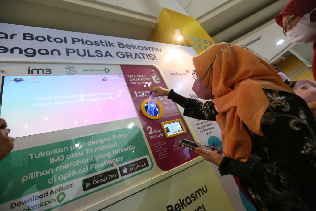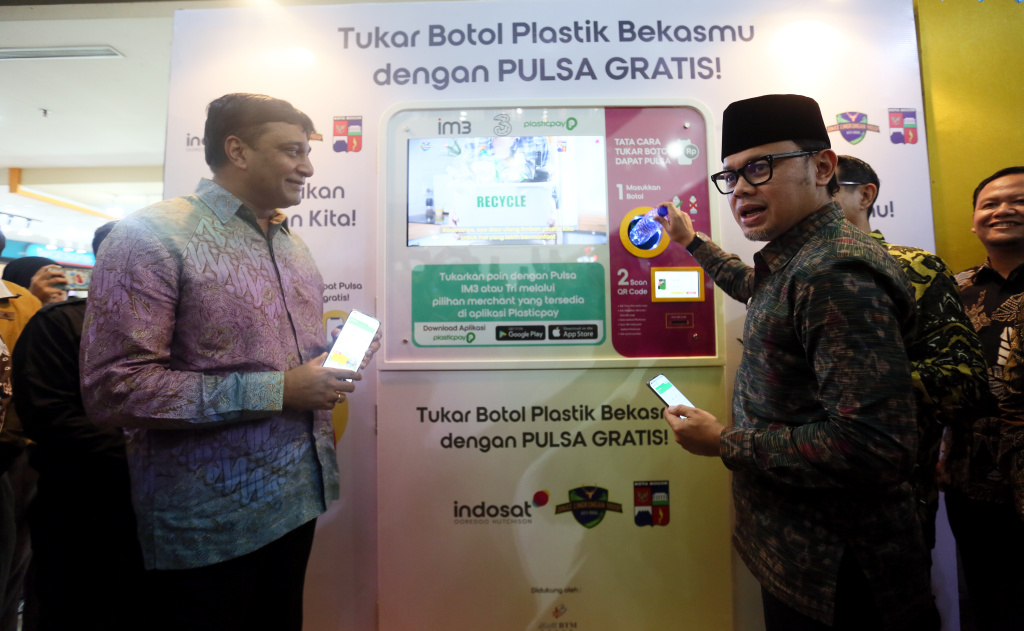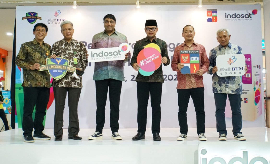 President Director & CEO Indosat Ooredoo Hutchison, Vikram Sinha (tiga dari kiri), Director & Chief Regulatory Officer Indosat Ooredoo Hutchison, M.Buldansyah (kanan), Wali Kota Pemerintah Kota Bogor, Bima Arya (tiga dari kanan), Fungsional Ahli Madya Pengendali Dampak Lingkungan KLHK RI, Teddy Mahendra (dua dari kiri), Kepala Dinas Lingkungan Hidup Kota Bogor, Deni Wismanto (kiri), dan Direktur Bogor Trade Mall, Samuel Koshan (dua dari kanan) pada saat berfoto bersama saat peluncuran program Sampah Jadi Pulsa di Bogor (24/6). Indosat Ooredoo Hutchison (IOH) berkolaborasi dengan Pemerintah Kota Bogor, Dinas Lingkungan Hidup Kota Bogor, dan Mall BTM Bogor yang berbagi misi bersama dalam melestarikan lingkungan secara berkelanjutan menggunakan solusi teknologi inovatif, melalui peluncuran Program Sampah Jadi Pulsa. Masyarakat bisa menukarkan botol plastik bekas dengan pulsa IM3 maupun Tri melalui Reverse Vending Machine (RVM) Plasticpay yang ditempatkan di Mall BTM Bogor.