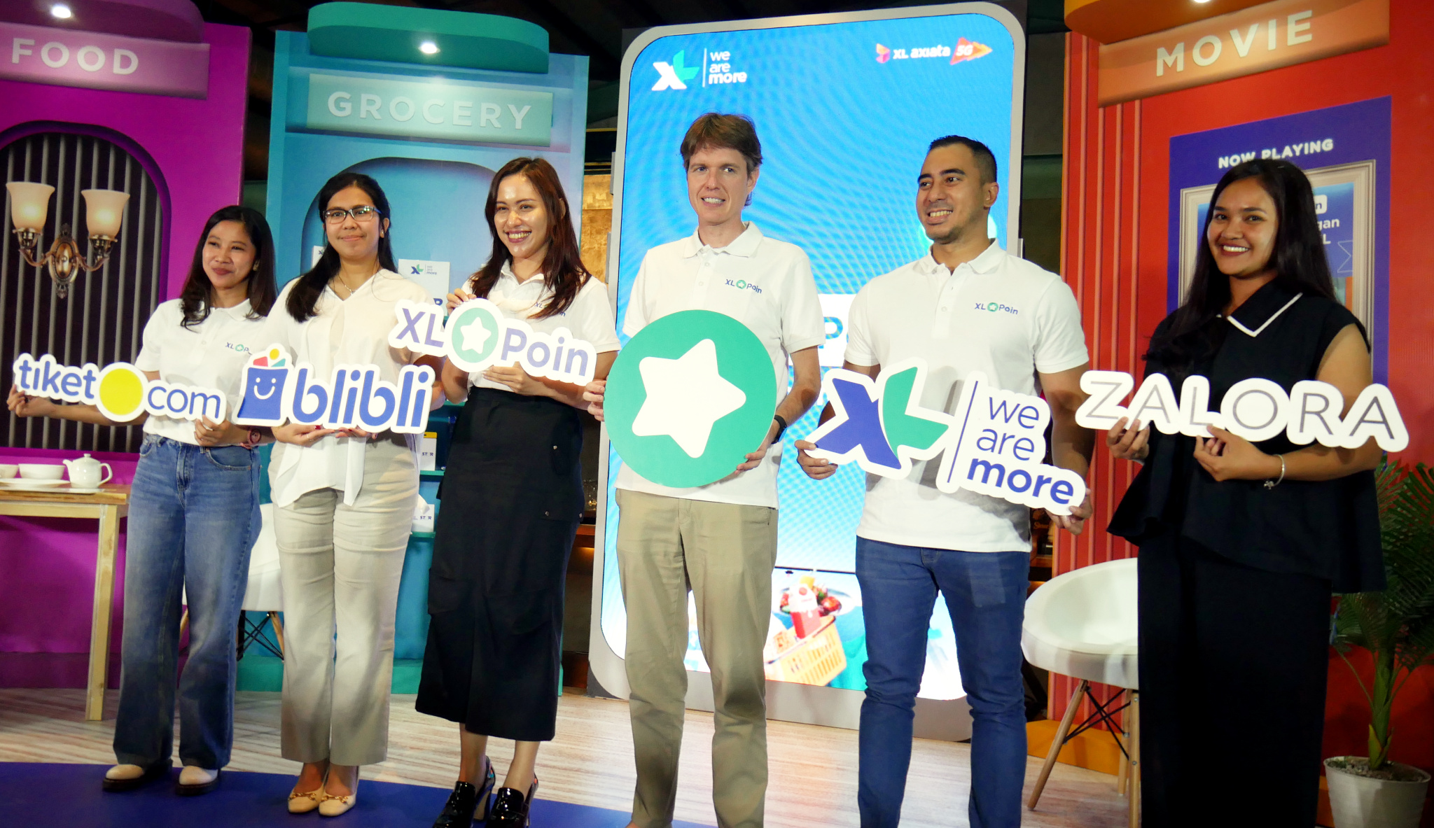 Head Consumer Proposition XL Axiata, Sri Sofyana Sugiarmadji, VP Partnership Blibli, Florence Ariani, Group Head Mass Segment XL Axiata, Lyra Filiola, Direktur & Chief Commercial Officer – Commerce XL Axiata, David Arcelus Oses, Group Head Corporate Communication XL Axiata, Reza Mirza dan Partnership Manager Zalora, Claudia Rosalia dalam acara peluncuran program XL Poin di Jakarta, Rabu (24/1). Setiap pelanggan XL Prabayar yang melakukan transaksi baik melalui aplikasi myXL maupun saluran penjualan lainnya, secara otomatis akan mendapatkan poin. Tersedia benefit dan reward yang dapat dipilih pelanggan sesuai dengan poin yang ditukarkan, antara lain kuota internet, perpanjangan masa aktif dan pilihan voucher diskon di tempat belanja favorit hingga perjalanan liburan, seperti tiket.com, Blibli dan ZALORA.