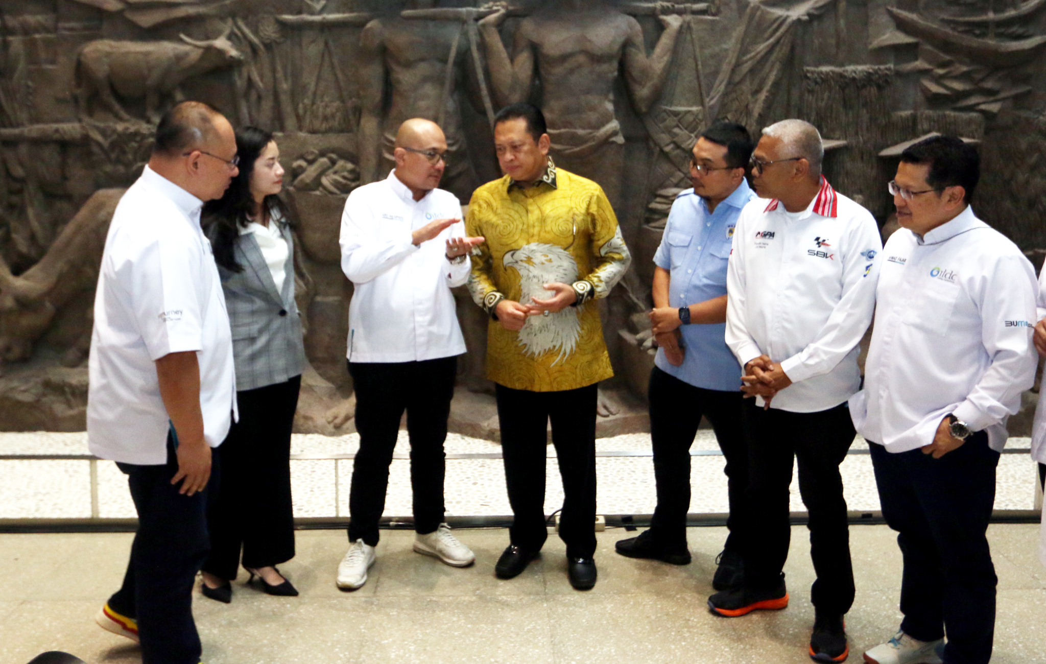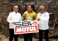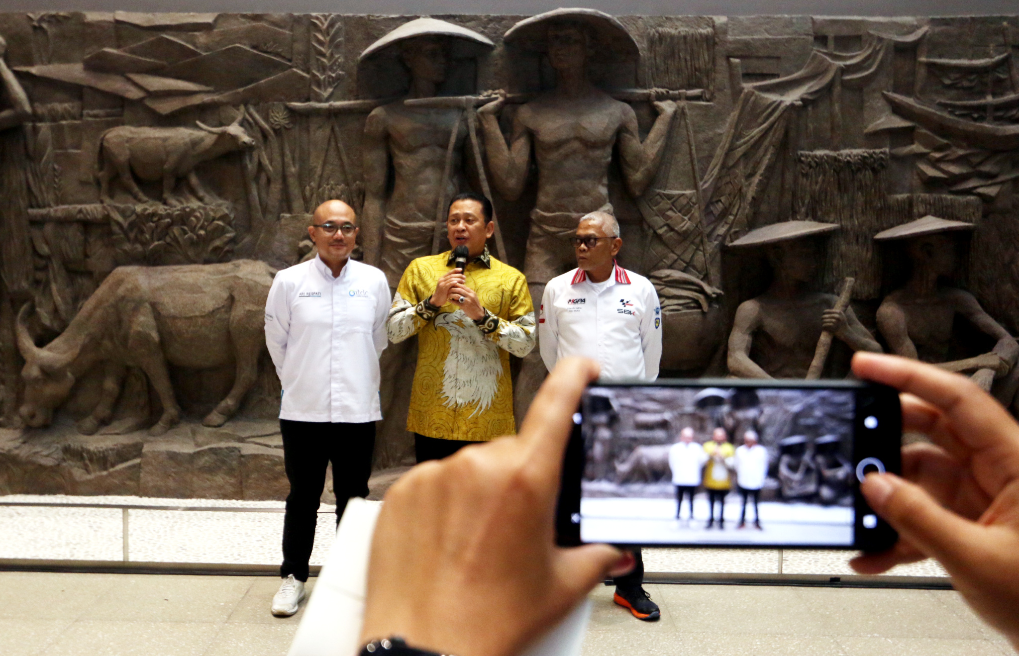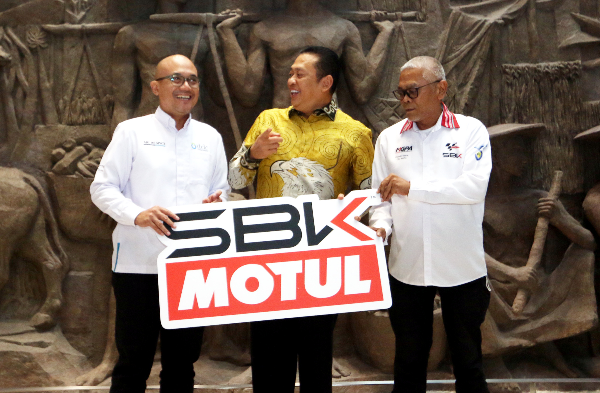 (Dari kiri ke kanan) Direktur Utama Indonesia Tourism Development Corporation/ITDC Ari Respati, Ketua Umum Ikatan Motor Indonesia/IMI Bambang Soesatyo, Waketum Olahraga Sepeda Motor IMI Sadikin Aksa, Direktur Utama MGPA Priandhi Satria, Direktur Keuangan, Strategi dan Manajemen Risiko ITDC Ahmad Fajar berfoto saat berlangsungnya peluncuran tiket presale MOTUL FILM World Superbike (WSBK) Indonesian Round 2022 di Jakarta, Rabu (31/8/2022). Penjualan tiket presale untuk menonton WSBK secara resmi dibuka mulai tanggal 31 Agustus 2022 hingga 30 hari ke depan dengan tiket tersedia dalam lima kategori yaitu General Admission, Regular Grandstand, Premium Grandstand, Premiere Class, dan Deluxe Class.