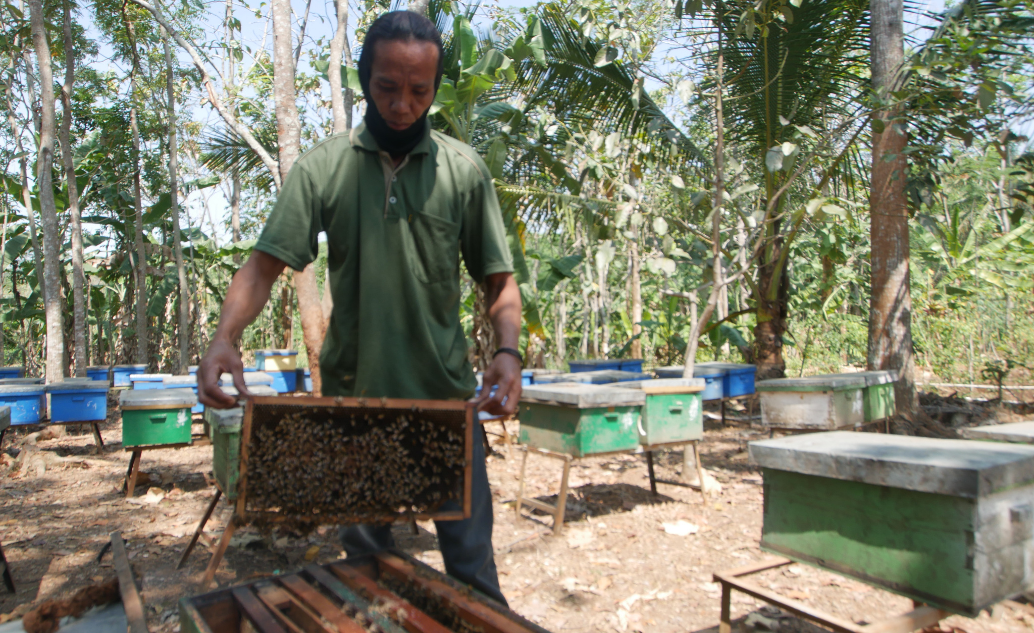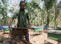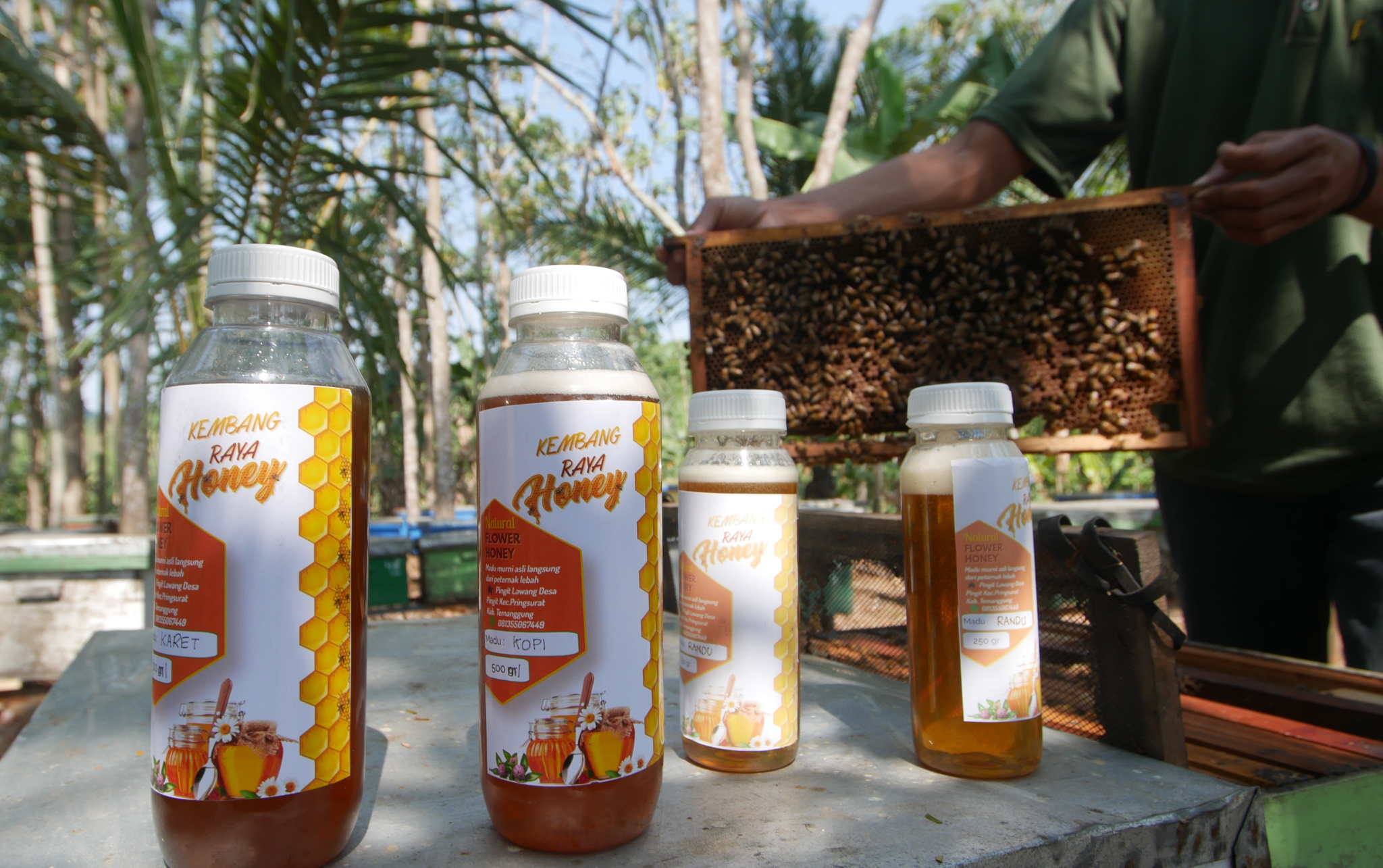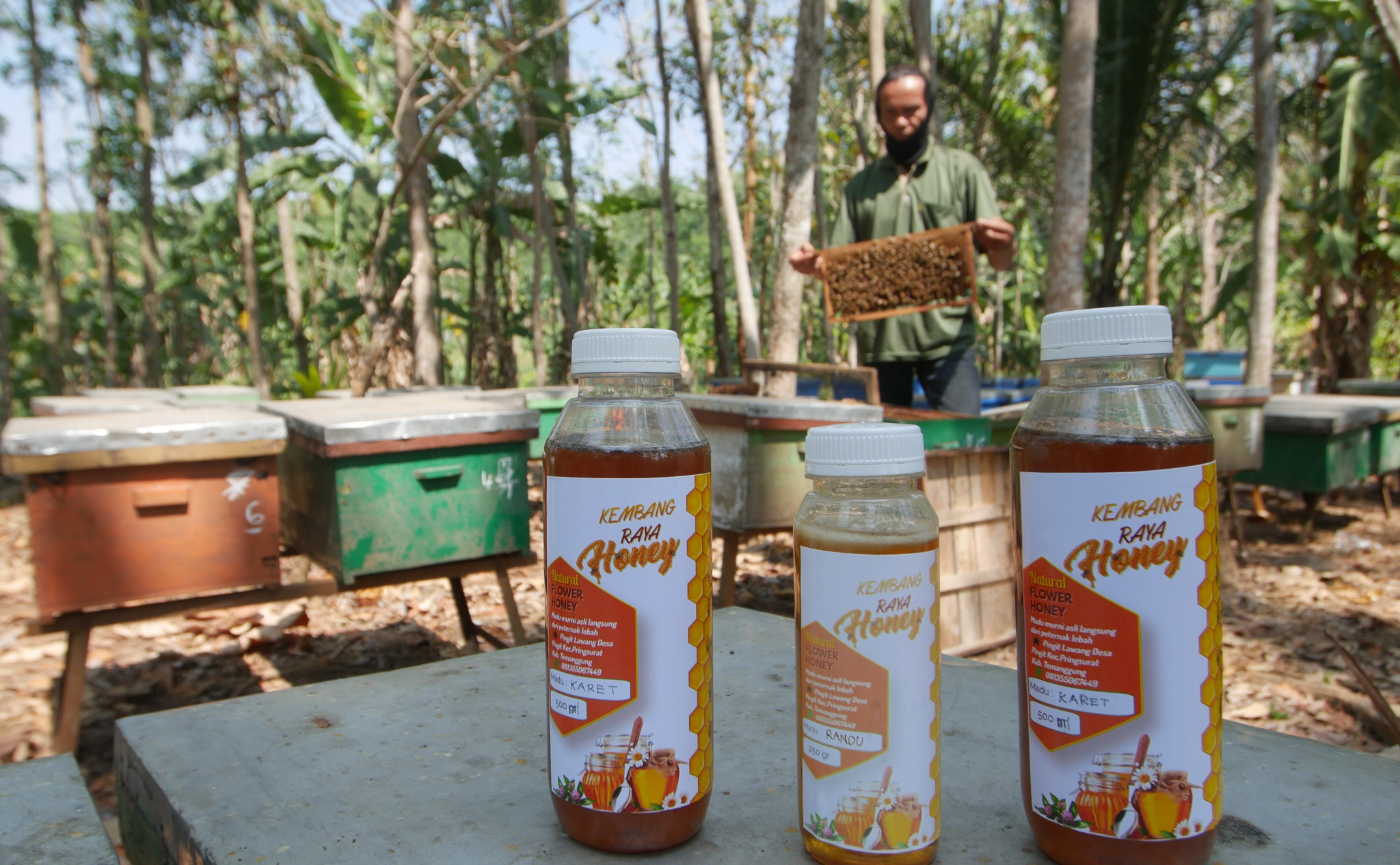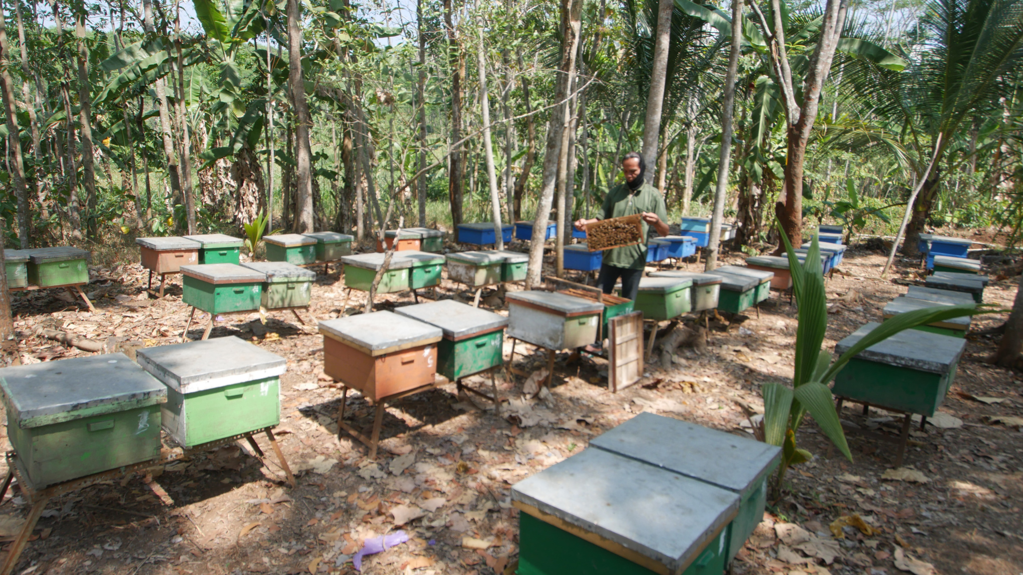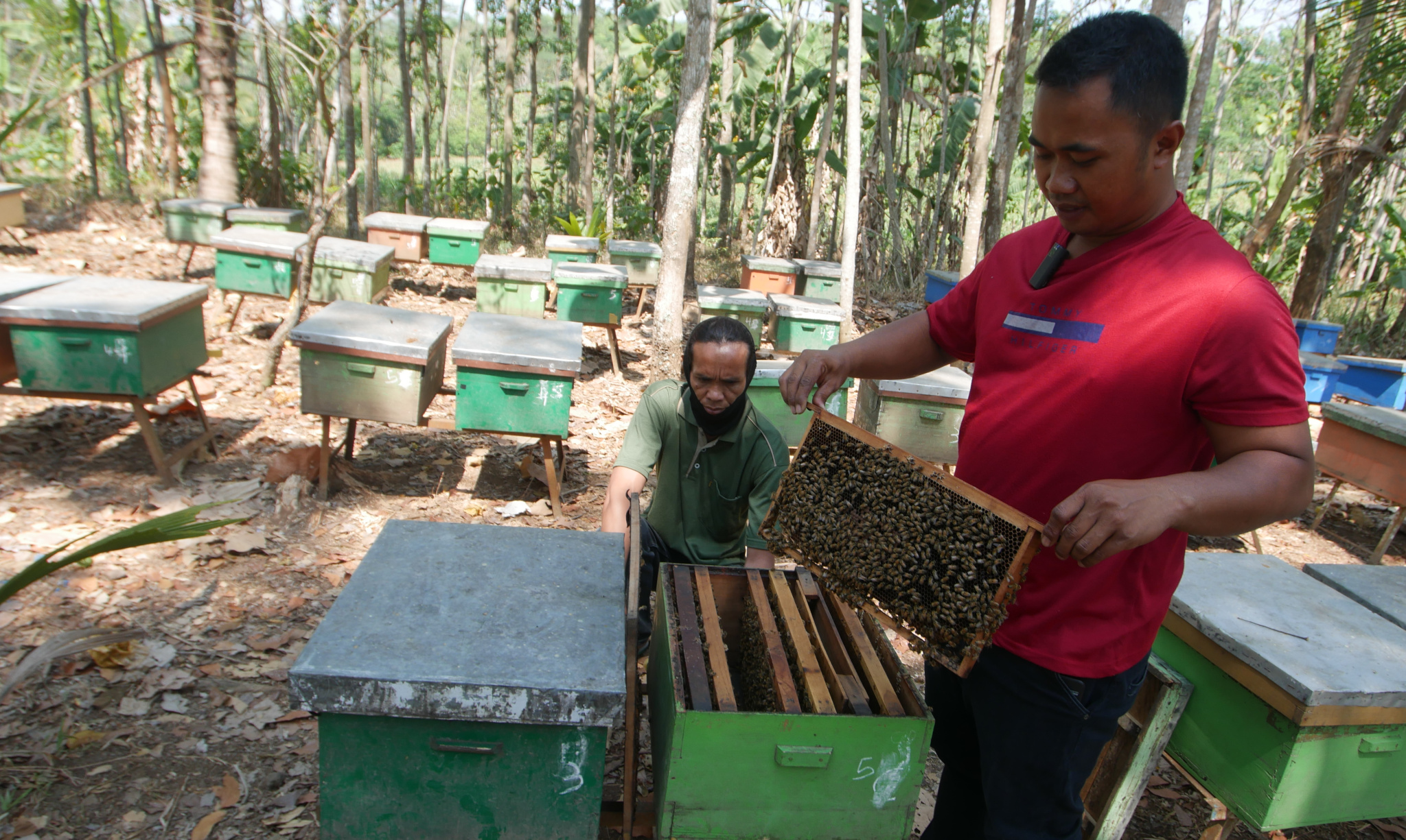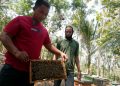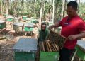 Sejumlah petani mitra binaan PT Jamkrindo yang memproduksi madu, beraktivitas di lokasi budi daya lebah di Tuntang, Kabupaten Semarang, Jawa Tengah, Selasa (29/8/2023). Mereka memanfaatkan program pemberdayaan Jamkrindo melalui pendanaan usaha mikro dan kecil,(PUMK) untuk mengembangkan skala bisnis.