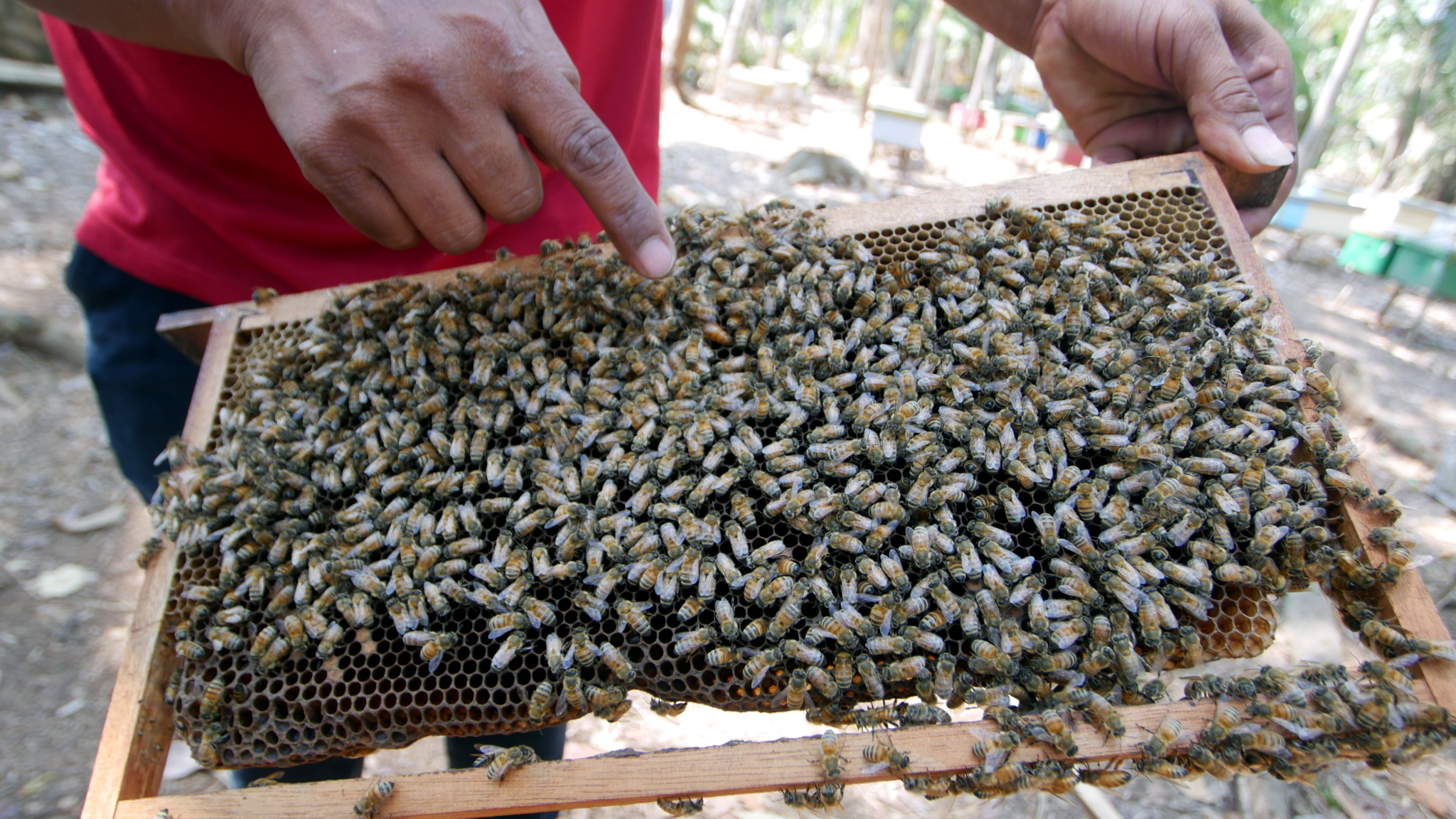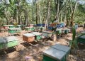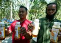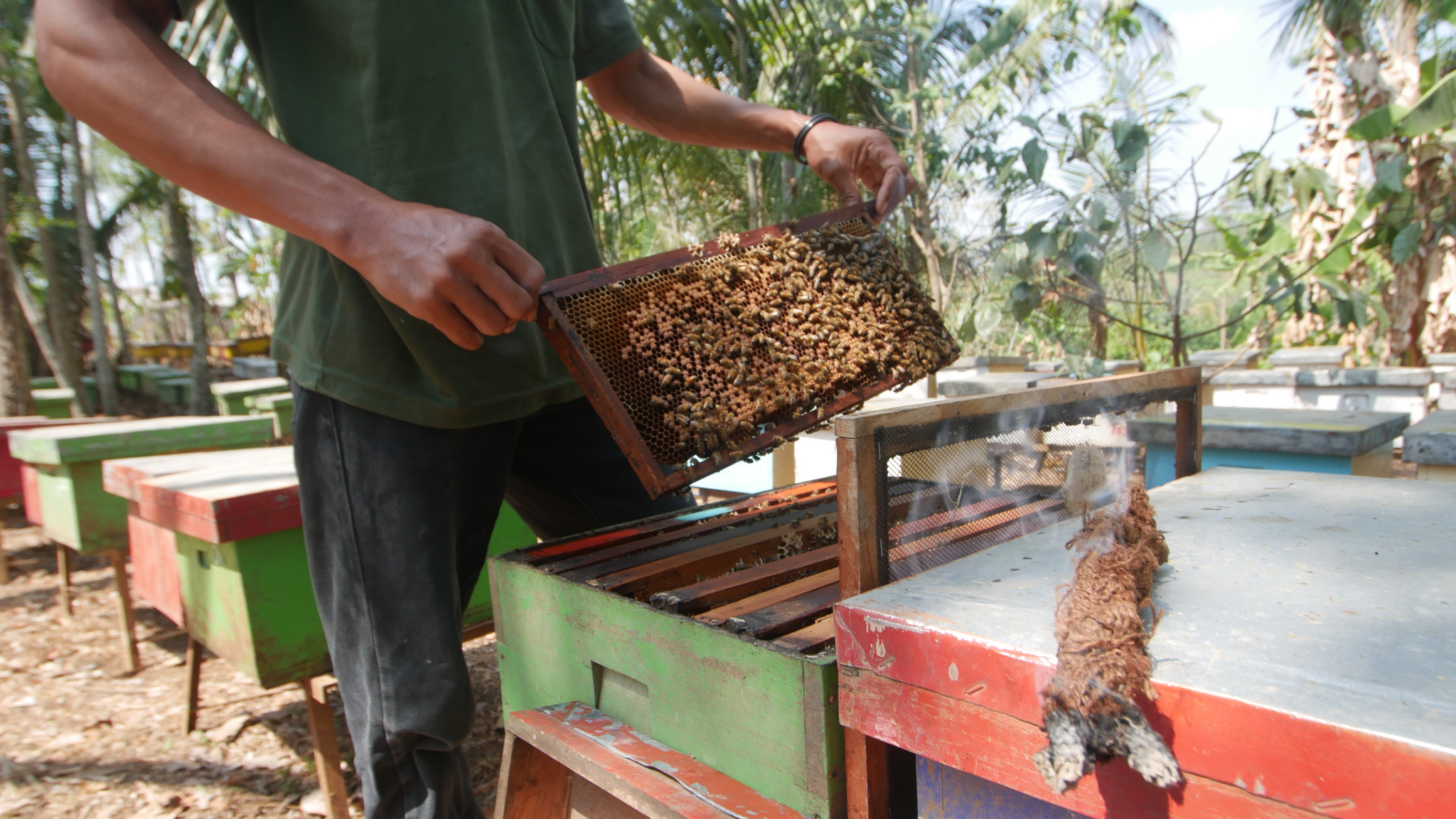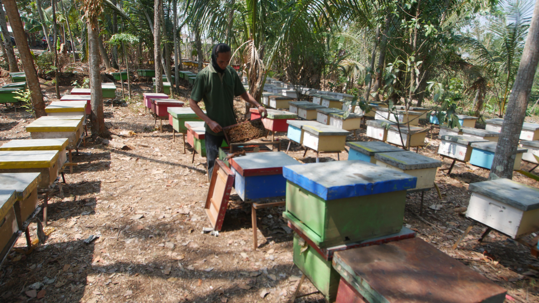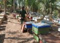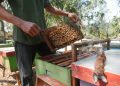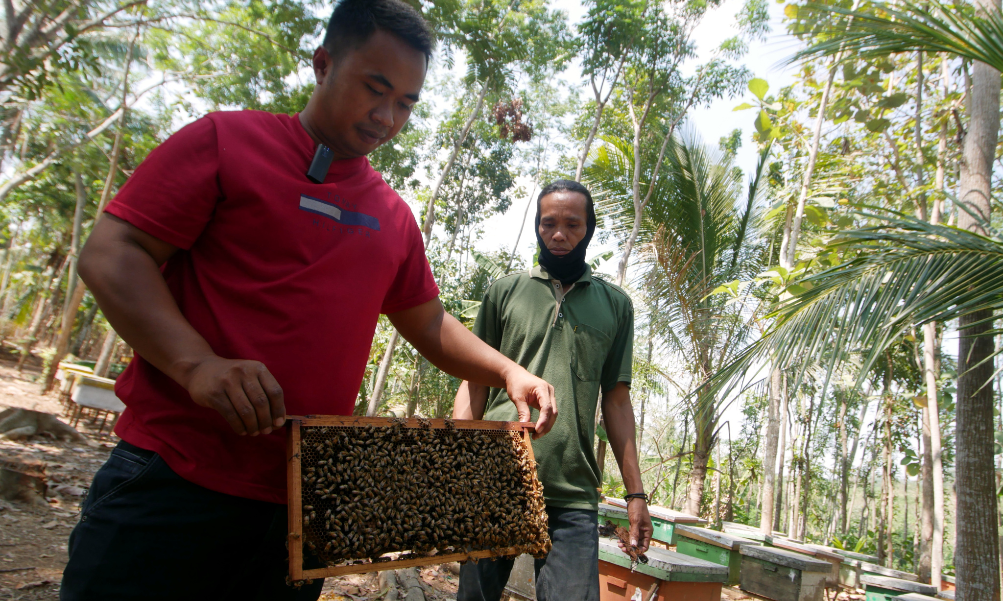 Sejumlah petani mitra binaan PT Jamkrindo yang memproduksi madu, beraktivitas di lokasi budi daya lebah di Tuntang, Kabupaten Semarang, Jawa Tengah, Selasa (29/8/2023). Mereka memanfaatkan program pemberdayaan Jamkrindo melalui pendanaan usaha mikro dan kecil,(PUMK) untuk mengembangkan skala bisnis.