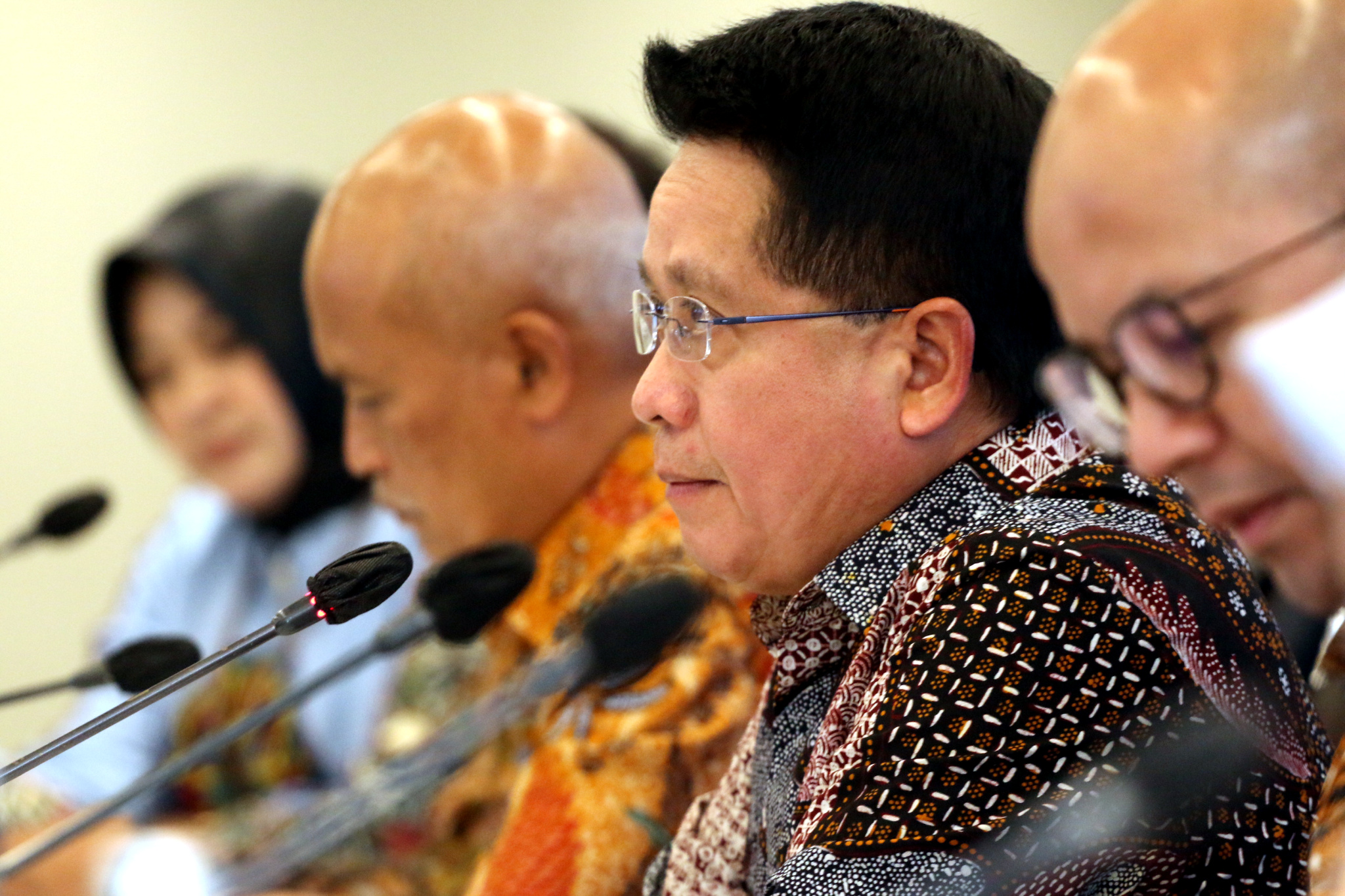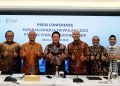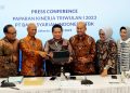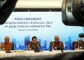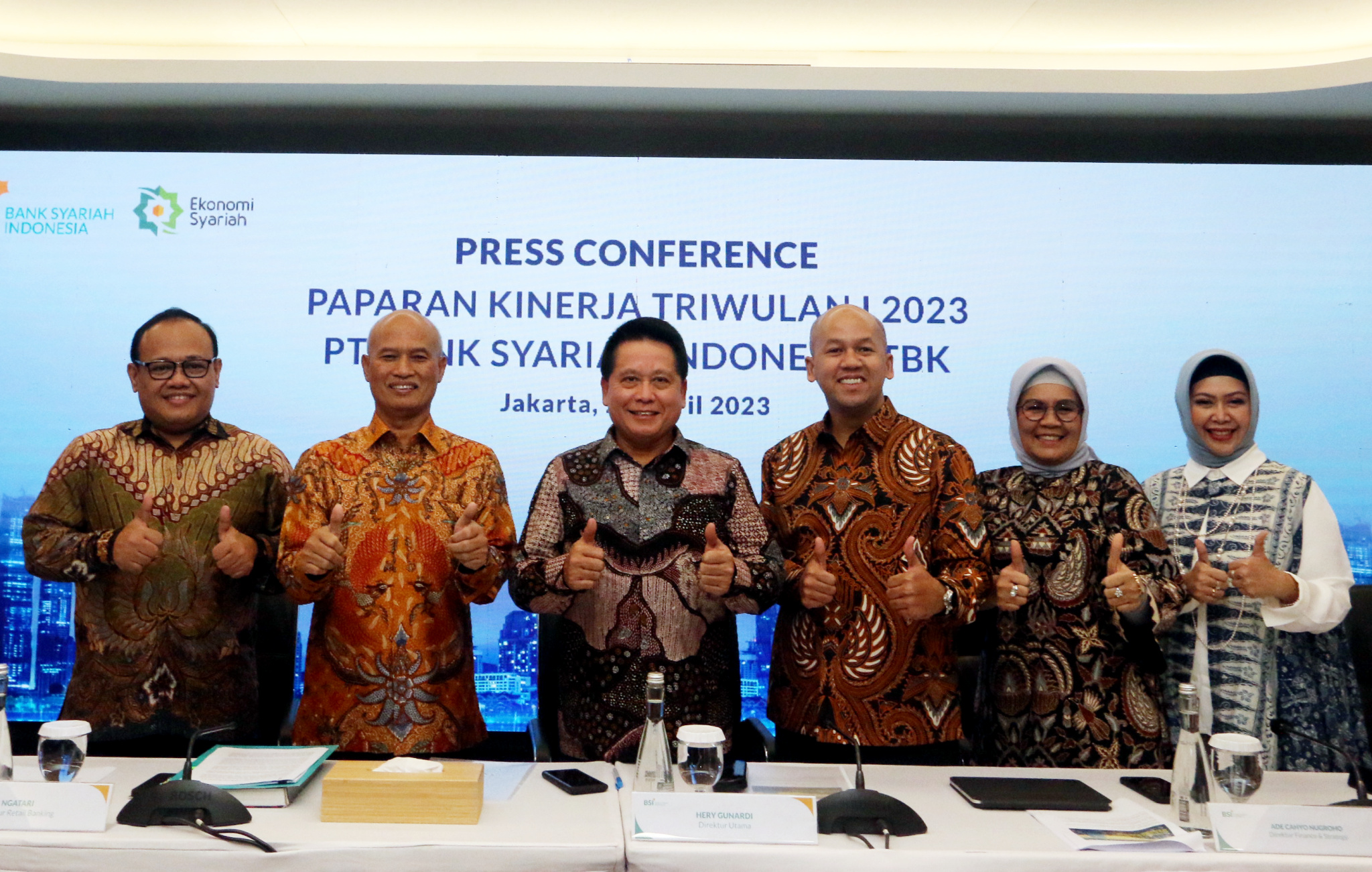 (Ki-ka) : Direktur Utama PT Bank Syariah Indonesia Tbk (BSI) Hery Gunardi (tengah) bersama dengan Direktur Information Technology BSI Achmad Syafii, Direktur Retail Banking BSI Ngatari, Direktur Finance & Strategy BSI Ade Cahyo Nugroho, Direktur Risk Management BSI Tiwul Widyastuti dan Direktur Compliance & Human Capital BSI Tribuana Tunggadewi saat paparan kinerja perseroan. Jakarta, 27 April 2023. PT Bank Syariah Indonesia Tbk (BSI) membukukan kinerja yang impresif sepanjang kuartal I/2023 dengan perolehan laba bersih mencapai Rp1,46 triliun, tumbuh dua digit 47,65% secara year on year. Kemampuan BSI memperkuat fungsi intermediasi melalui penghimpunan dana masyarakat dan penyaluran pembiayaan telah mendorong pertumbuhan positif kinerja perseroan.